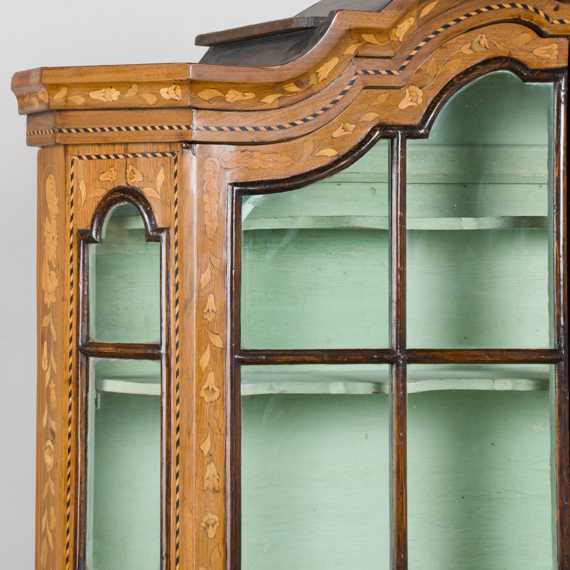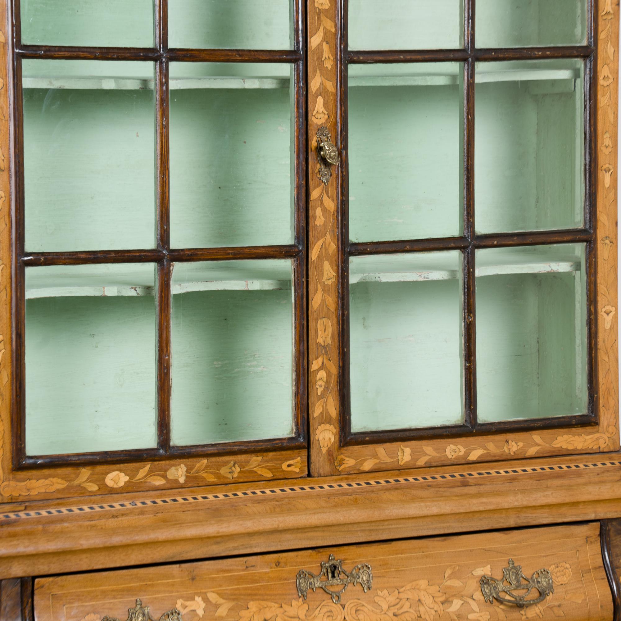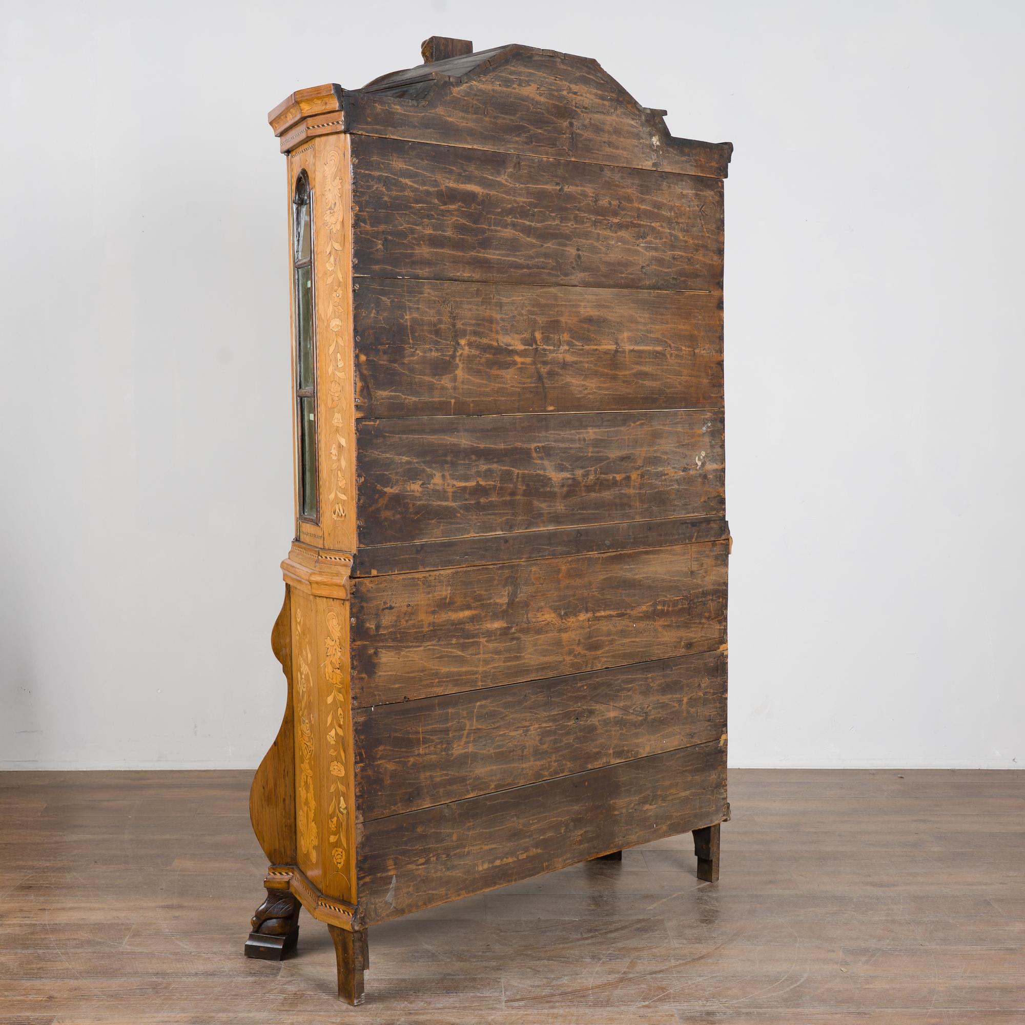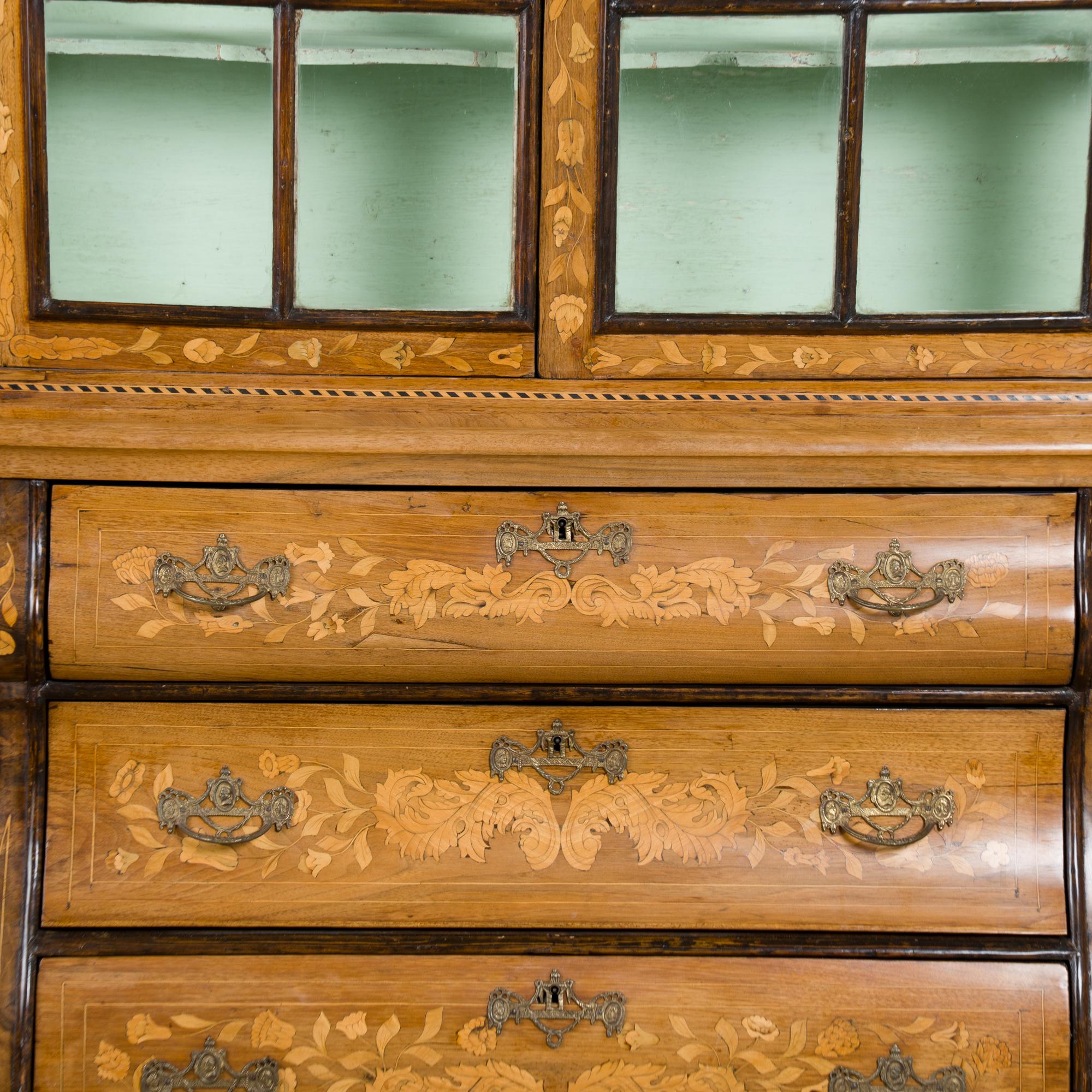 Early 19th century Dutch cabinet featuring elaborate marquetry inlay. The decoration includes flowers, vines, birds, vases, and scrolling leaves, all intricately worked across the surface.