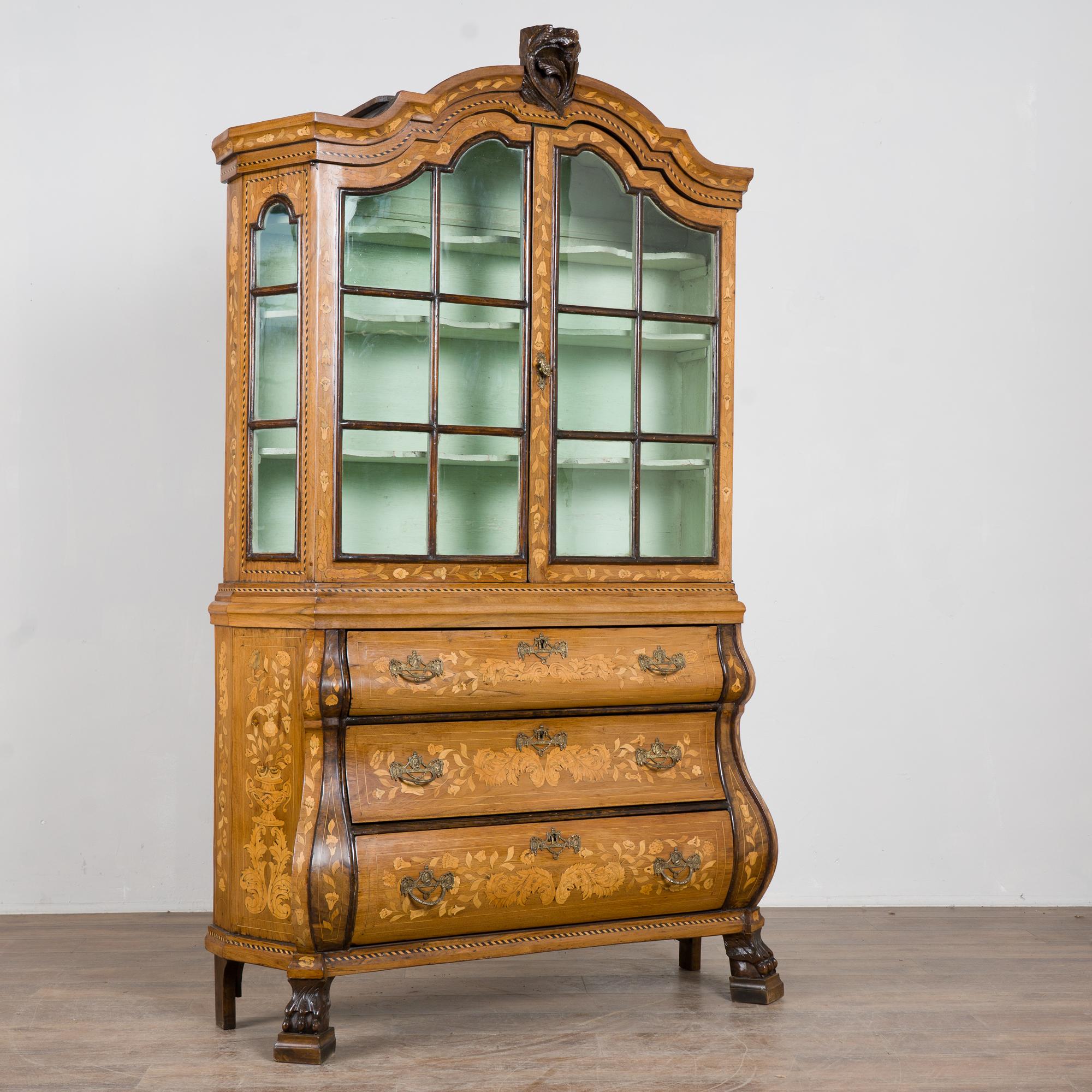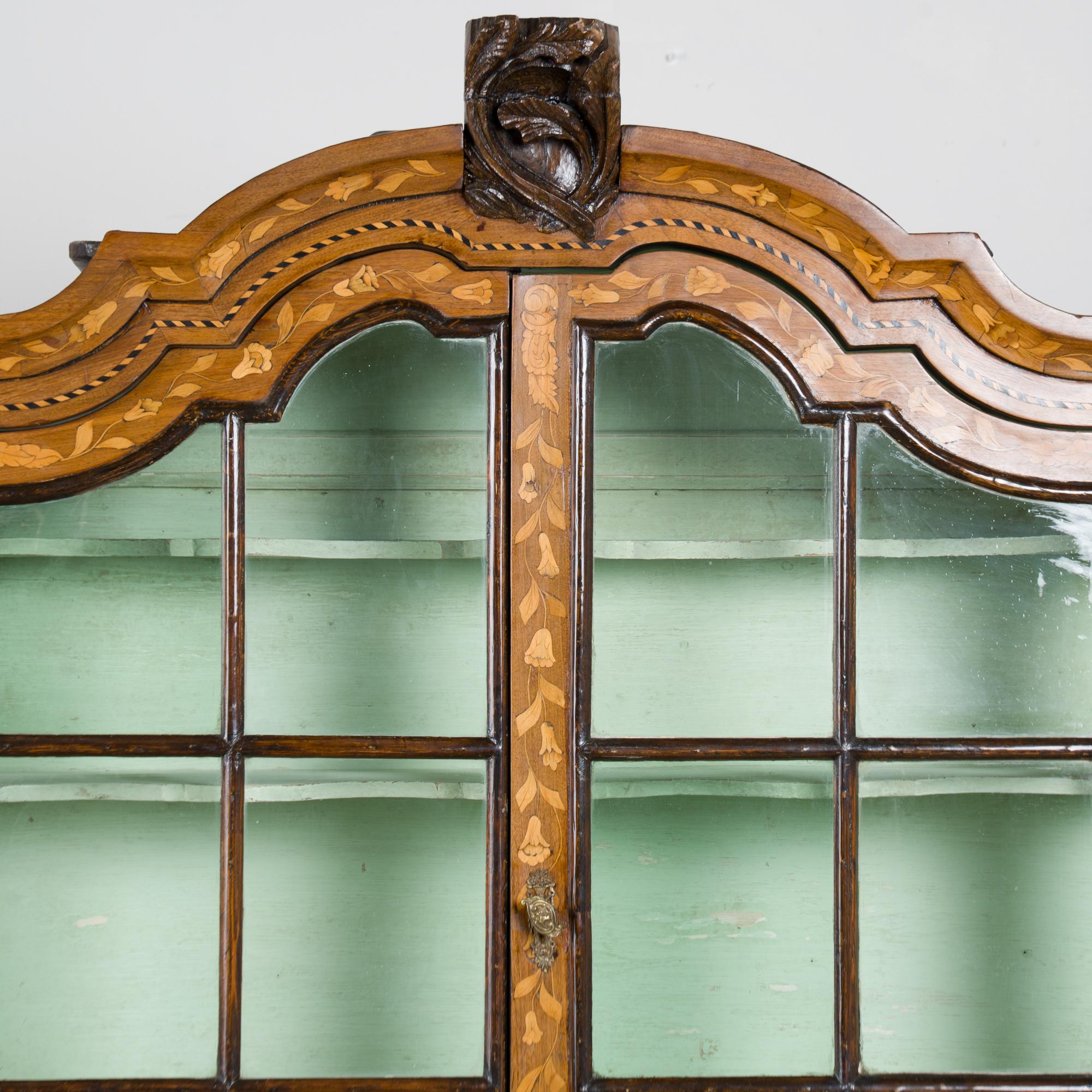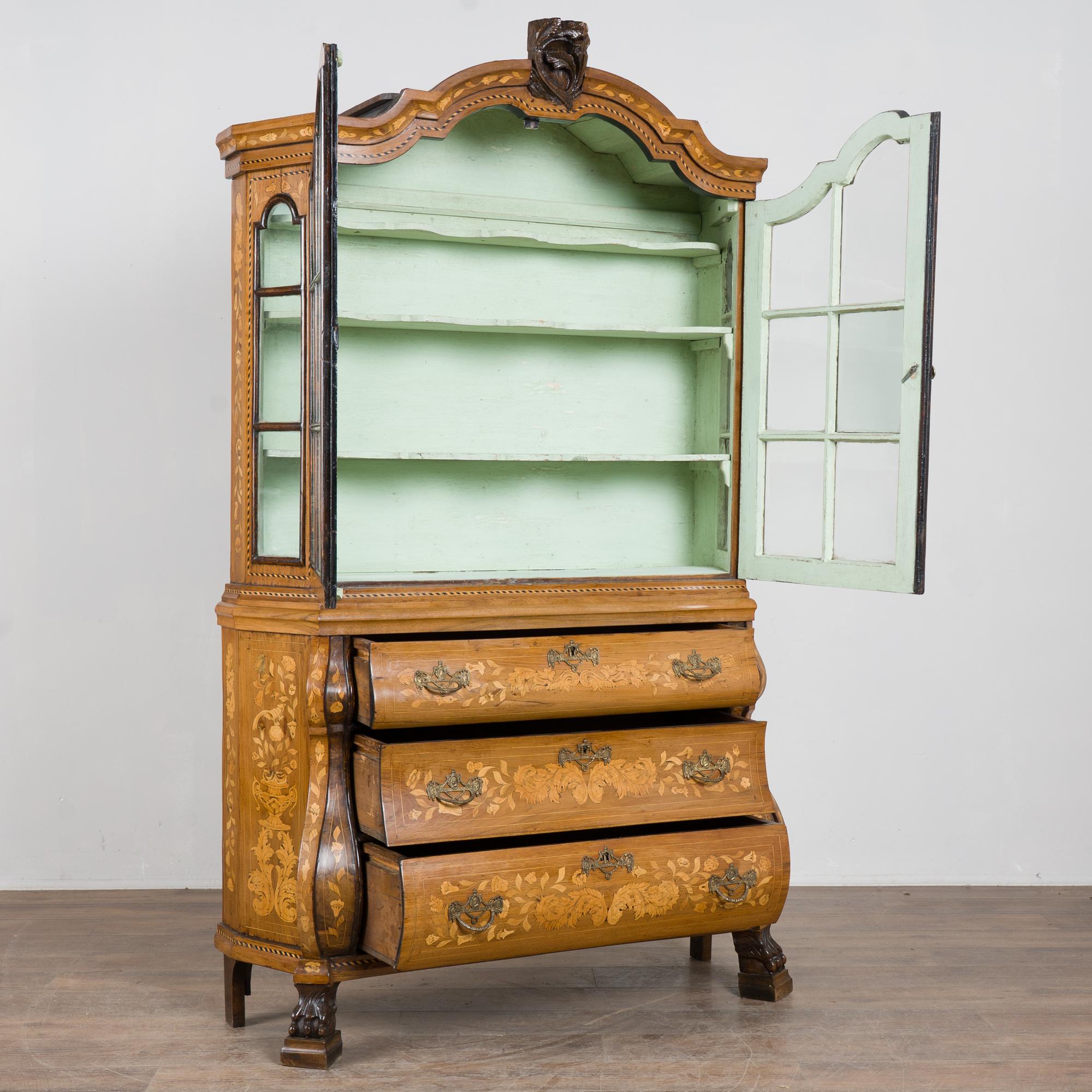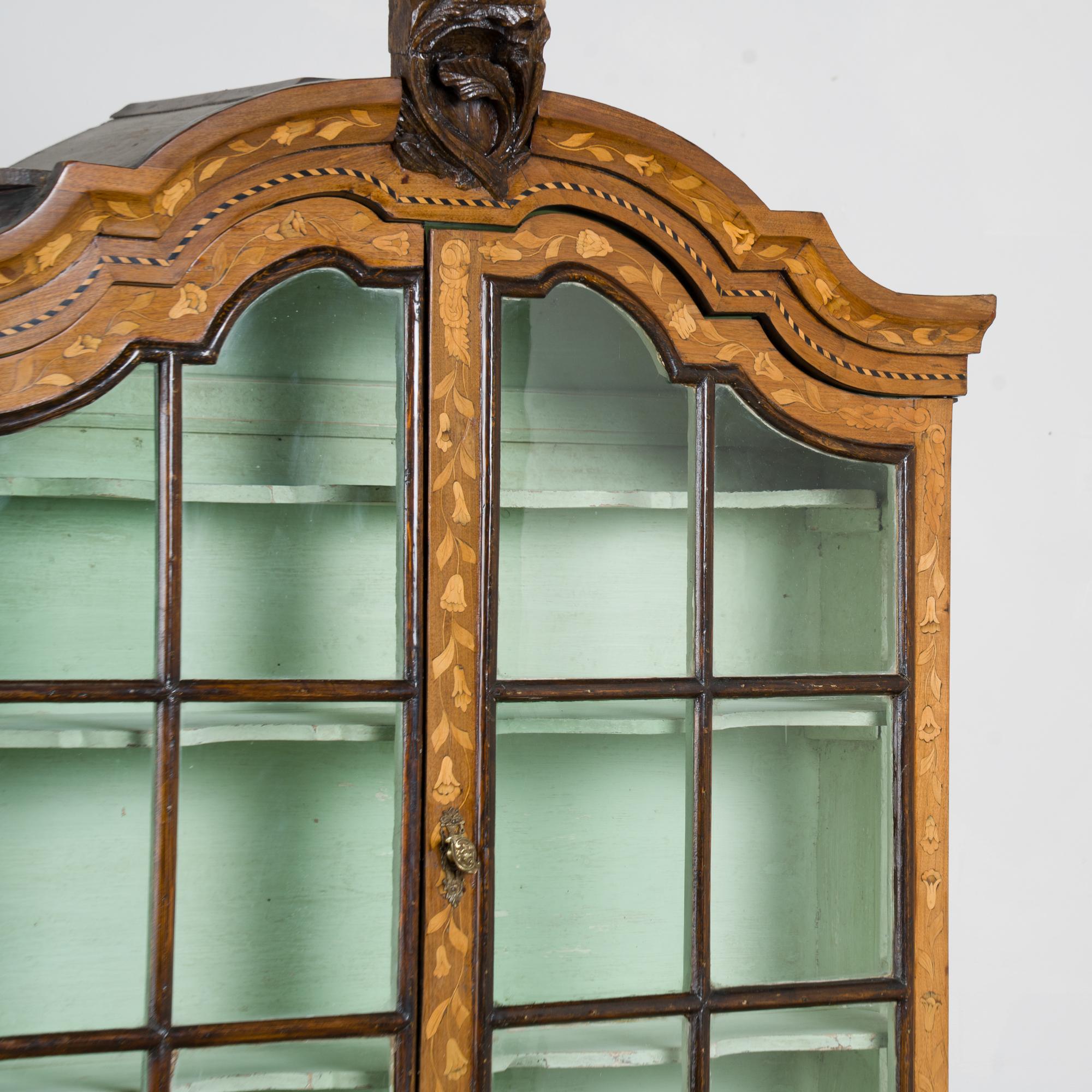 Early 19th century Dutch cabinet featuring elaborate marquetry inlay. The decoration includes flowers, vines, birds, vases, and scrolling leaves, all intricately worked across the surface.