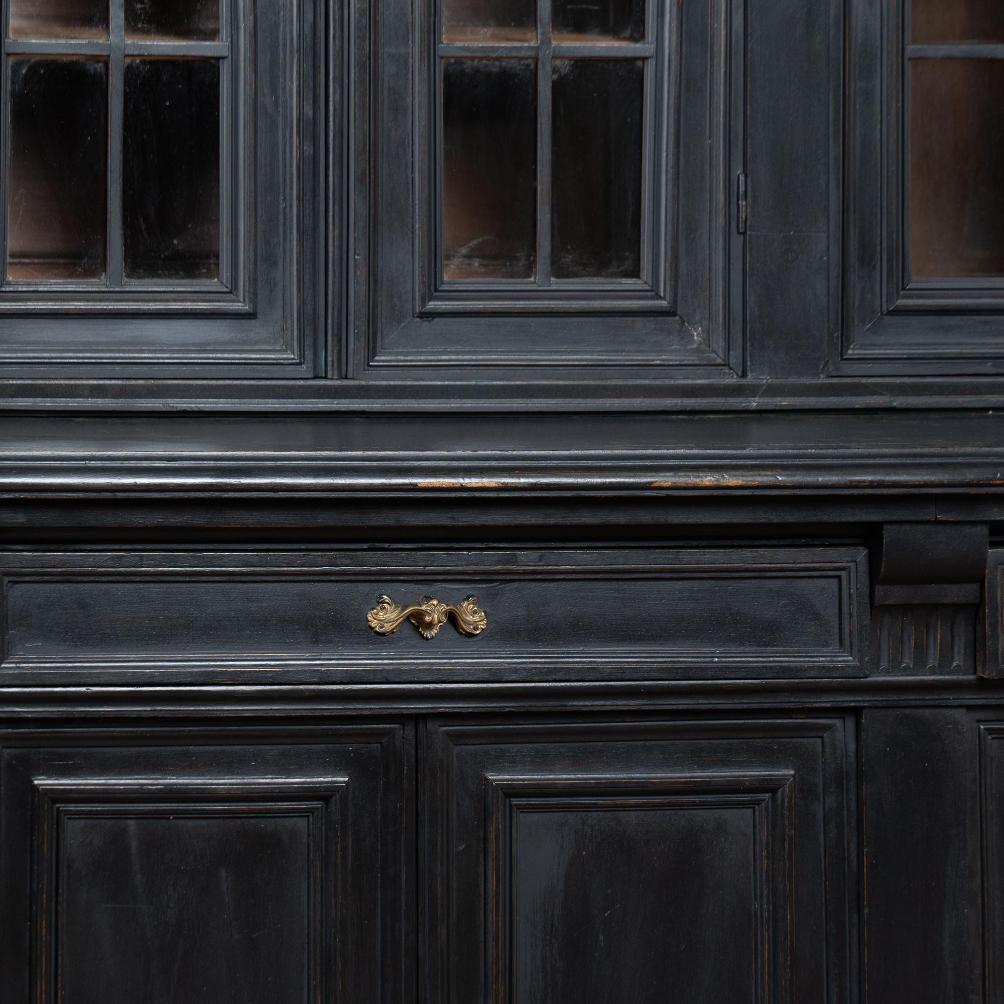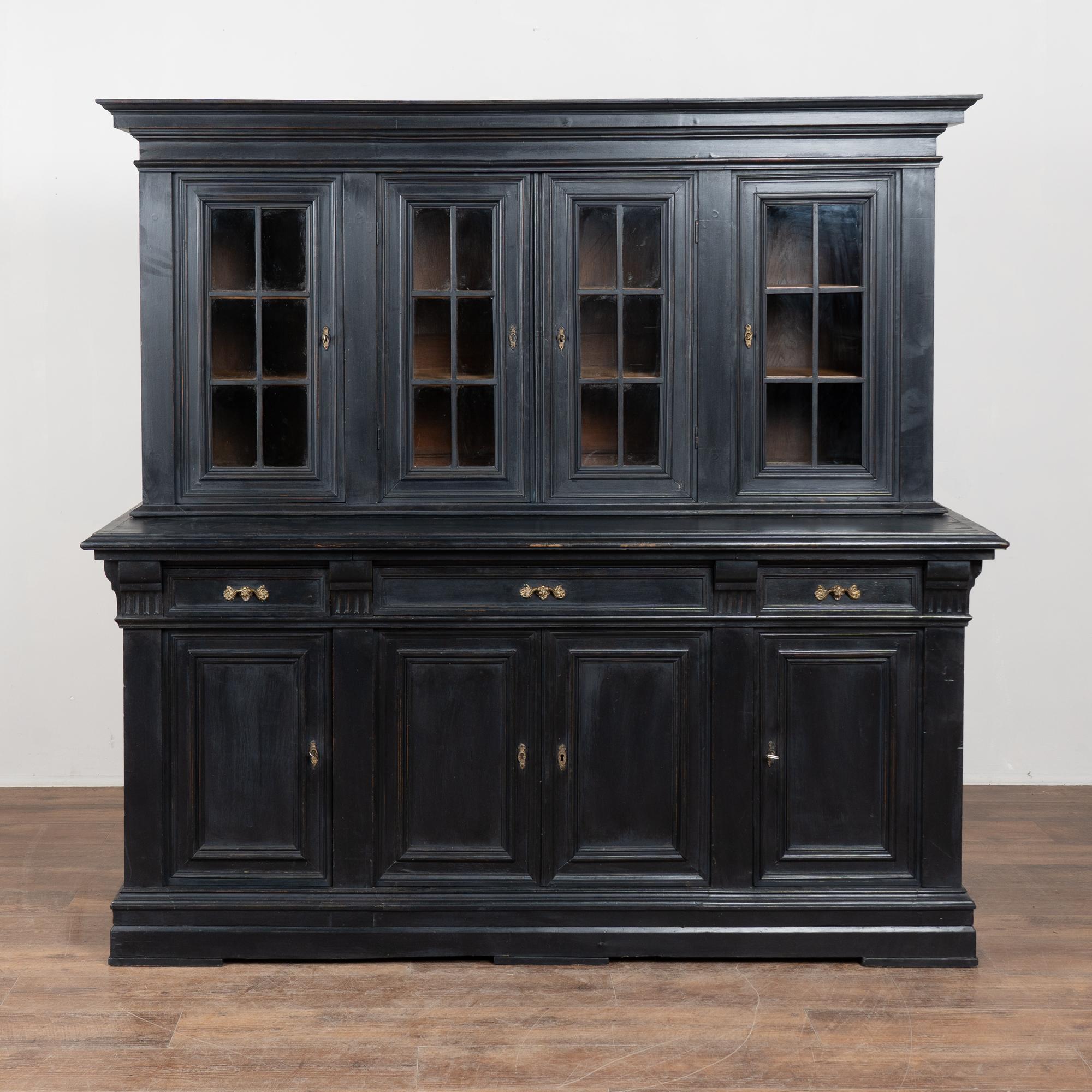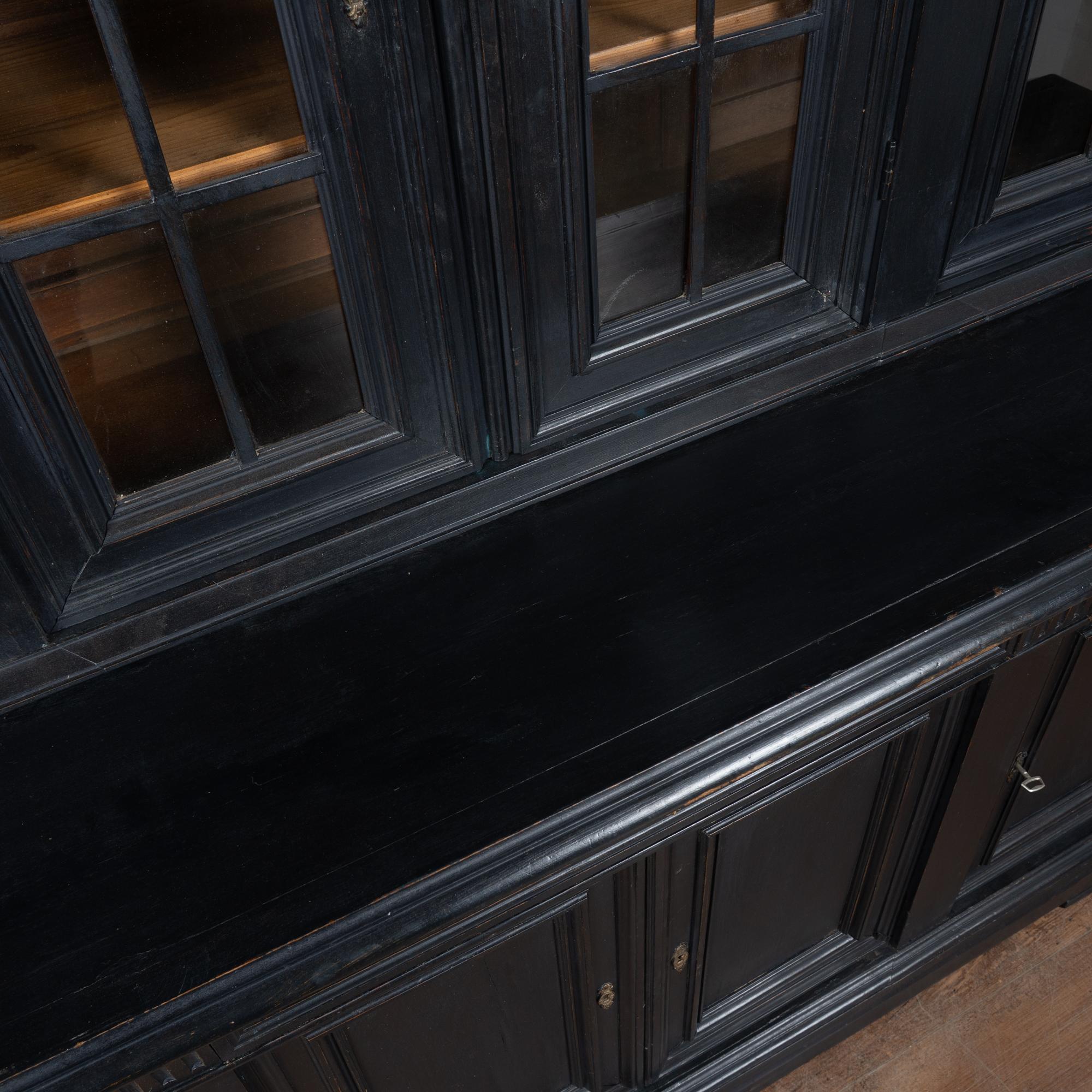 Early 20th century oak display cabinet with a newer black painted finish. Measuring approximately 6 feet wide by 6 feet tall, it features an upper cabinet set back above the base. The upper section includes four pane glass doors designed to display any collection held within.