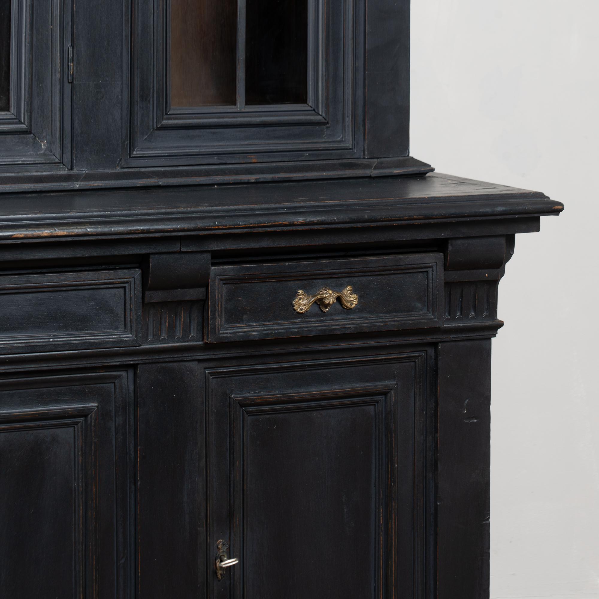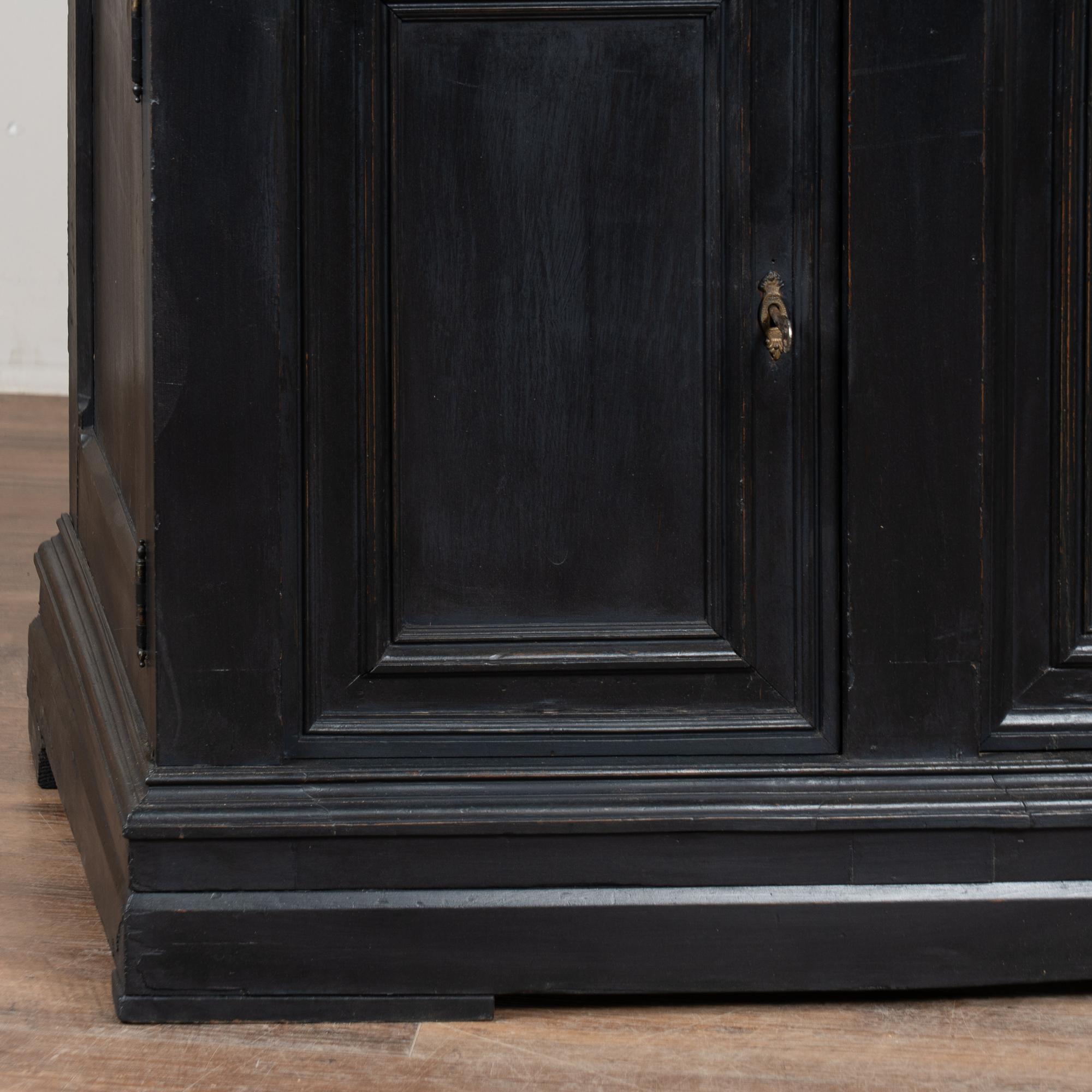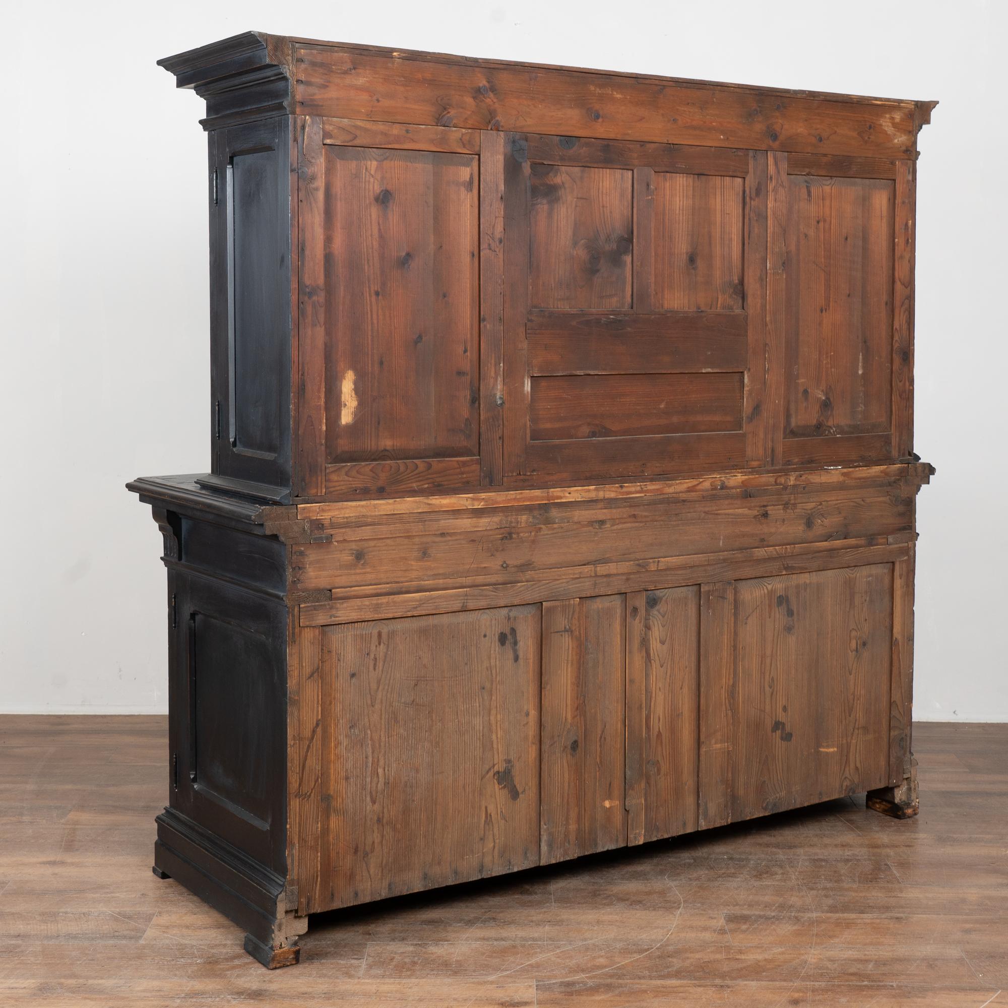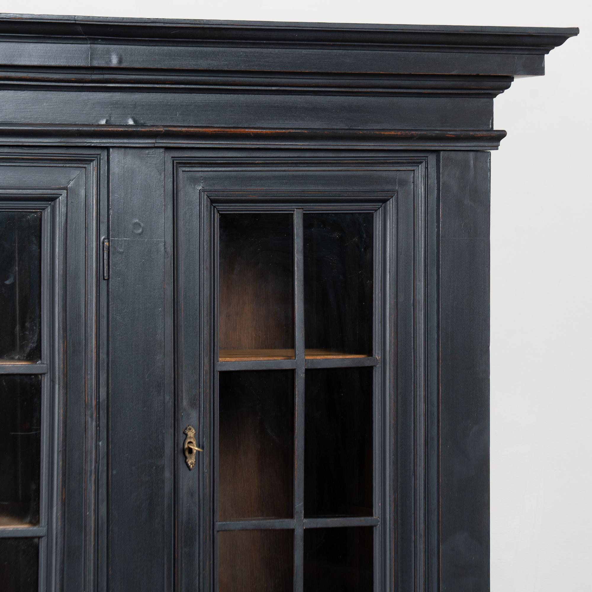 Early 20th century oak display cabinet with a newer black painted finish. Measuring approximately 6 feet wide by 6 feet tall, it features an upper cabinet set back above the base. The upper section includes four pane glass doors designed to display any collection held within.