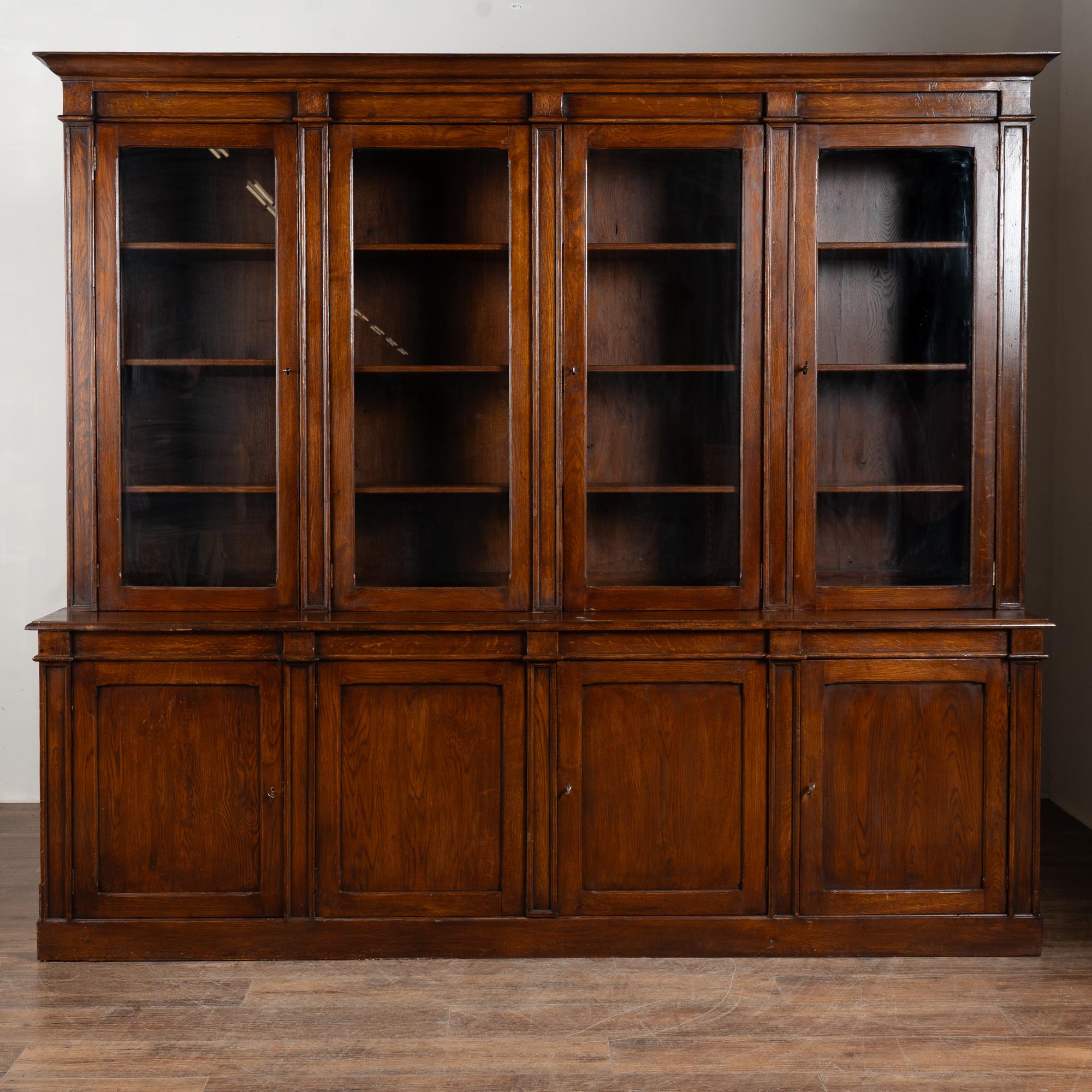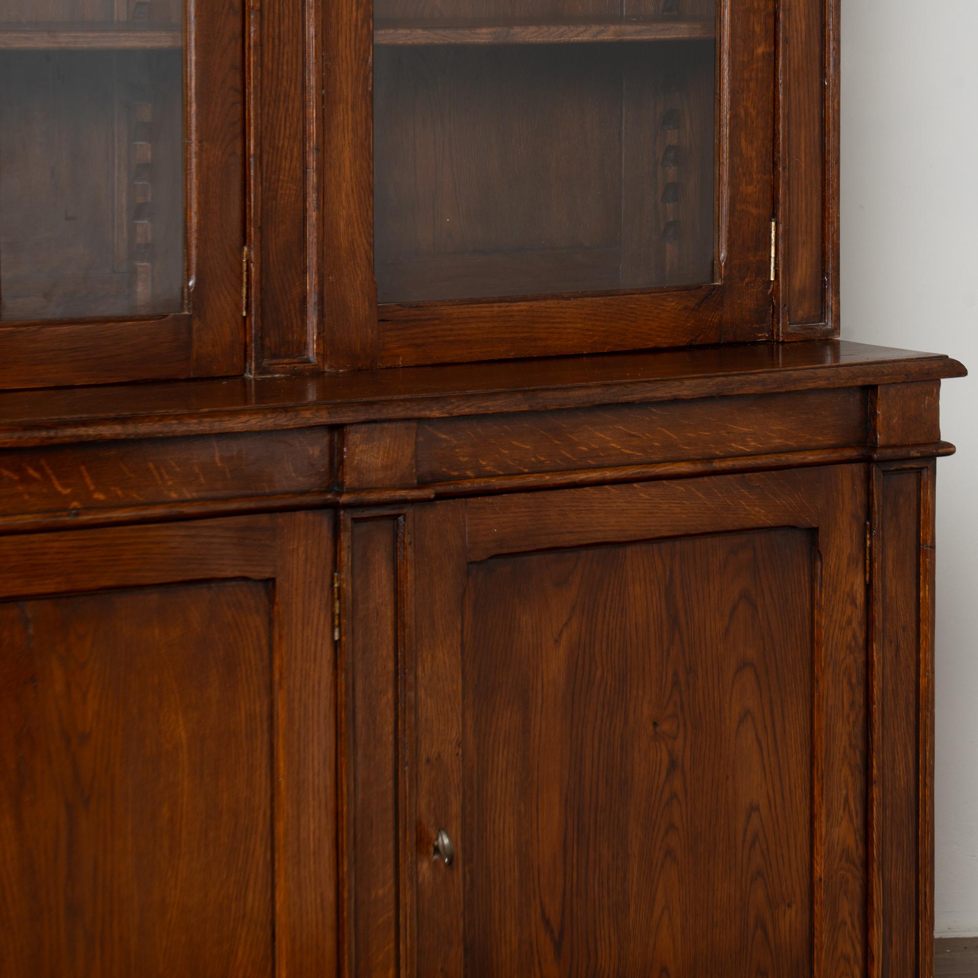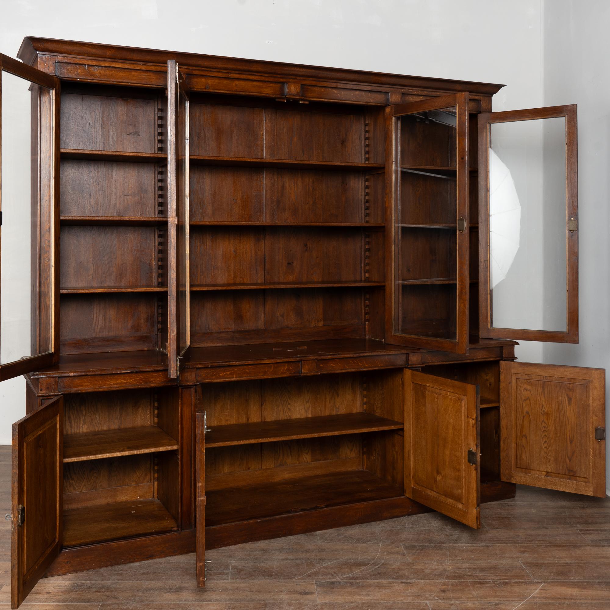 Early 20th century French bookcase cabinet crafted in stained oak. The upper section features four glass doors designed to display books or collections. Below are four paneled cabinet doors providing enclosed storage.