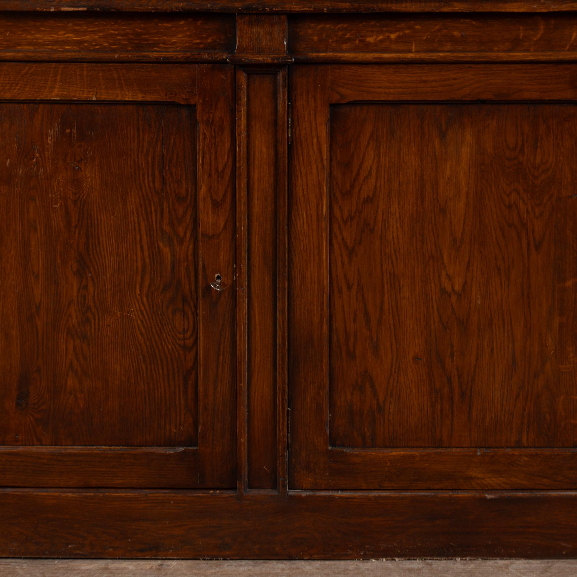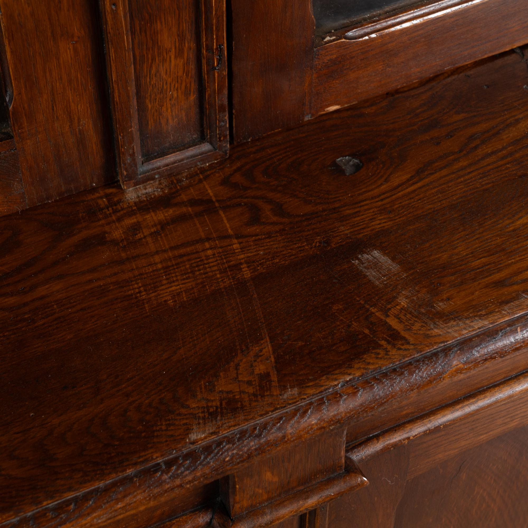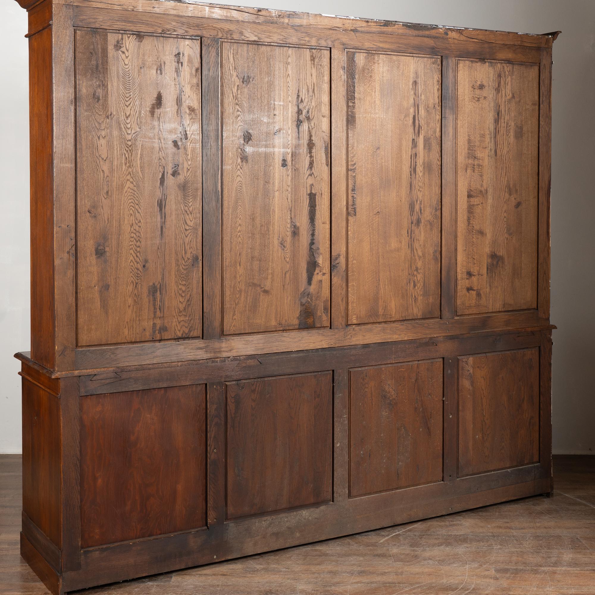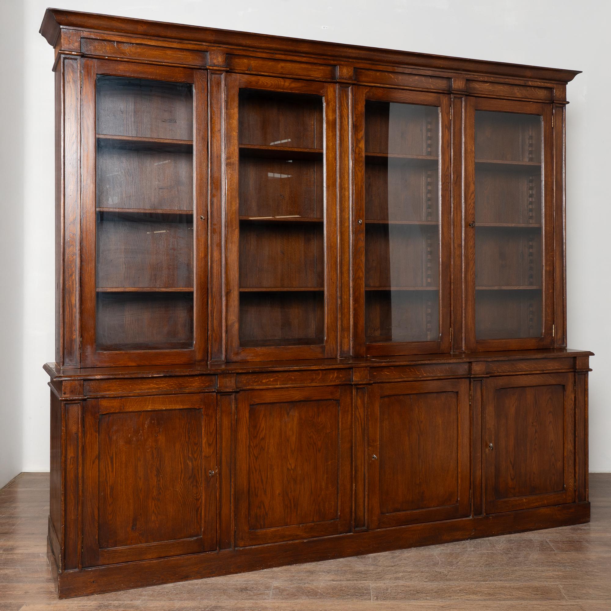 Early 20th century French bookcase cabinet crafted in stained oak. The upper section features four glass doors designed to display books or collections. Below are four paneled cabinet doors providing enclosed storage.