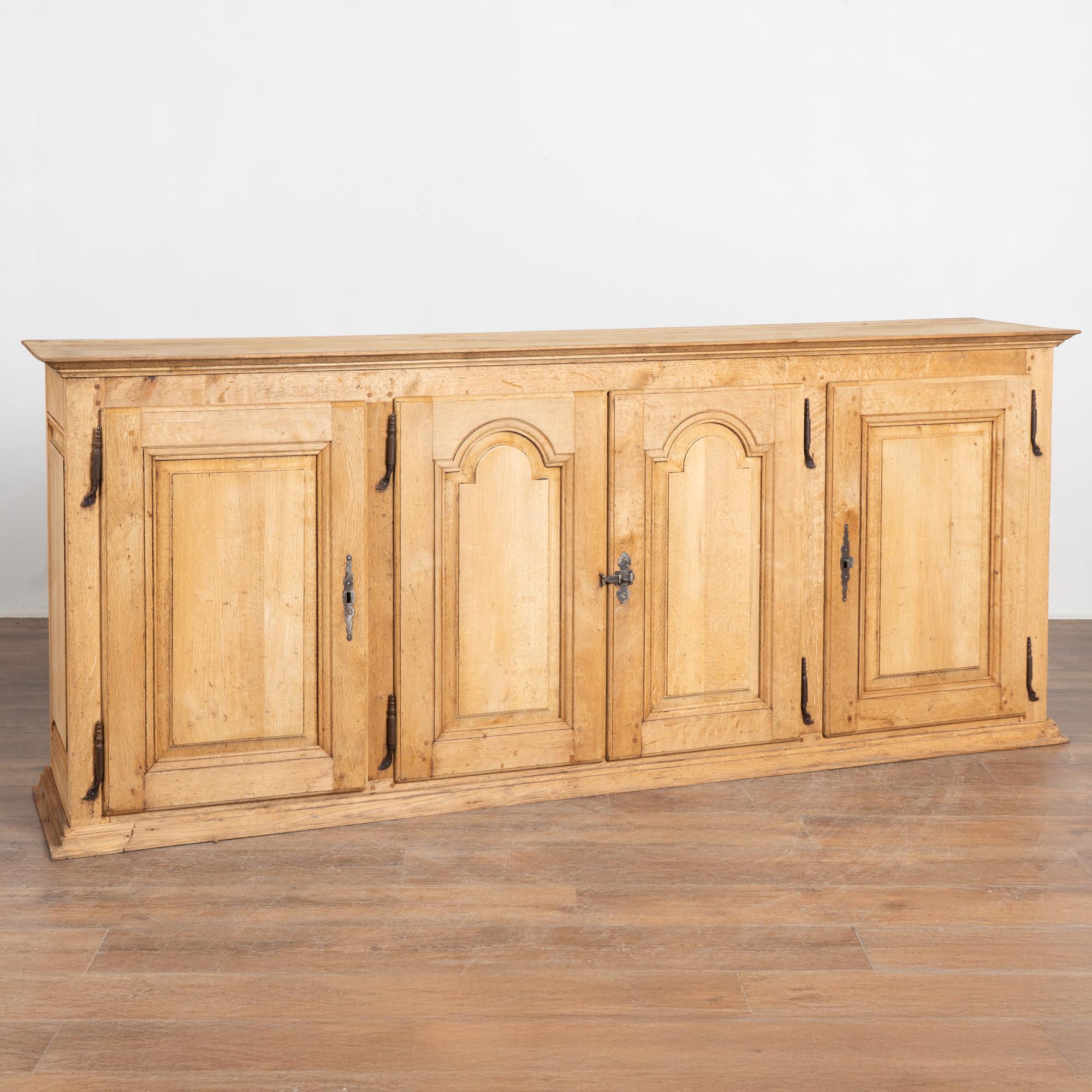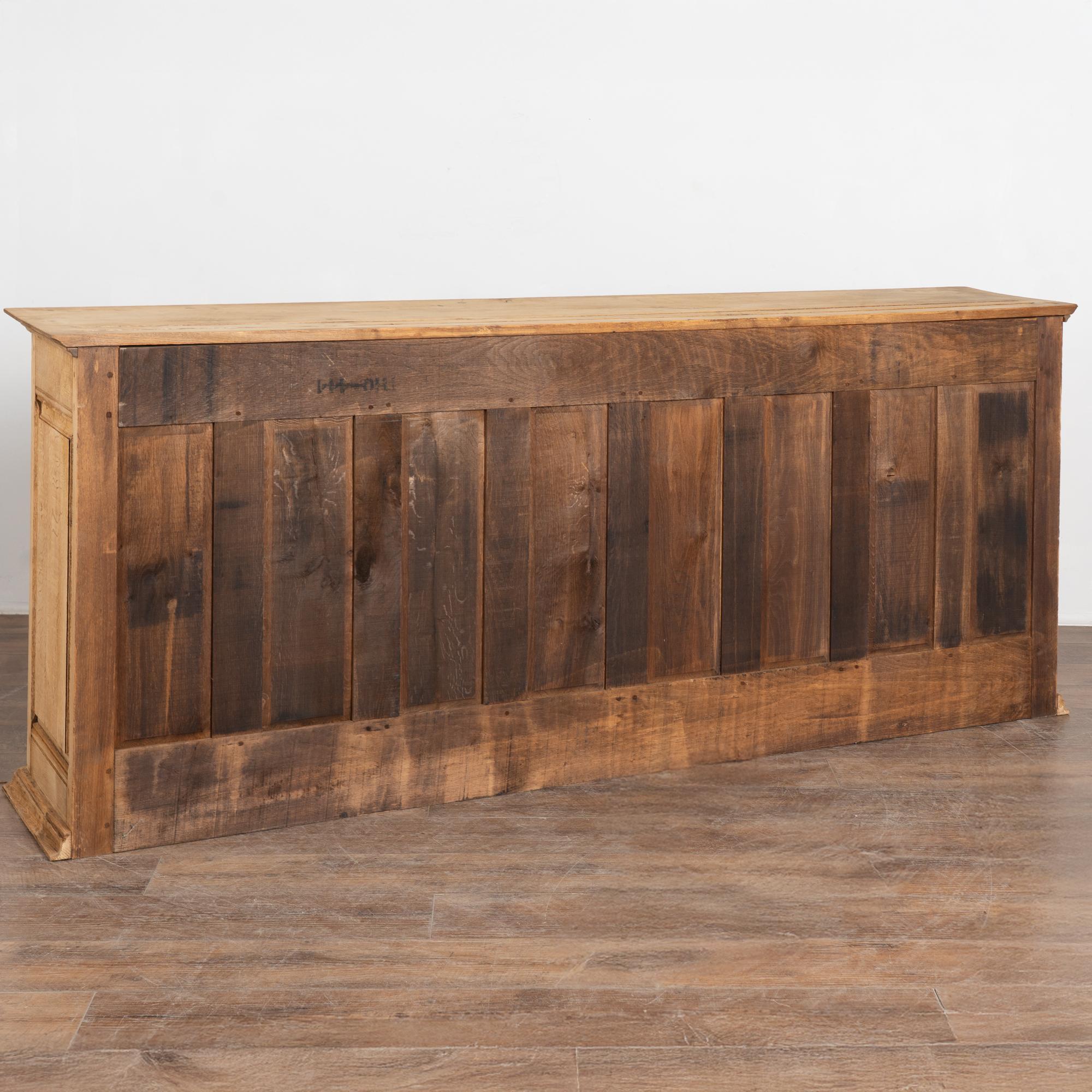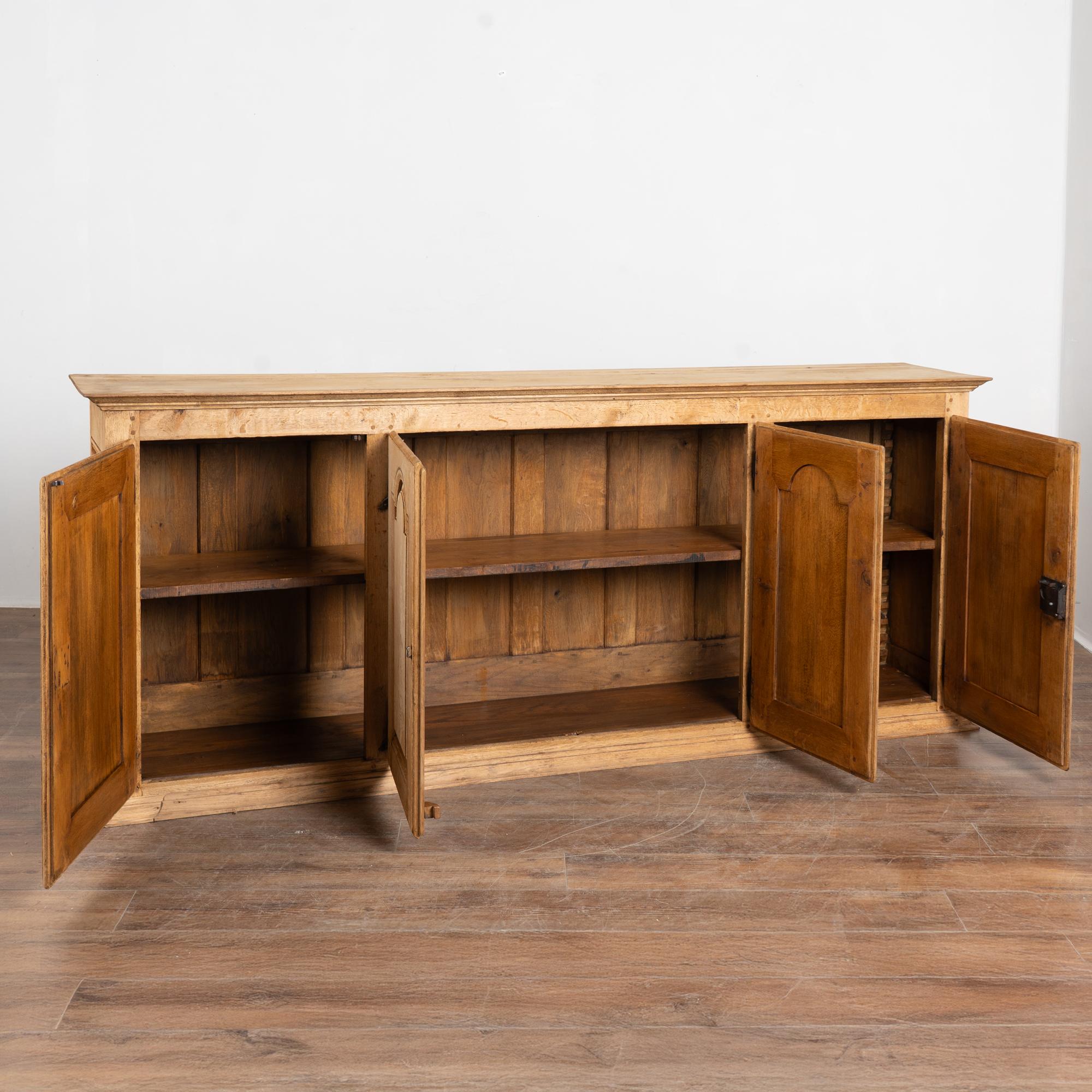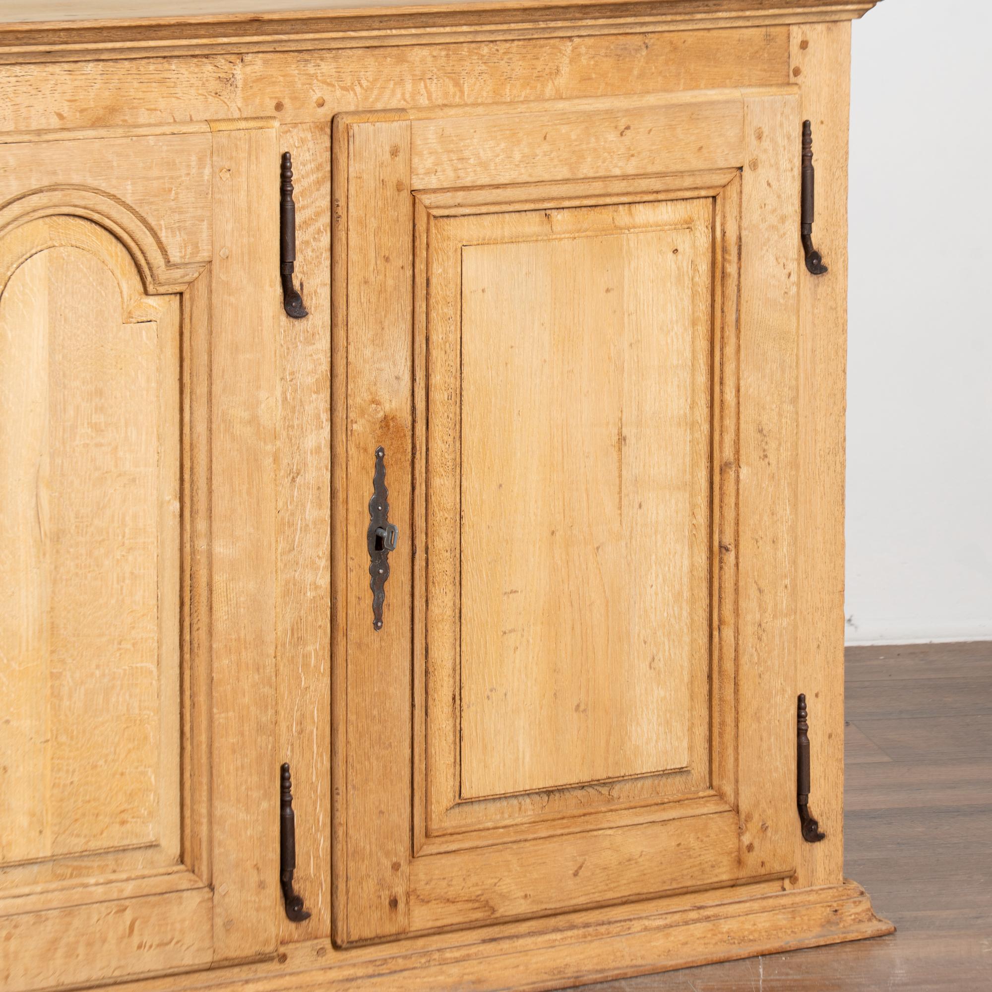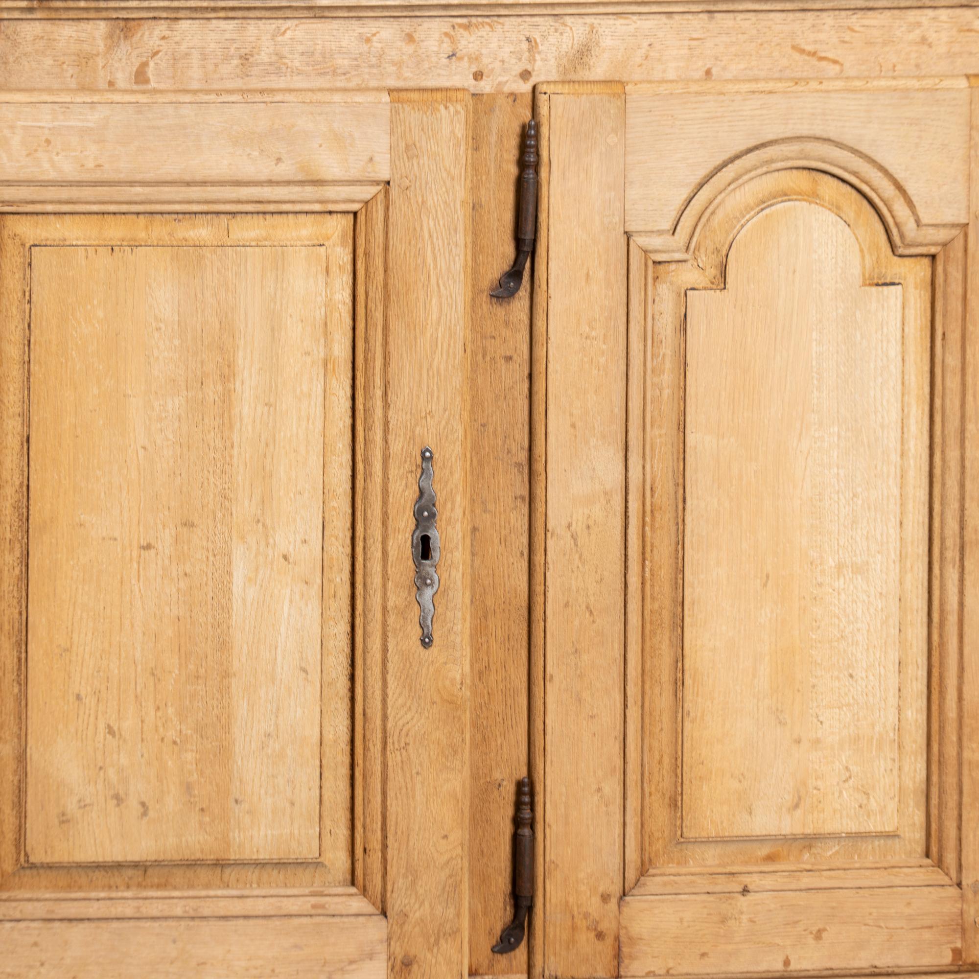 19th century French narrow sideboard crafted in oak with a bleached finish that highlights the natural grain of the wood.
