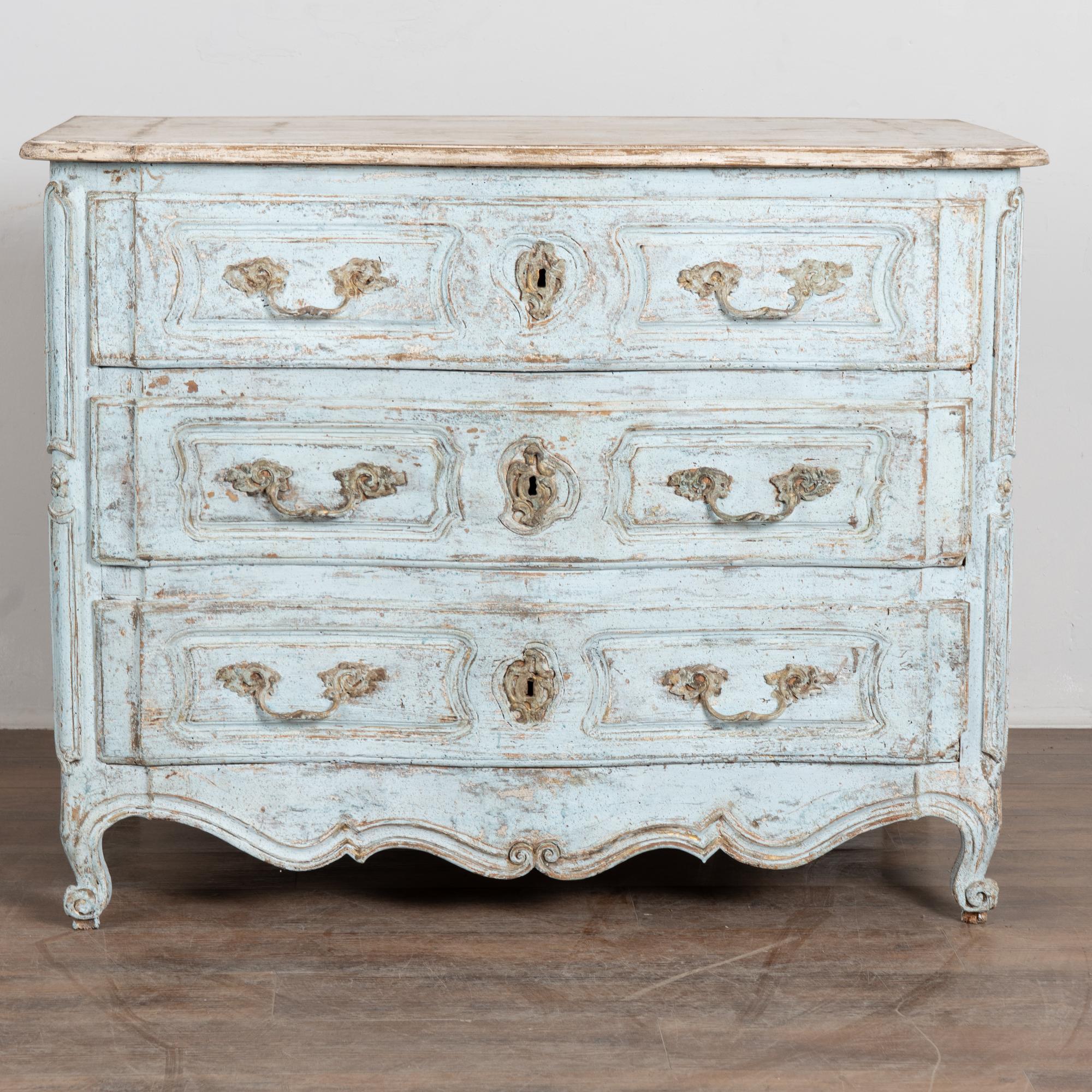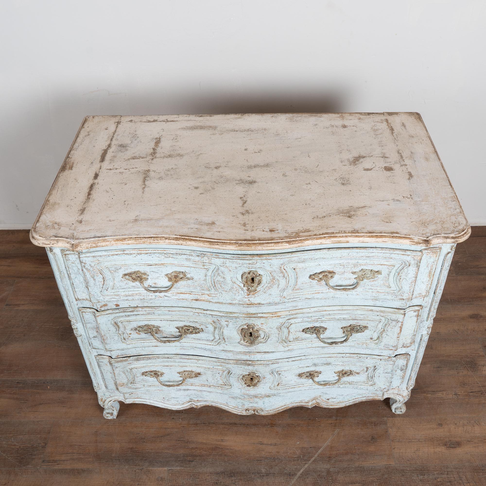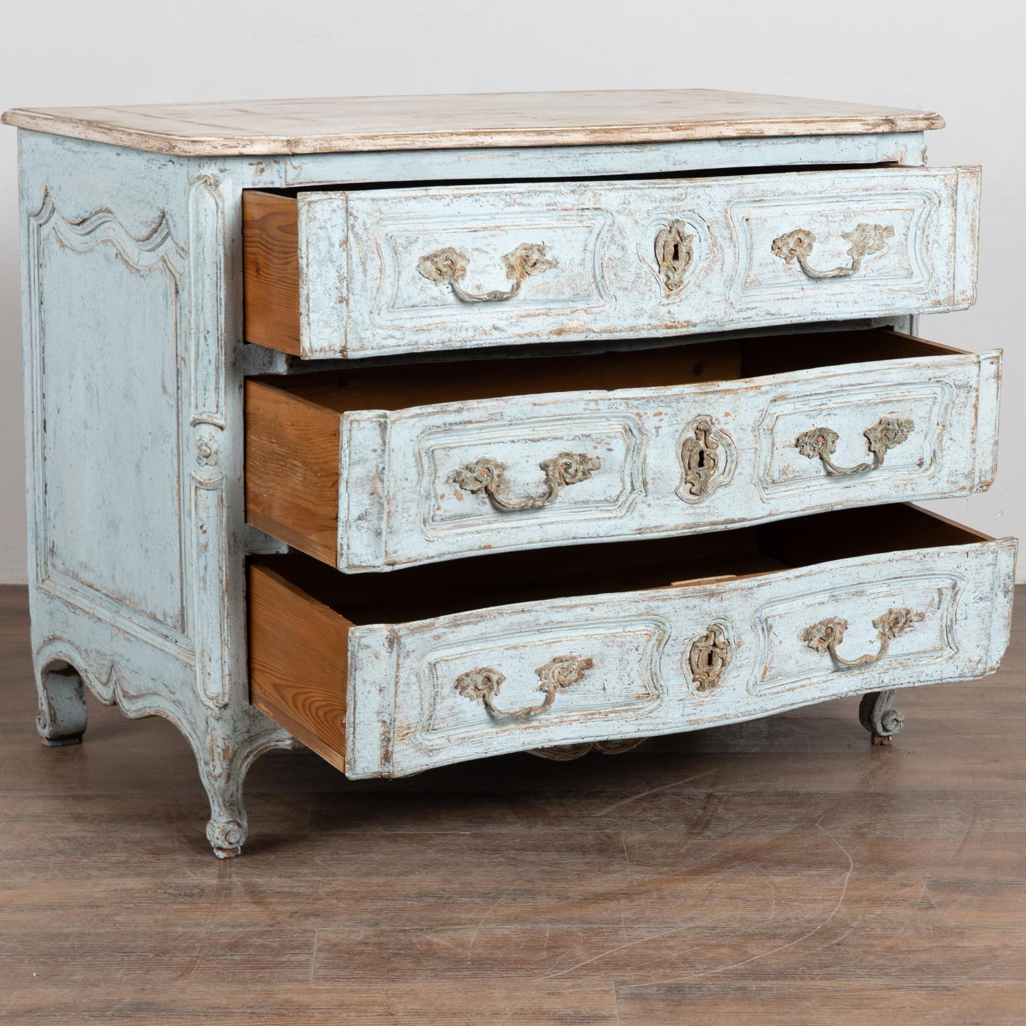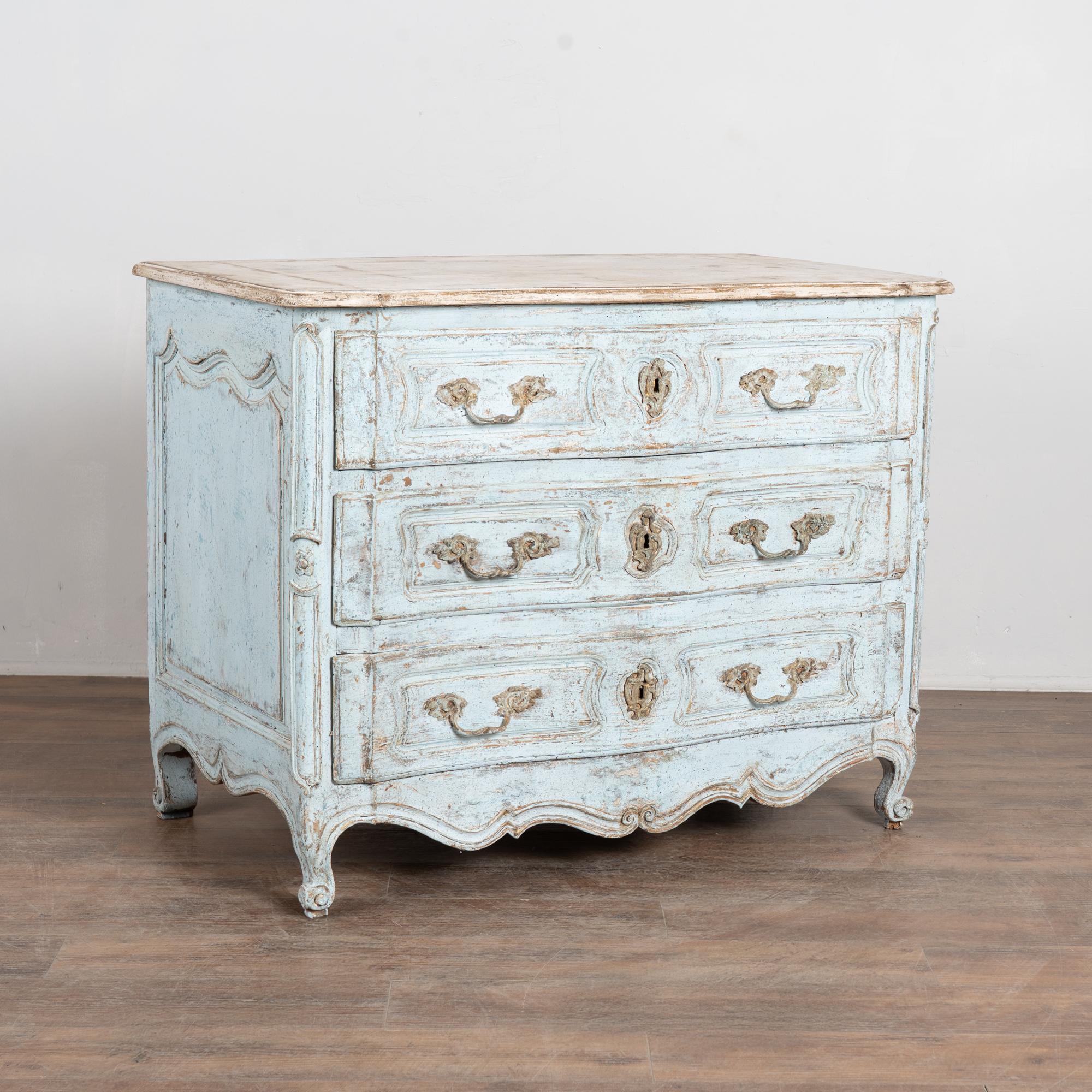 The chest features a newer professionally applied layered painted finish in pale blue with the top finished in contrasting antique white. The surface has been lightly distressed, revealing areas of the natural wood beneath and creating an aged character reflective of the period.