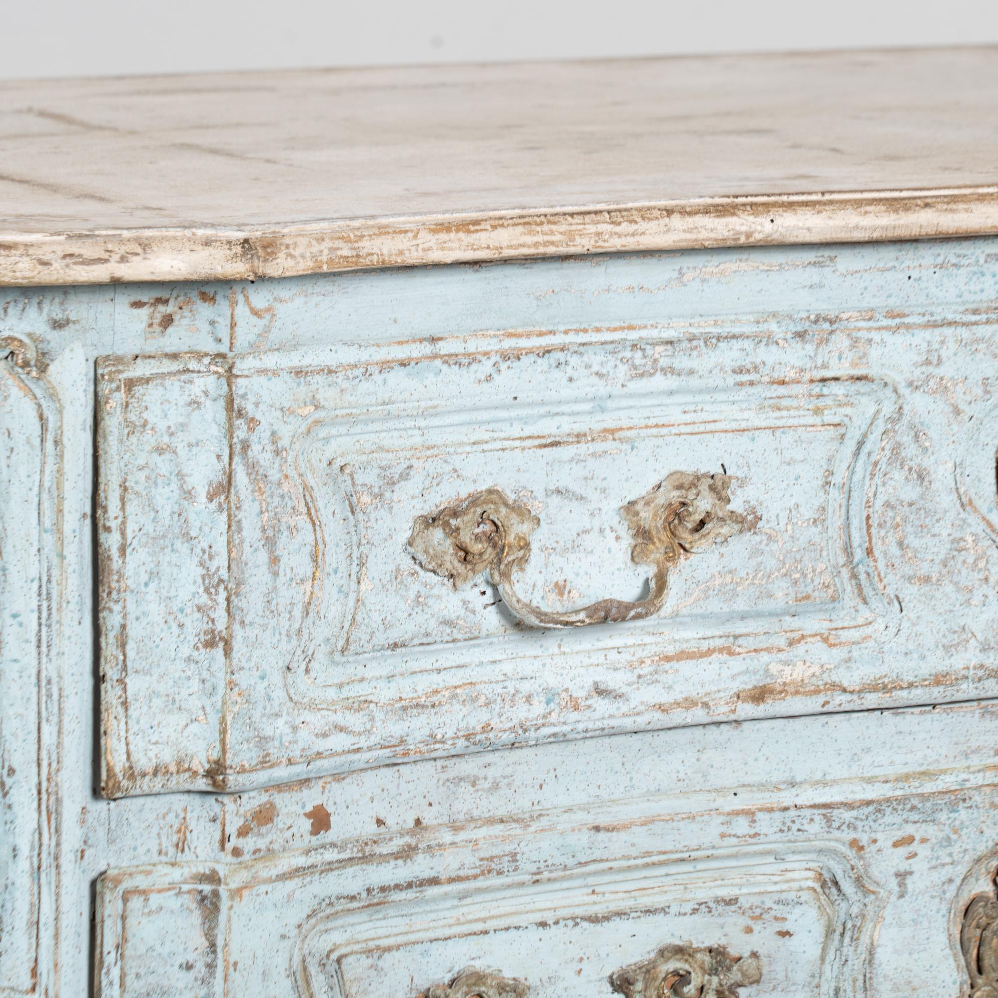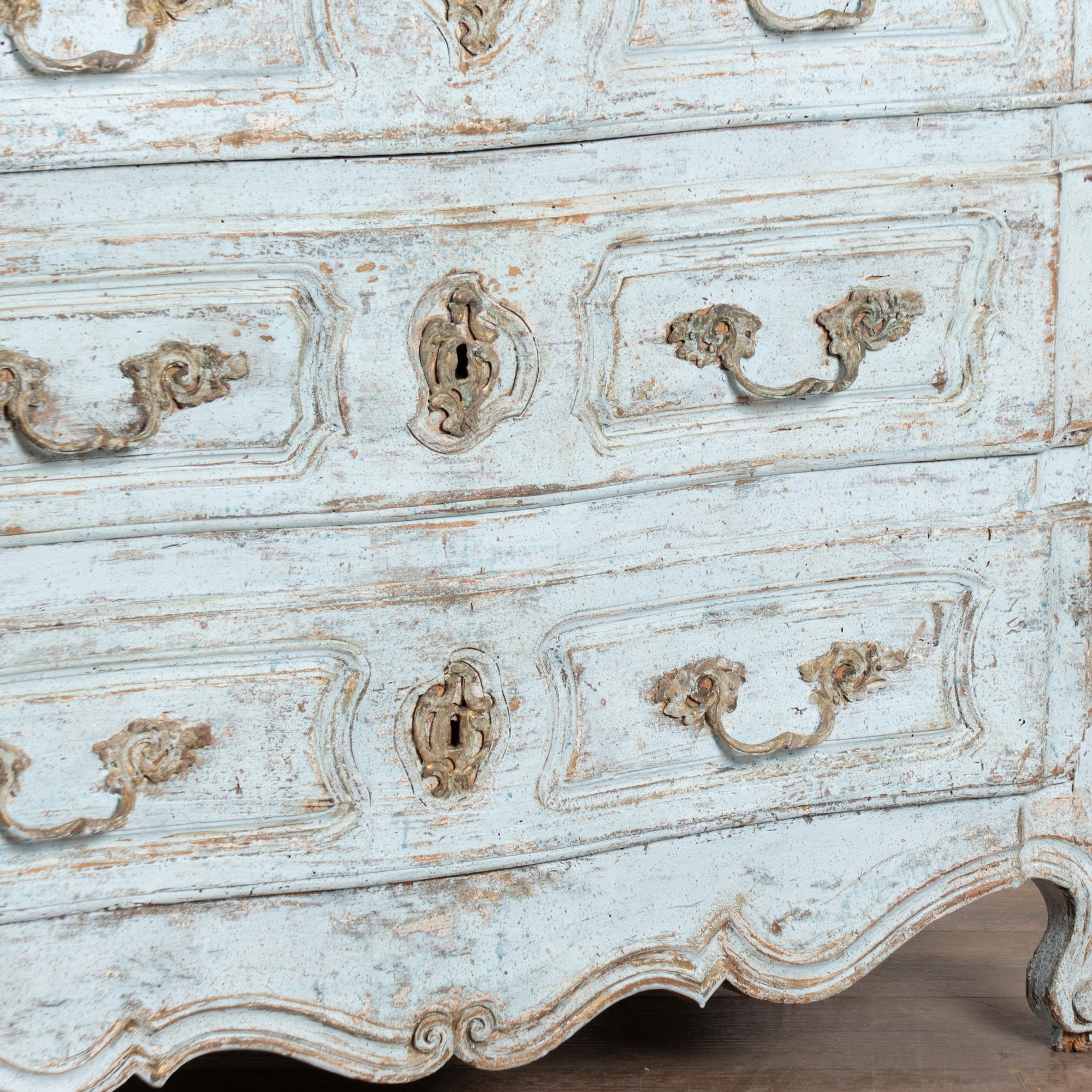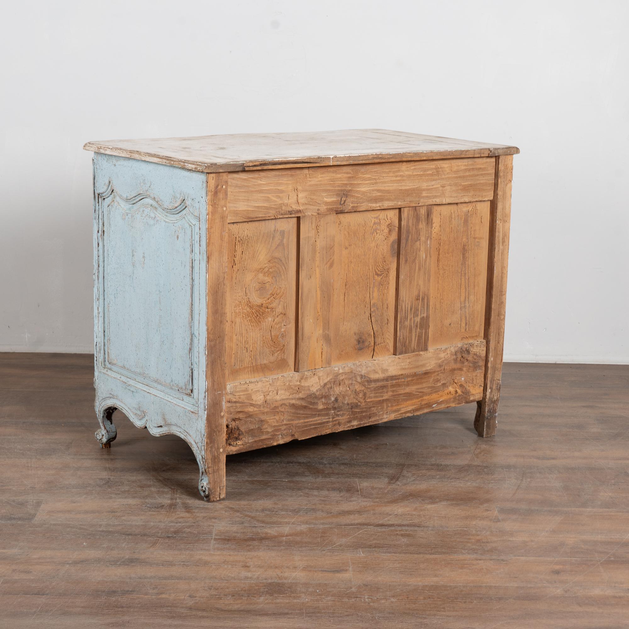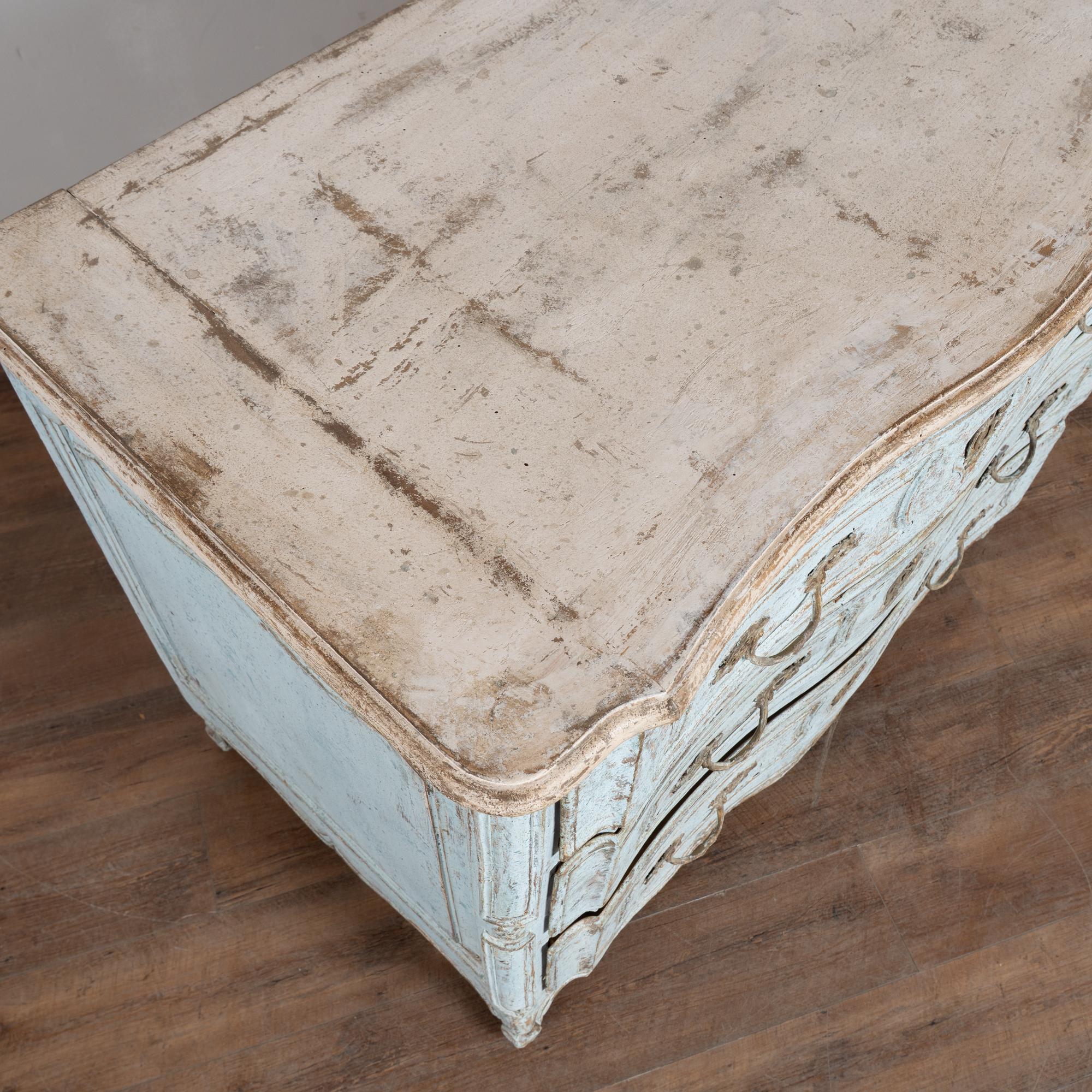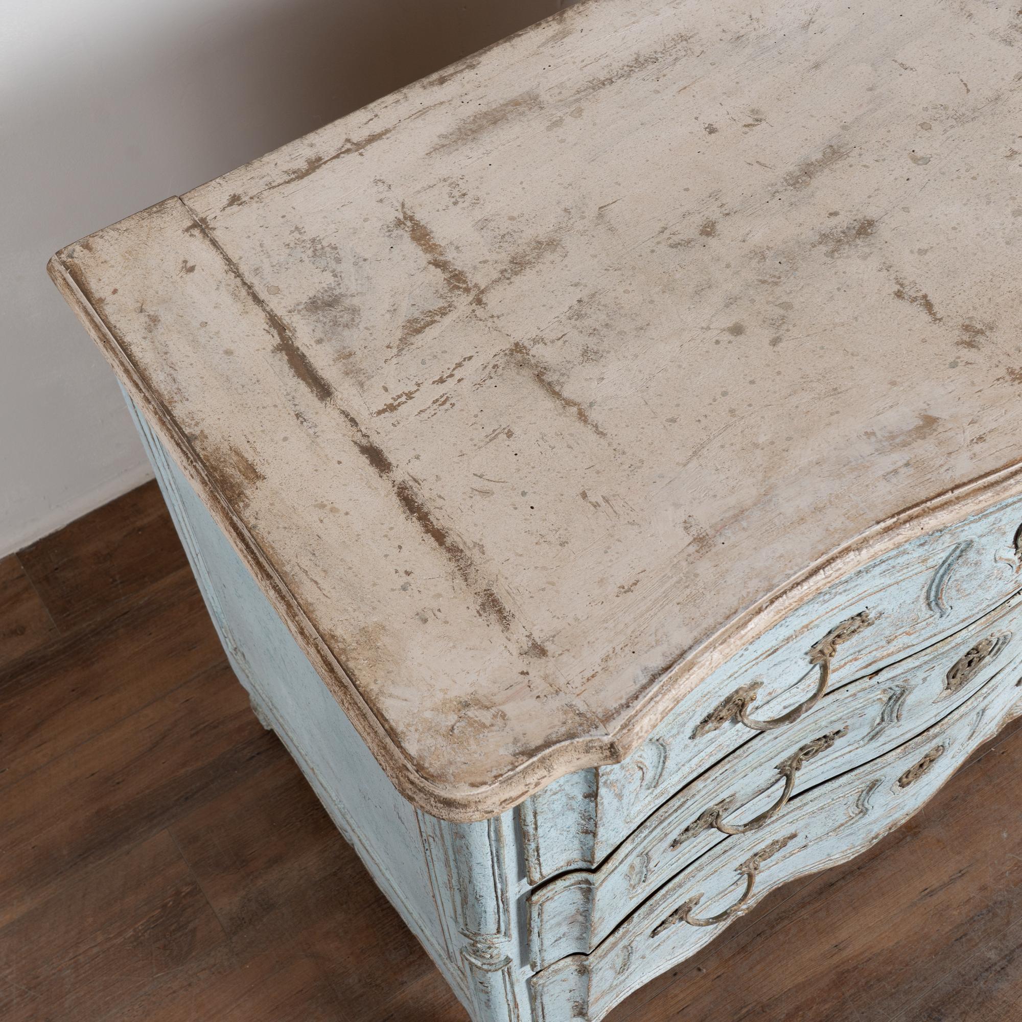 The chest features a newer professionally applied layered painted finish in pale blue with the top finished in contrasting antique white. The surface has been lightly distressed, revealing areas of the natural wood beneath and creating an aged character reflective of the period.