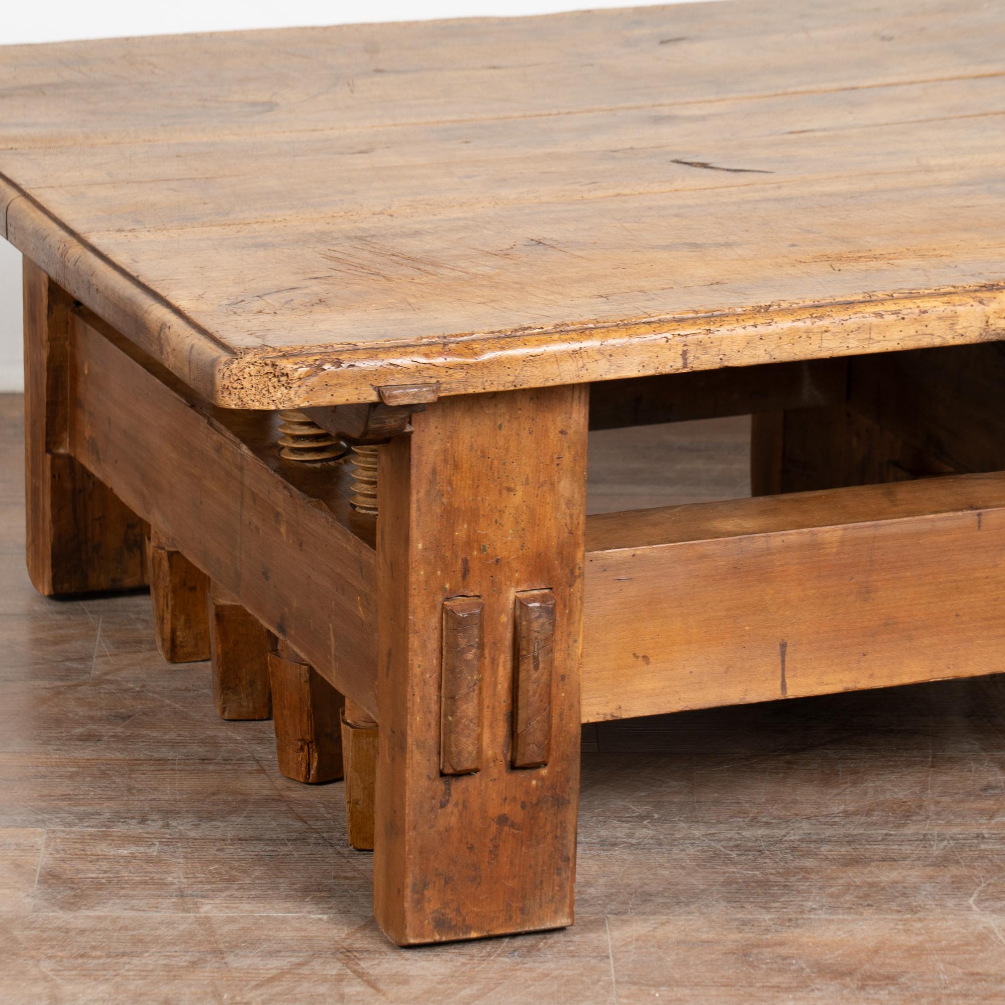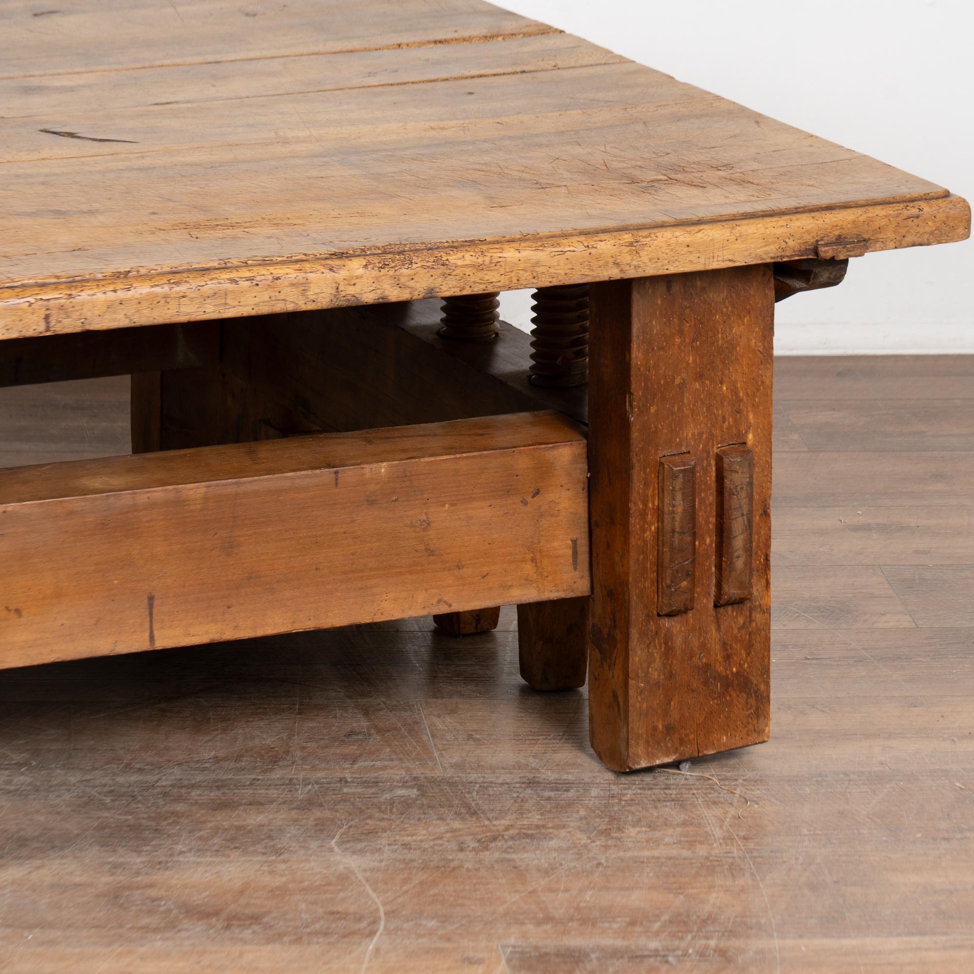 20th century rustic square coffee table from Hungary. The base is uniquely constructed using old vice elements, creating an industrial and substancial appeal.