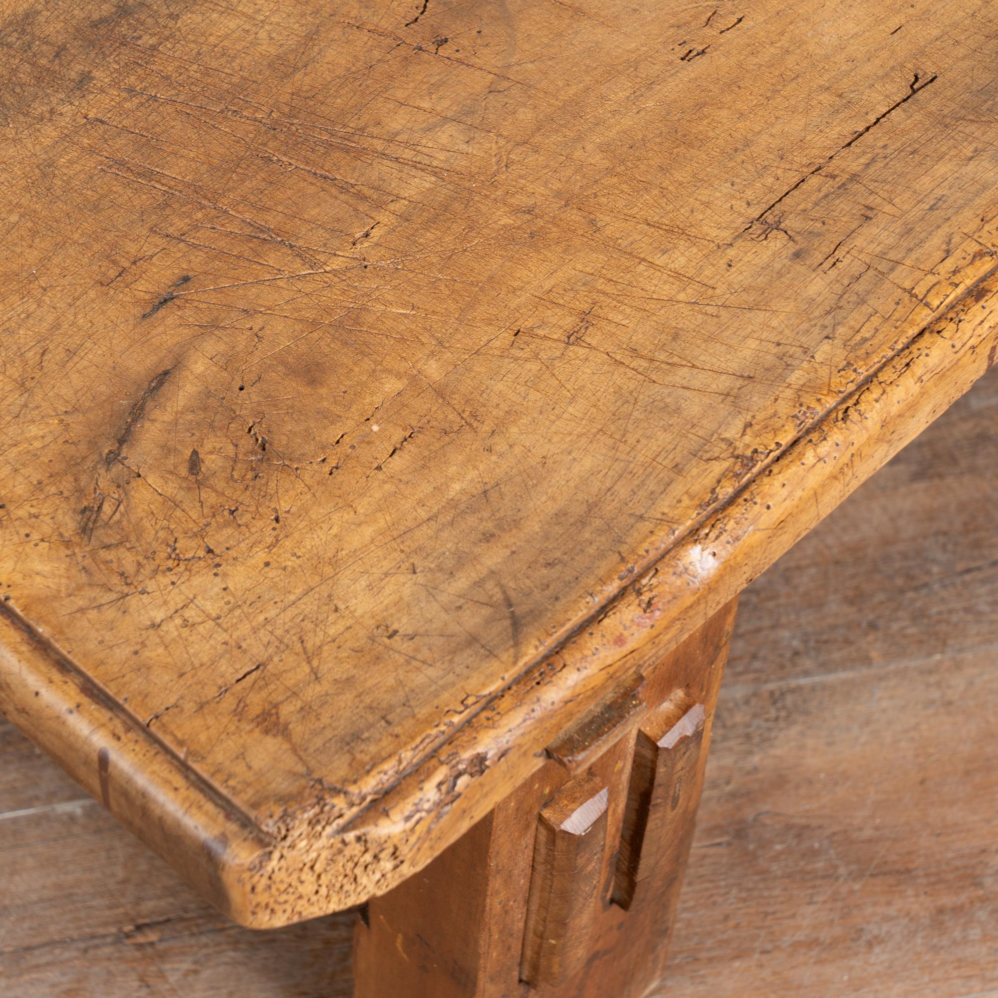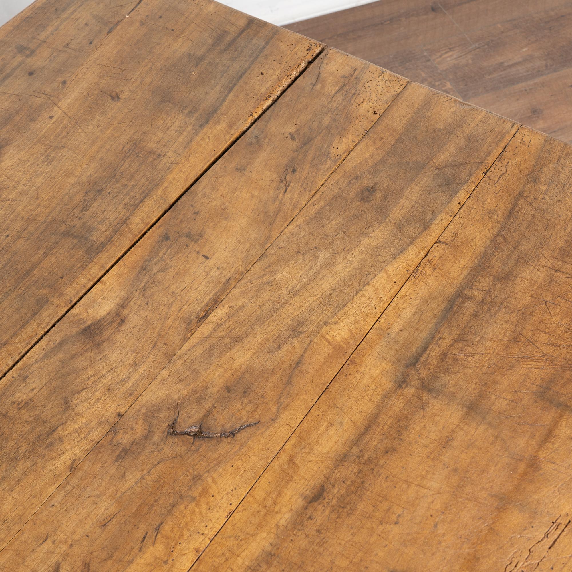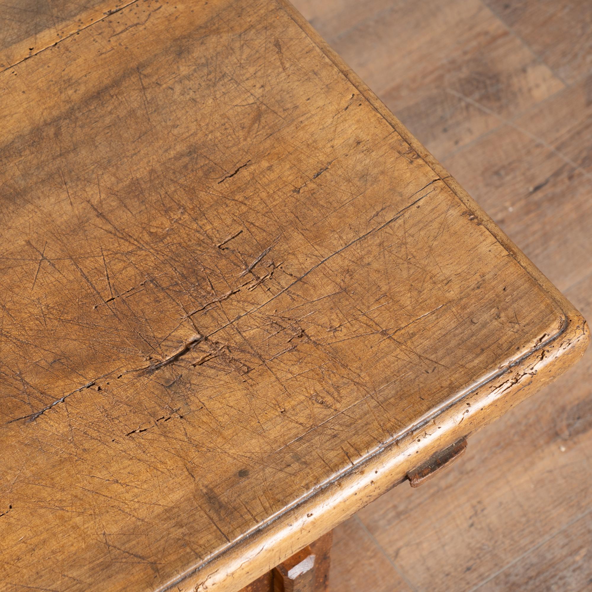 The top was likely part of an earlier work table and shows heavy use including gouges, cracks, deep scratching, age-related separation of planks and residual signs of old wormholes. The thick surface reflects years of practical use and adds to the authentic rustic character.