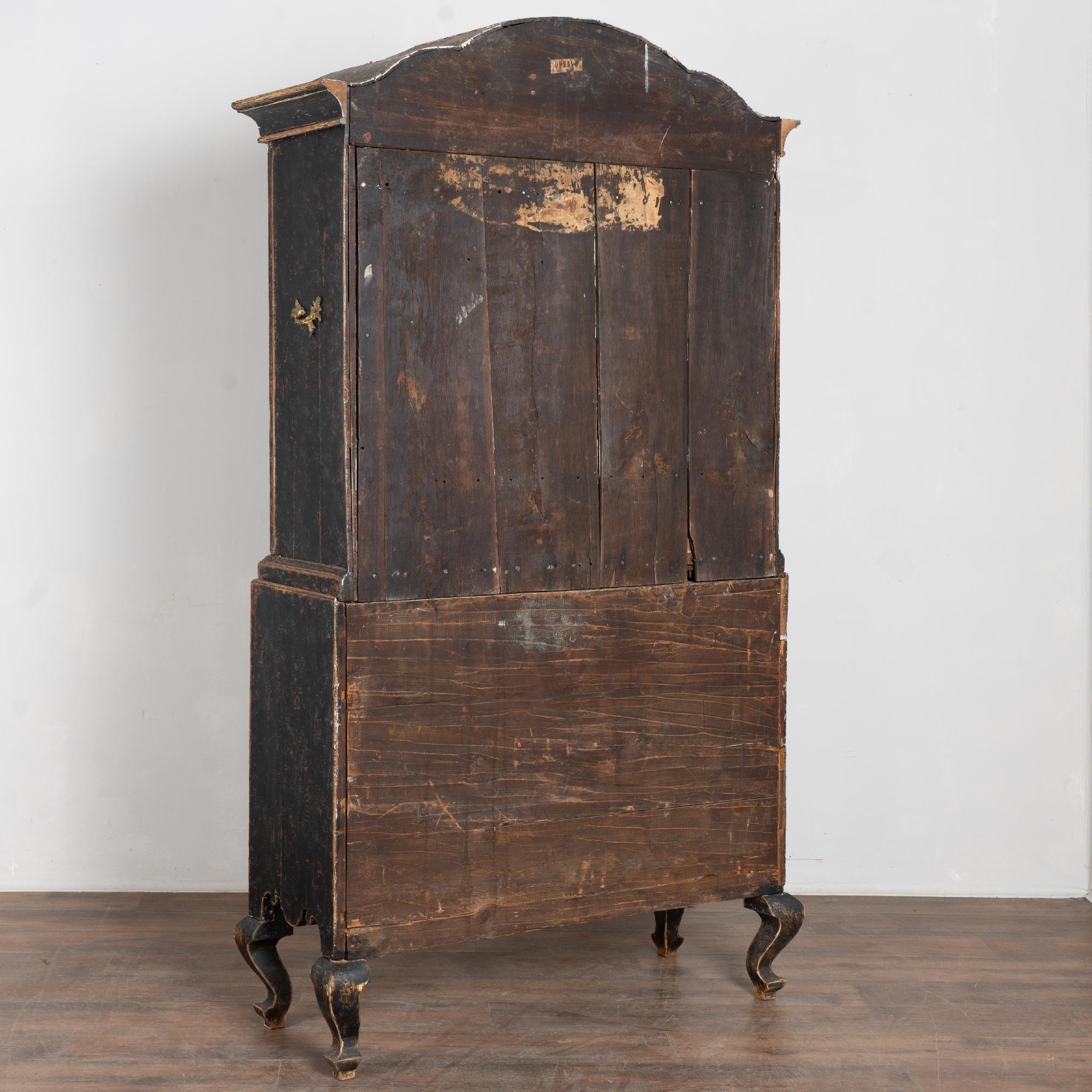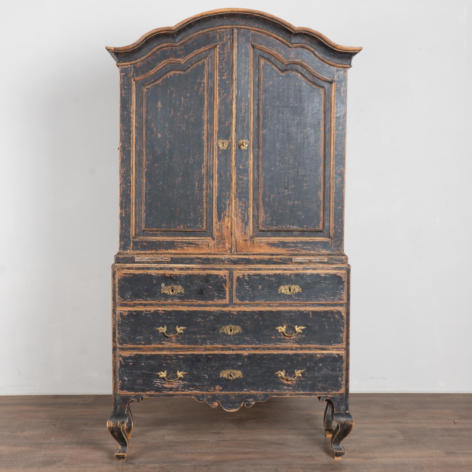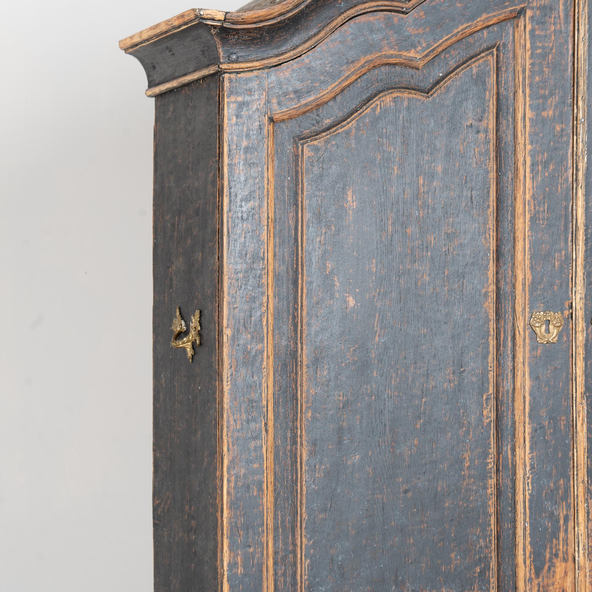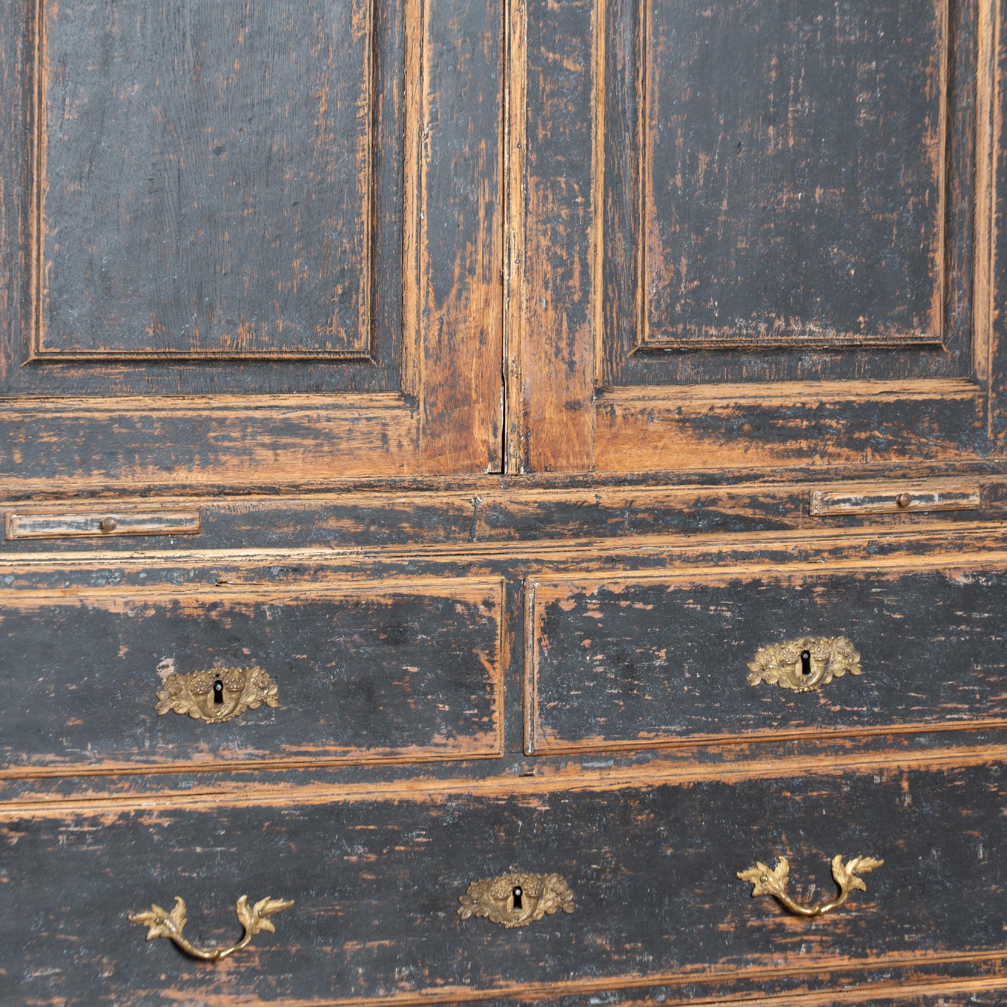 Late 18th century Swedish wedding cabinet crafted in pine. The cabinet features a black painted finish that was applied later in its life but has aged over time. The heavily distressed surface reveals areas of natural pine beneath, adding depth and character.
