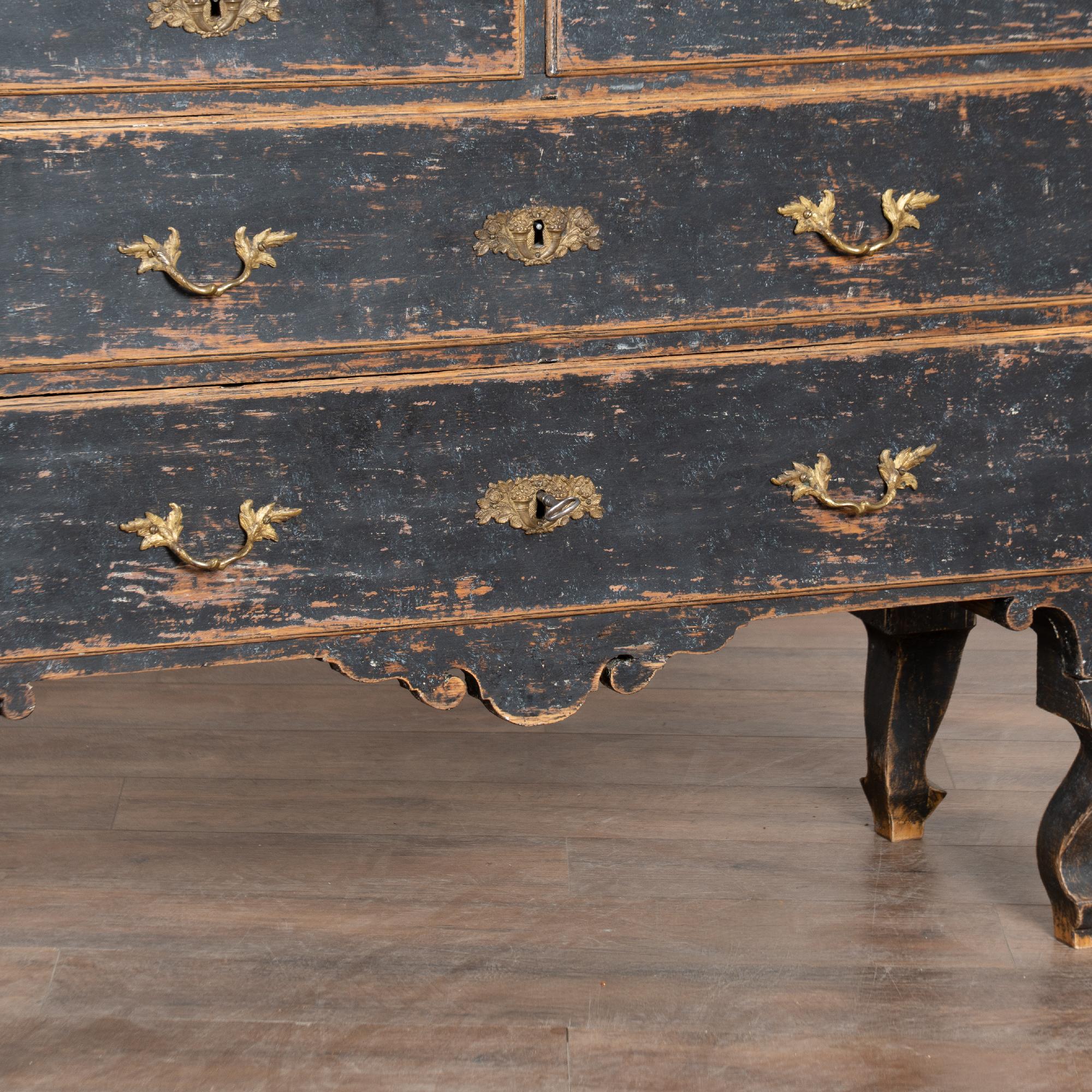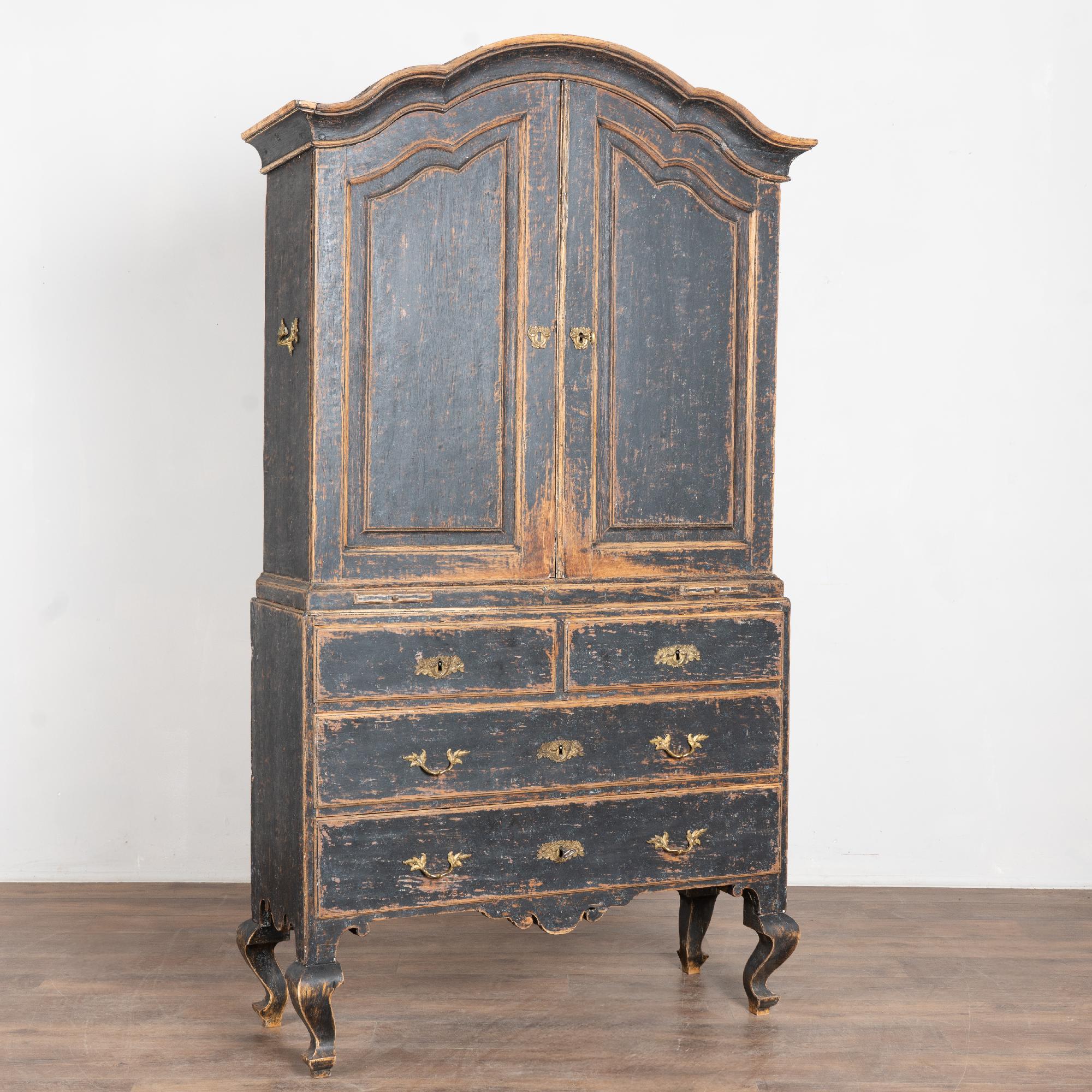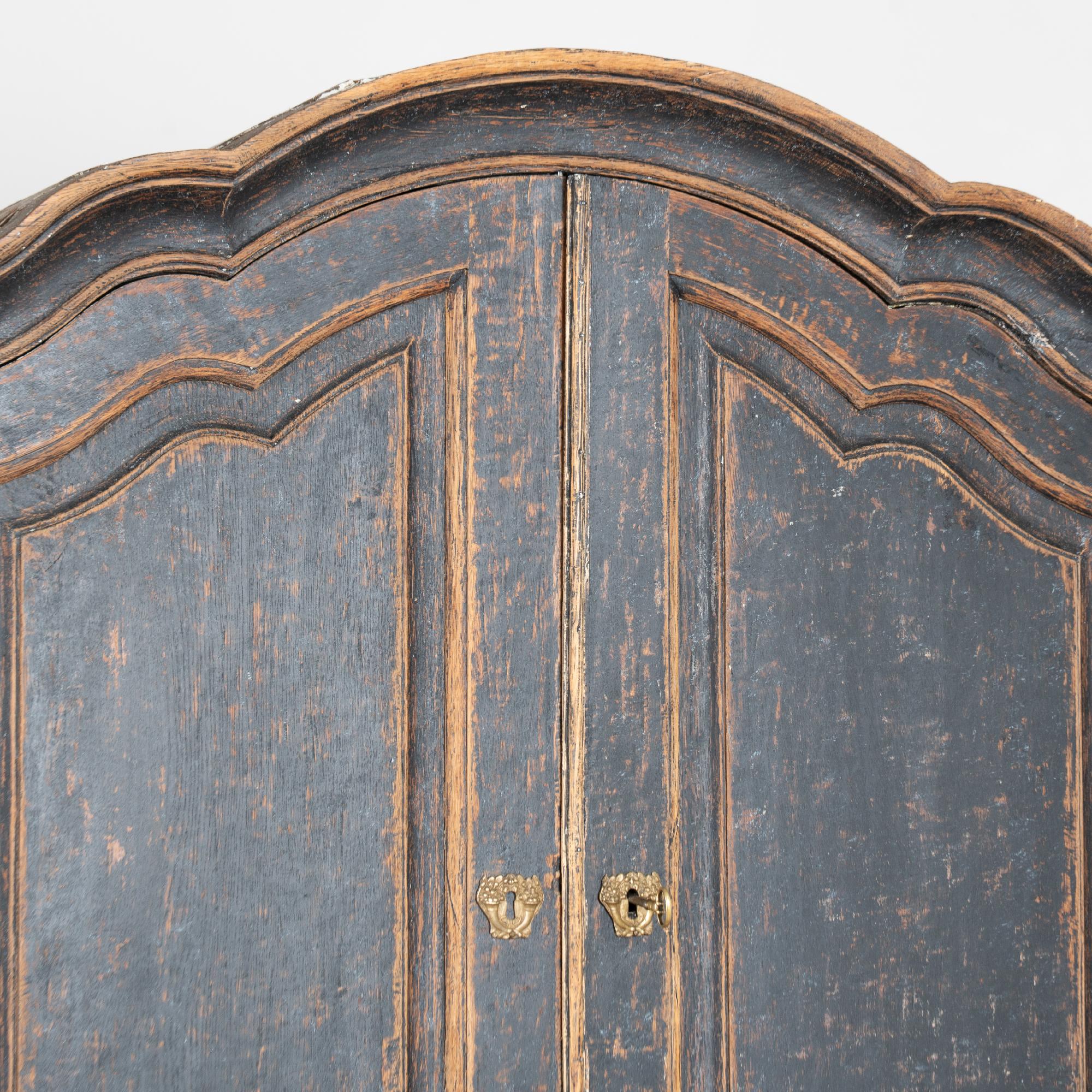 Late 18th century Swedish wedding cabinet crafted in pine. The cabinet features a black painted finish that was applied later in its life but has aged over time. The heavily distressed surface reveals areas of natural pine beneath, adding depth and character.
