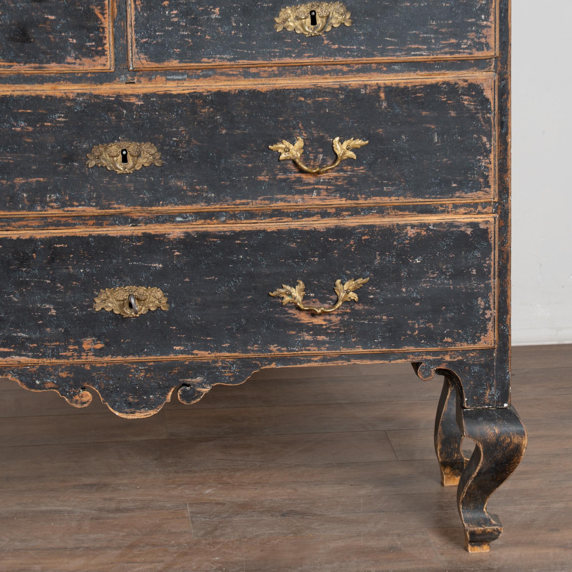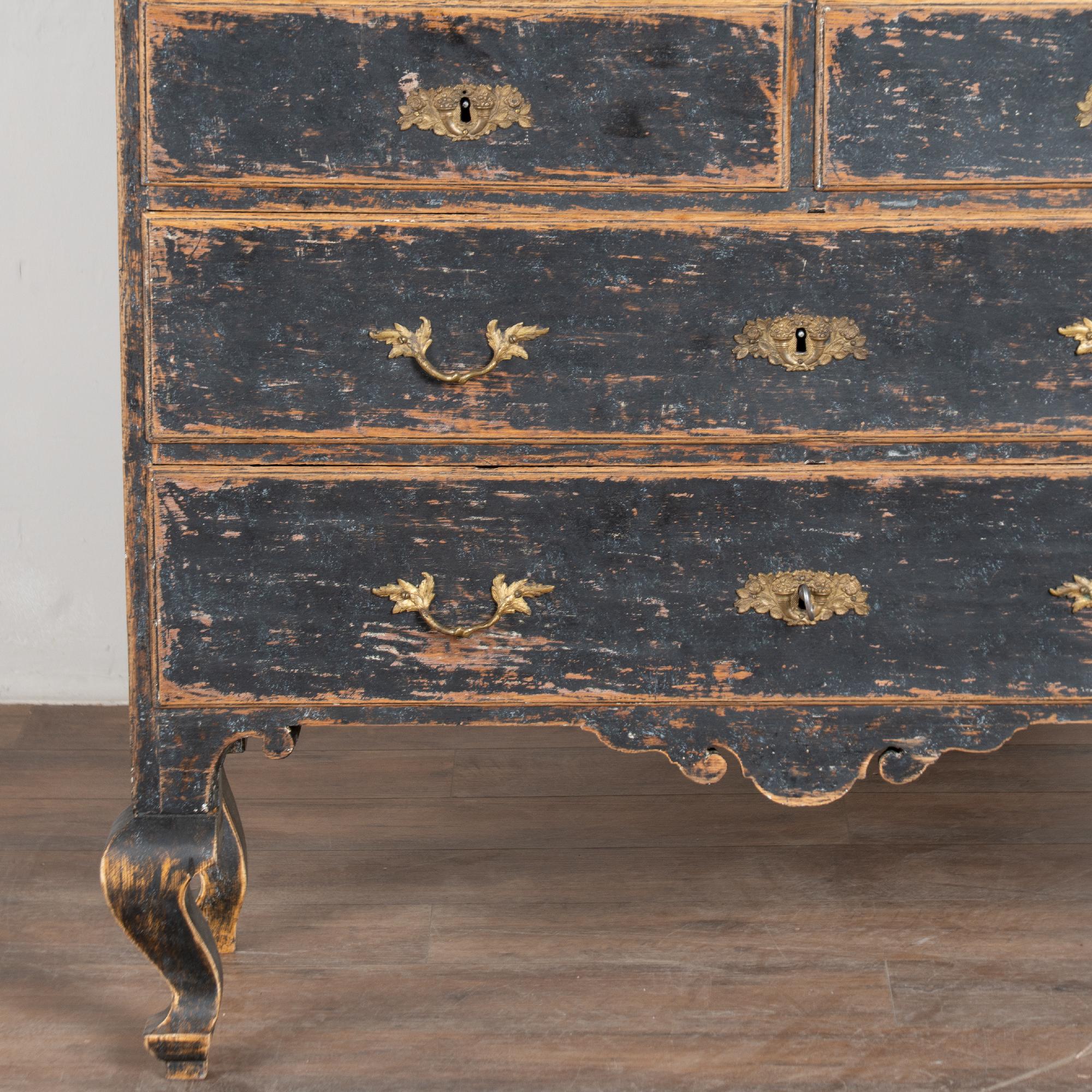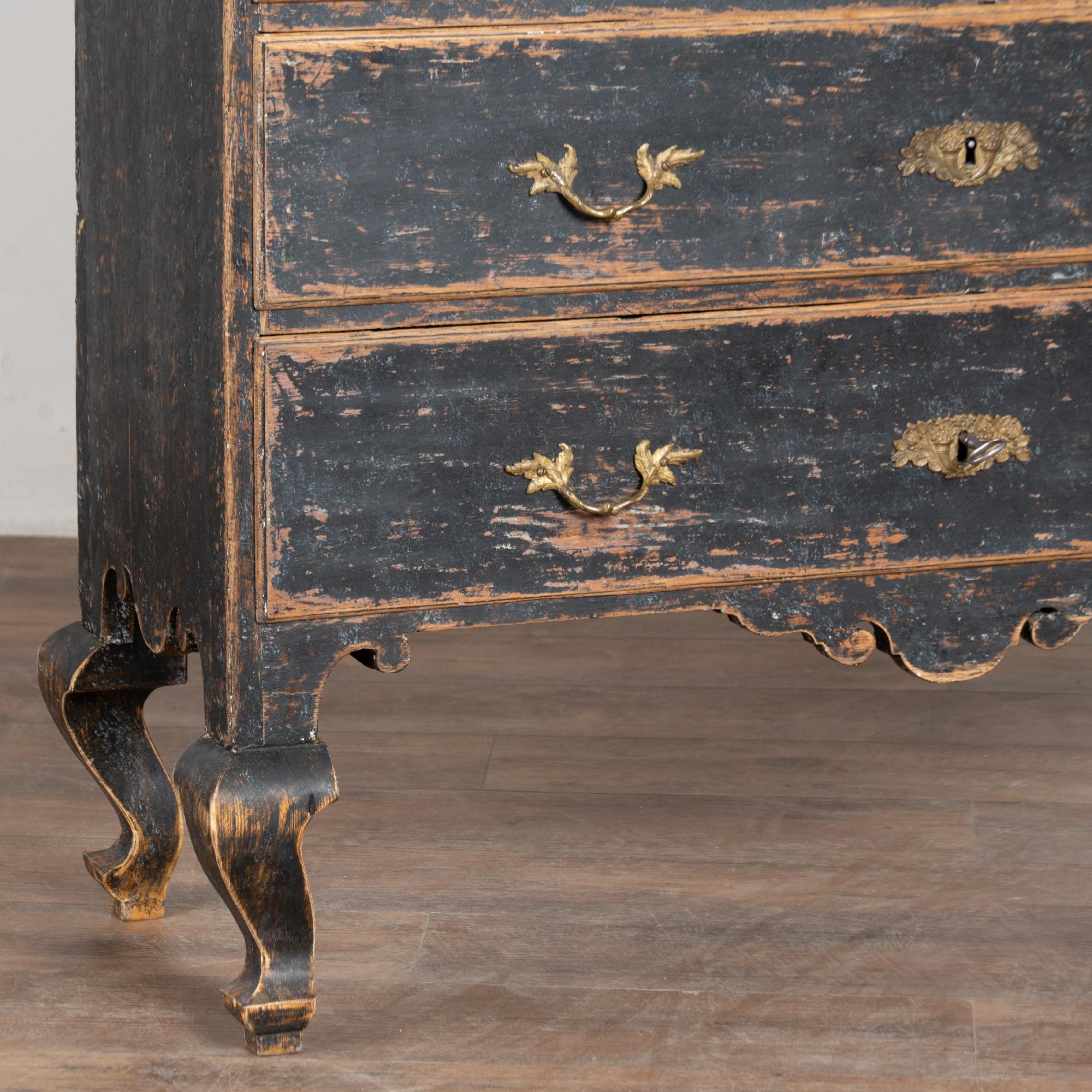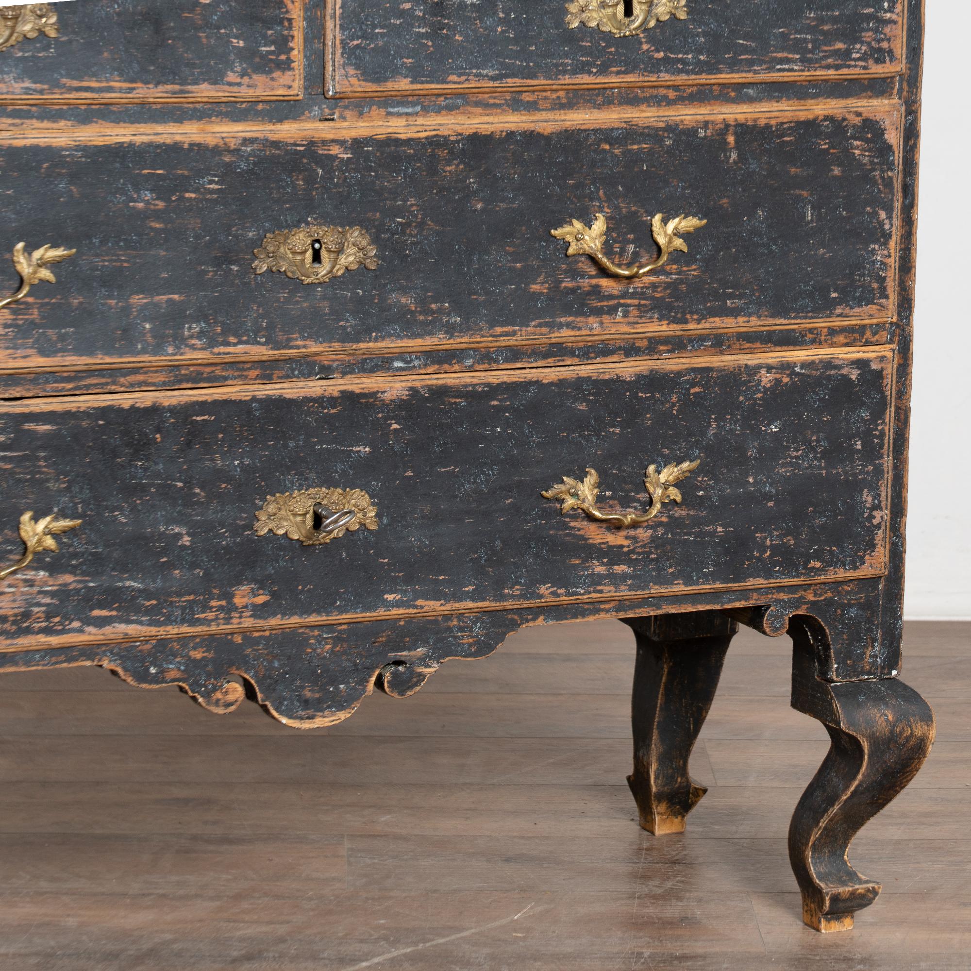 Late 18th century Swedish wedding cabinet crafted in pine. The cabinet features a black painted finish that was applied later in its life but has aged over time. The heavily distressed surface reveals areas of natural pine beneath, adding depth and character.
