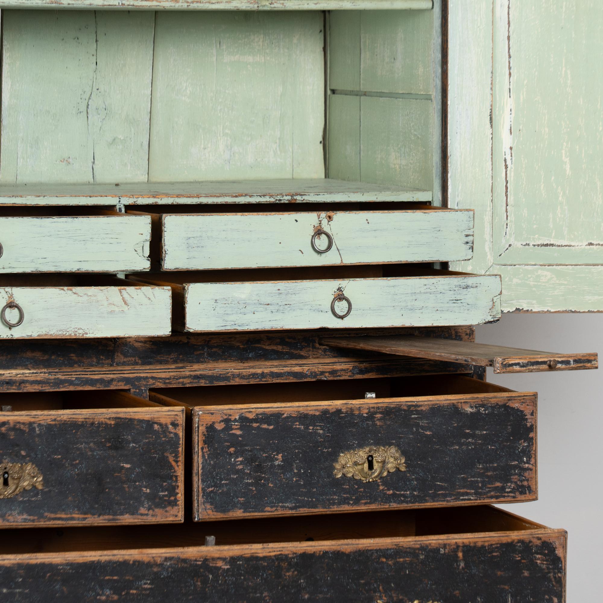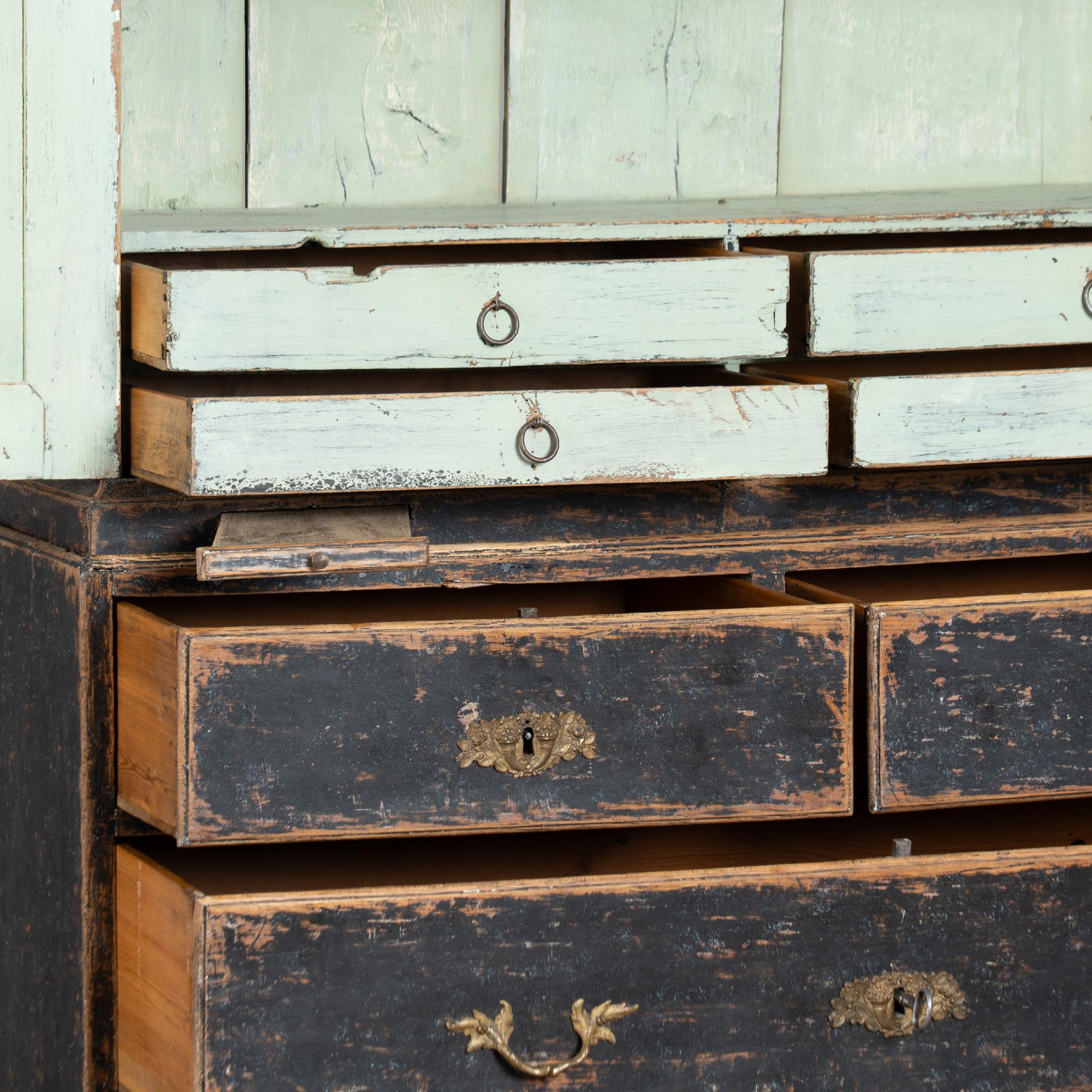 The upper cabinet doors open with a key and reveal a pale mint green painted interior that was applied more recently. Inside are two shelves and four interior drawers providing additional storage.