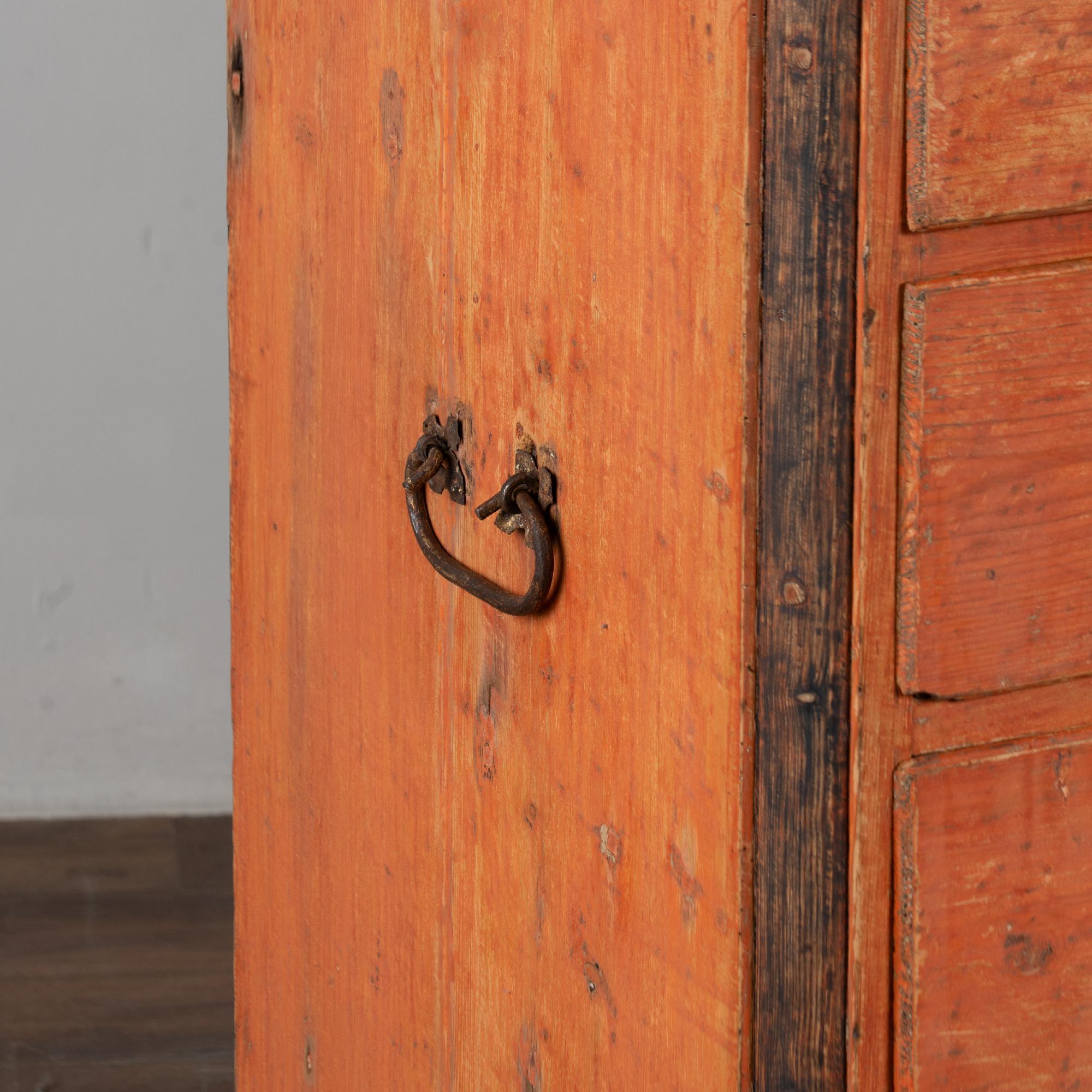 The original painted surface has been gently scraped and presents a distinctive soft tangerine tone with heavy distress revealing areas of natural pine beneath. Half column details and feet are finished in contrasting black.