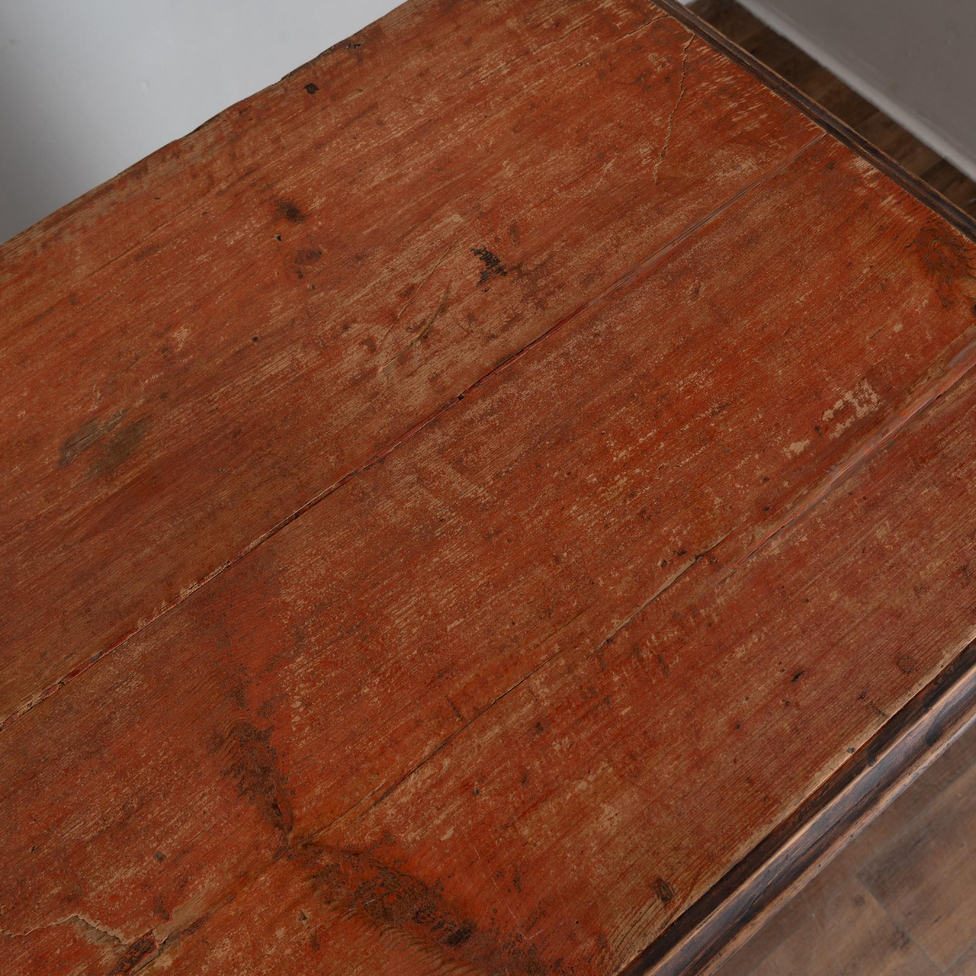 The top shows older cracks, nicks, stains, and repairs related to separation of the planks. Similar age-related separation is visible in the drawer bottoms and along the back.
