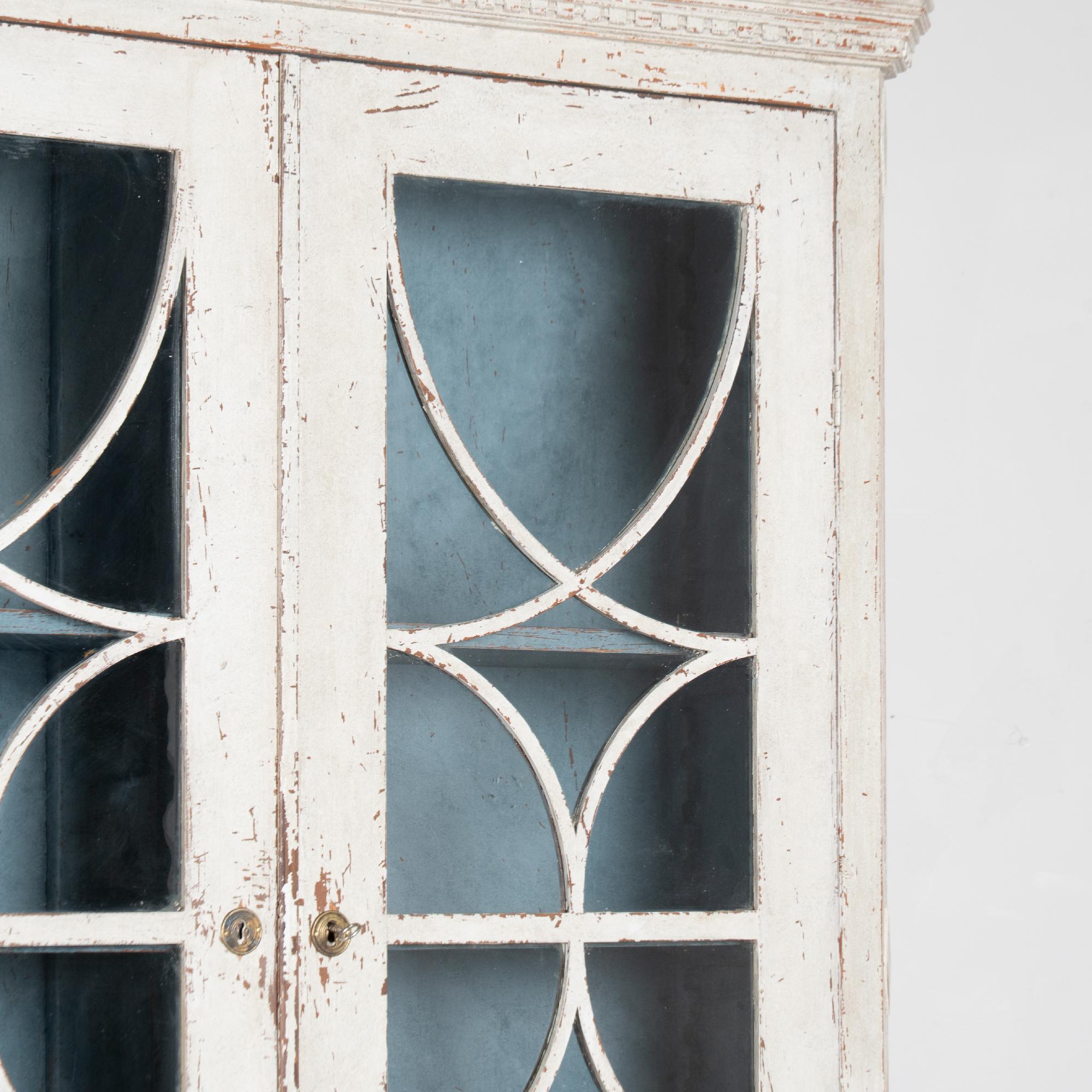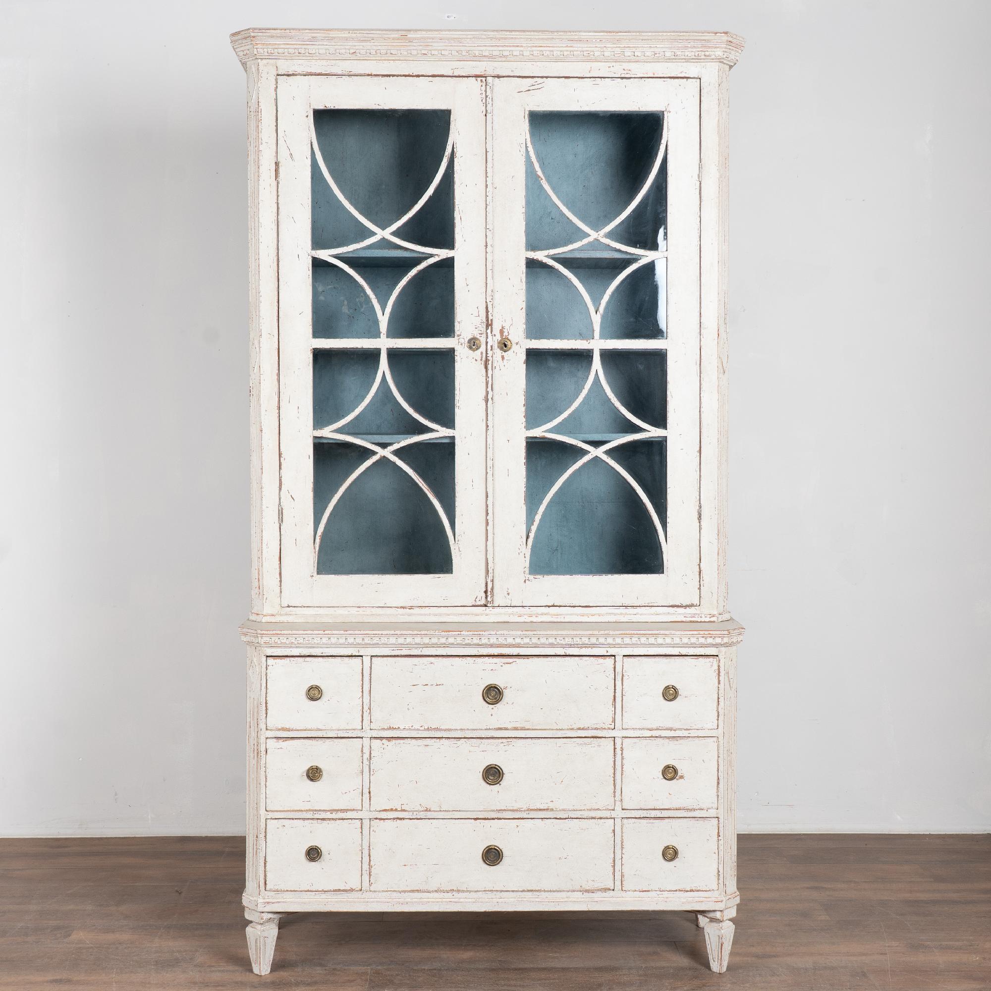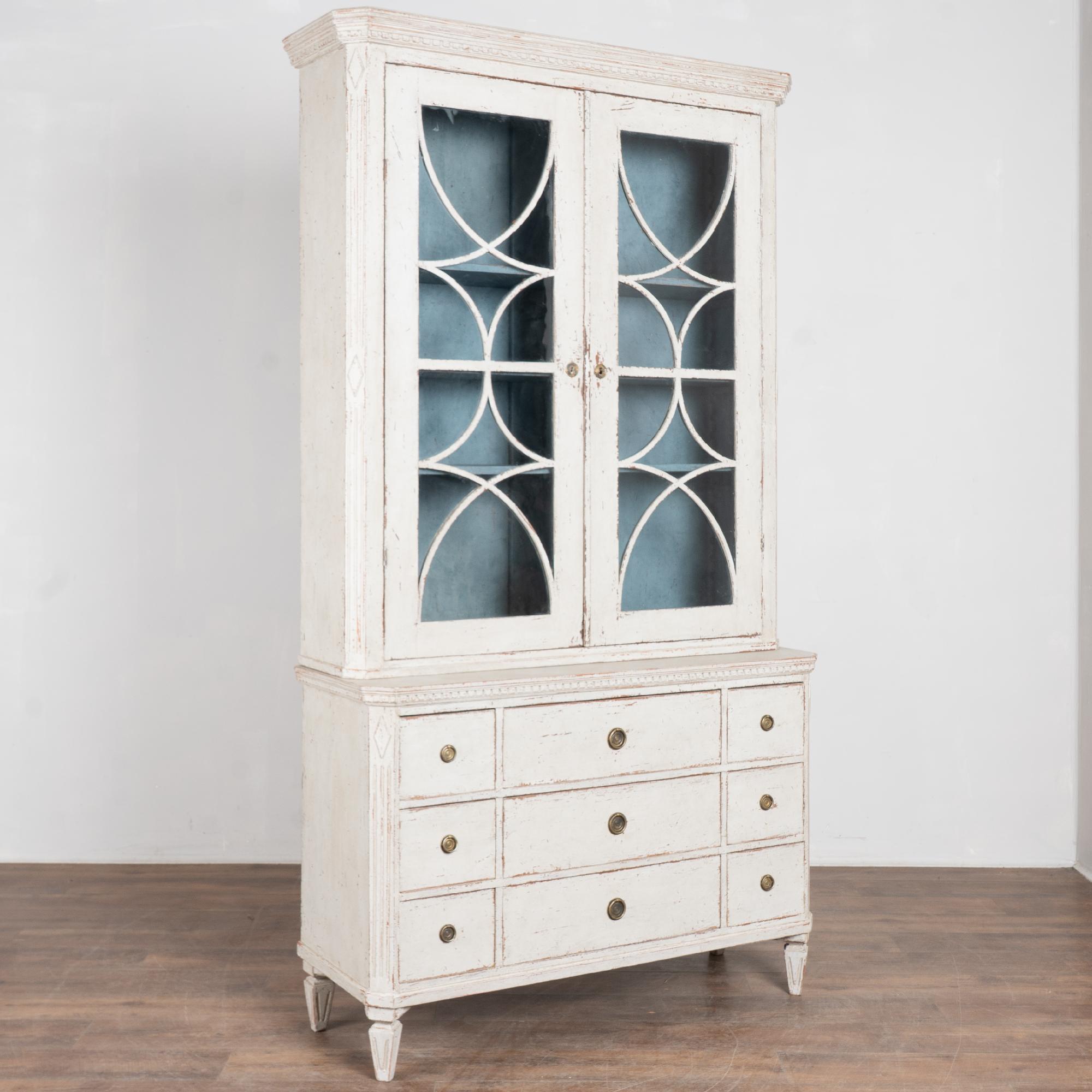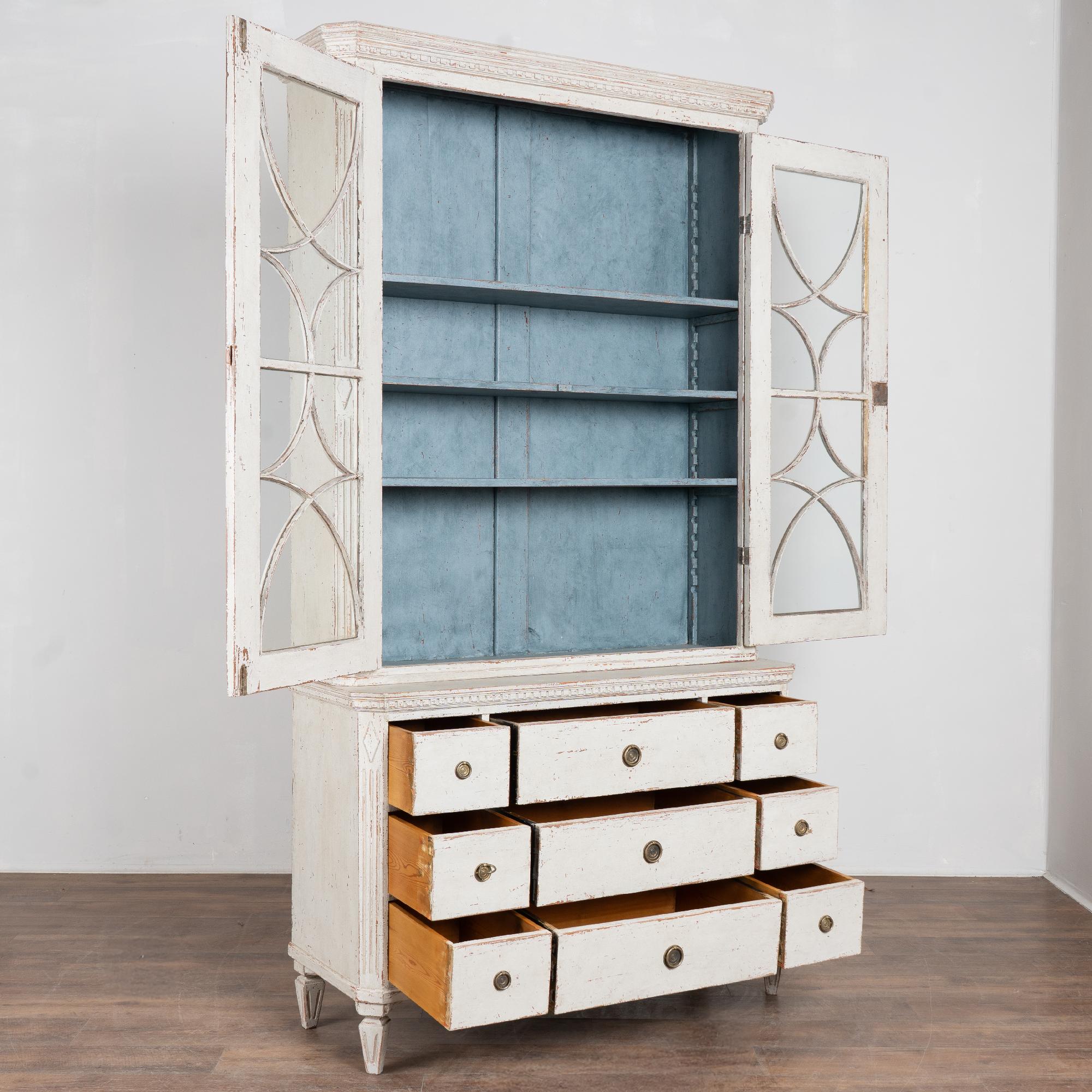 The upper cabinet includes glass pane doors with decorative circular panel "astragal" accents creating strong visual interest. The cabinet has a newer professionally applied antique white painted finish in keeping with the Gustavian style.