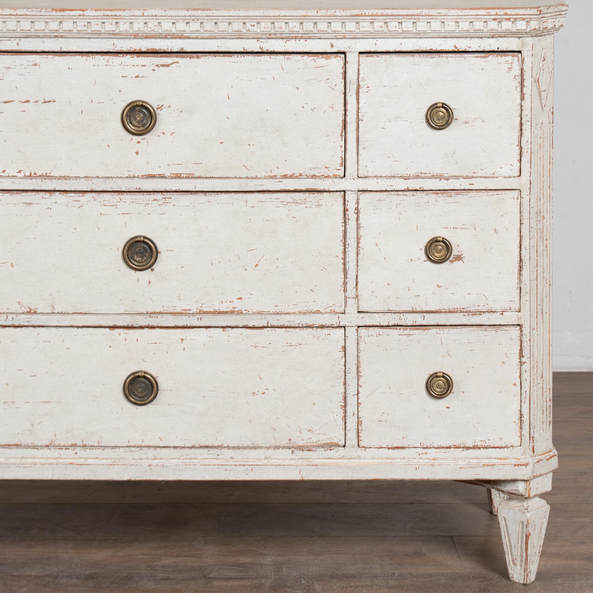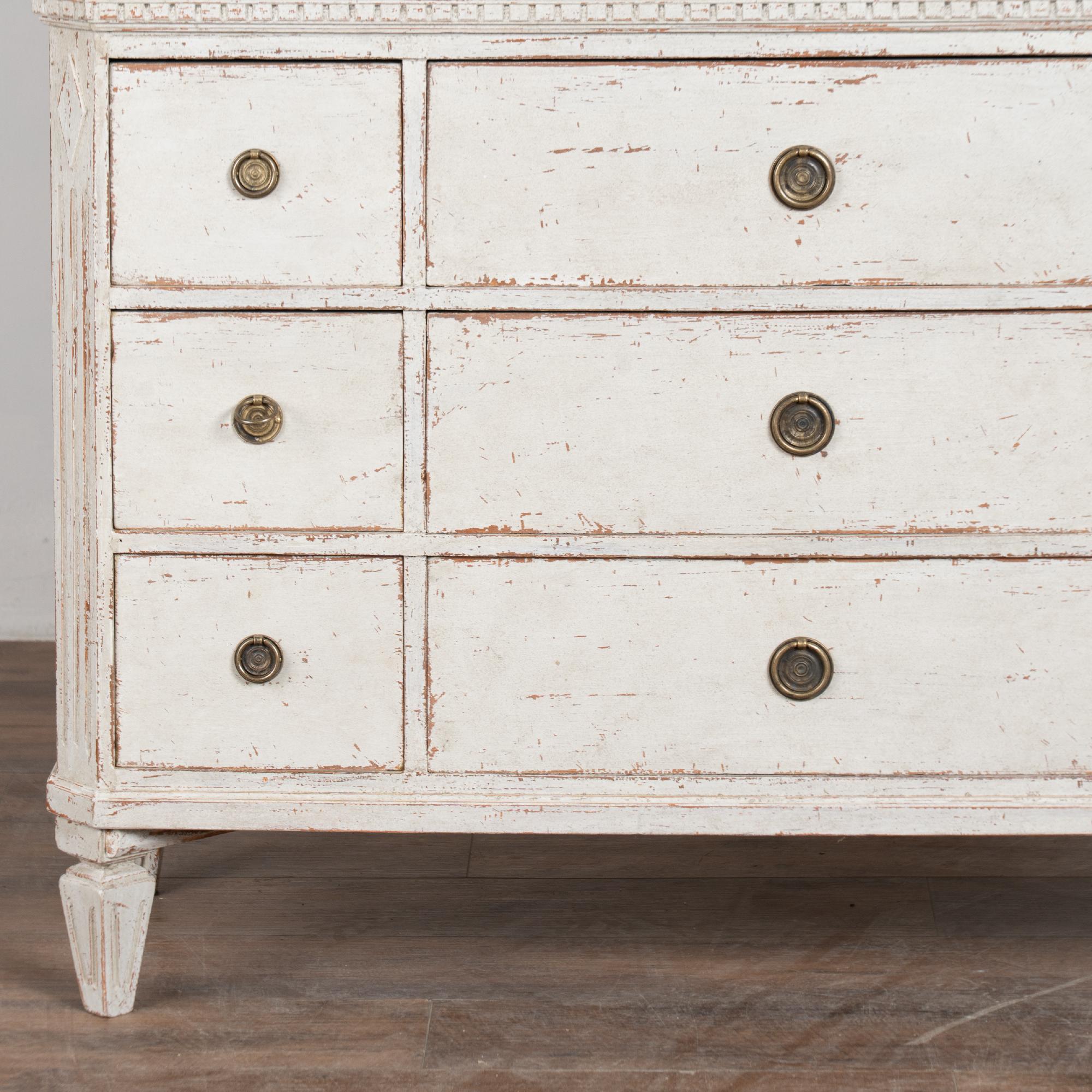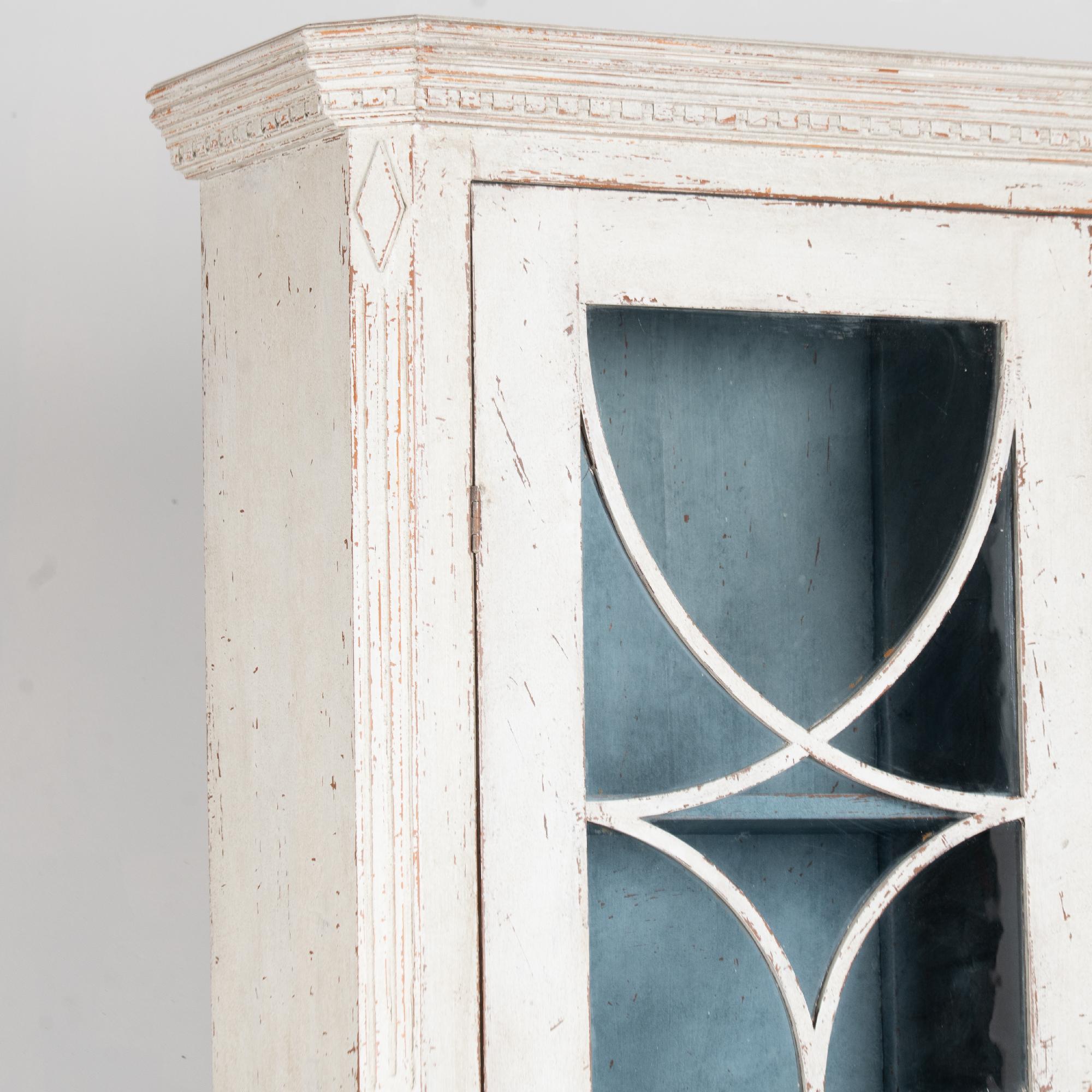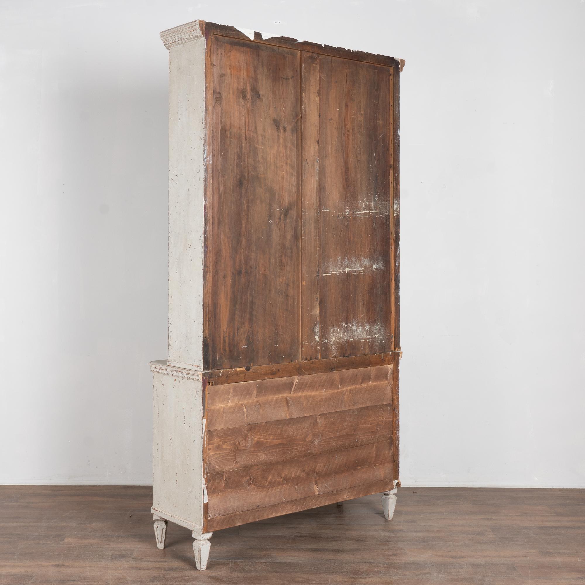 The upper cabinet includes glass pane doors with decorative circular panel "astragal" accents creating strong visual interest. The cabinet has a newer professionally applied antique white painted finish in keeping with the Gustavian style.