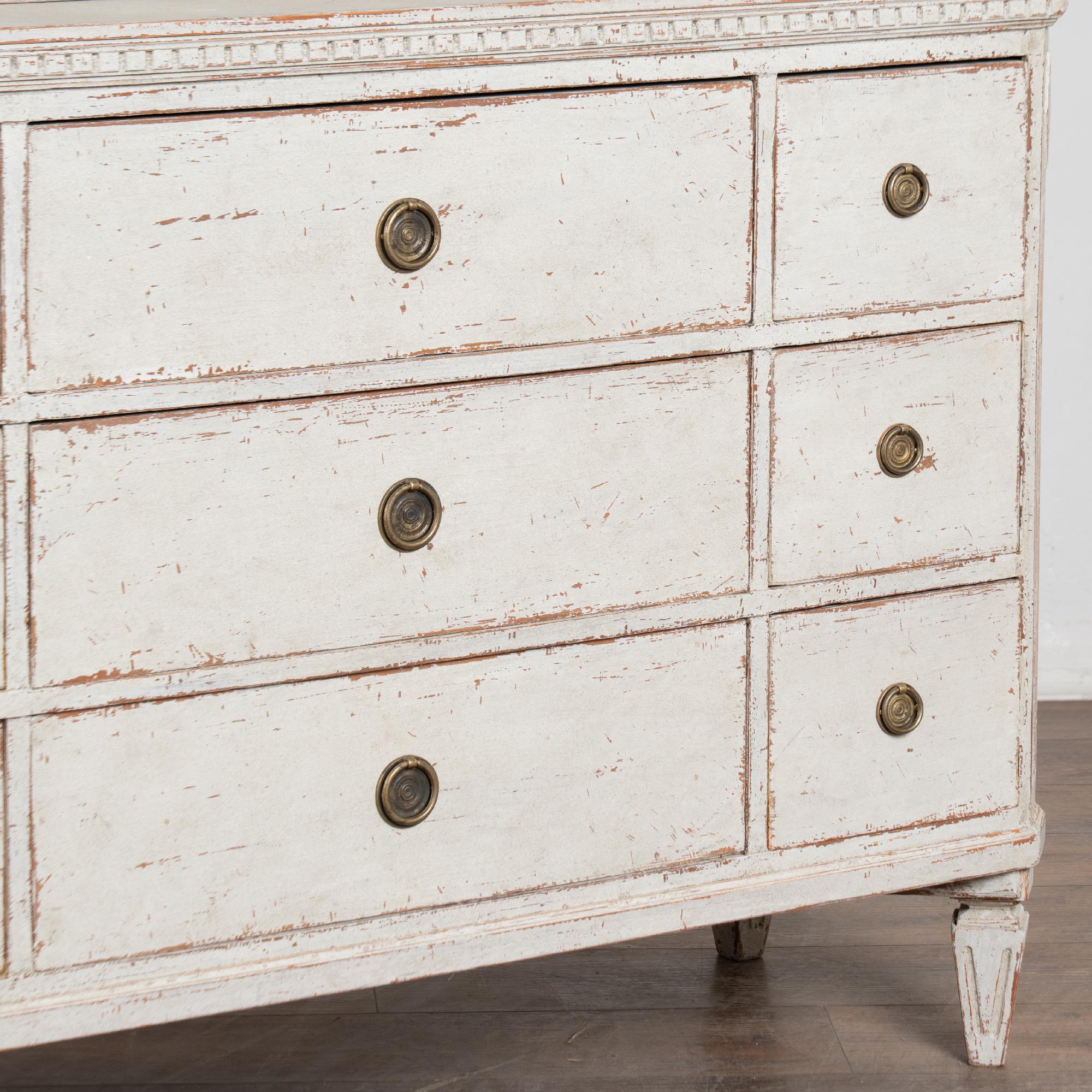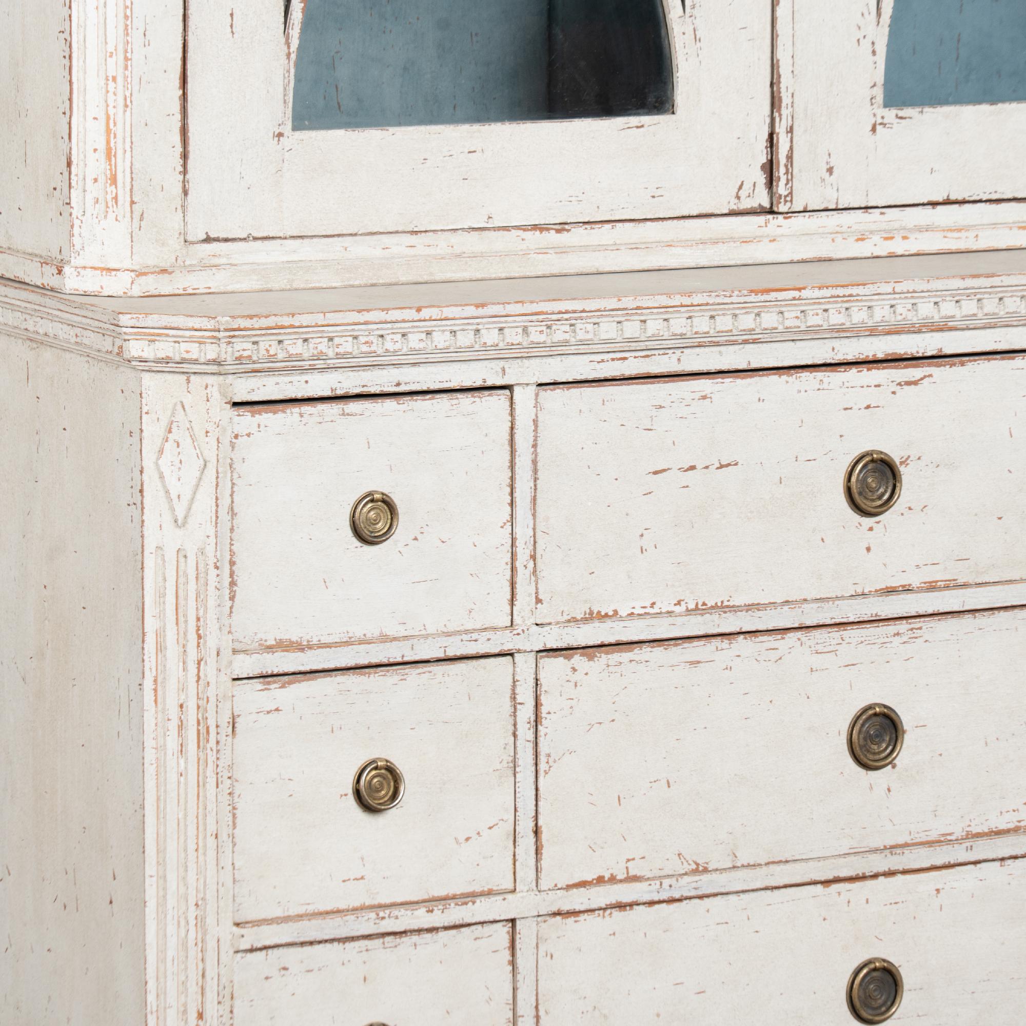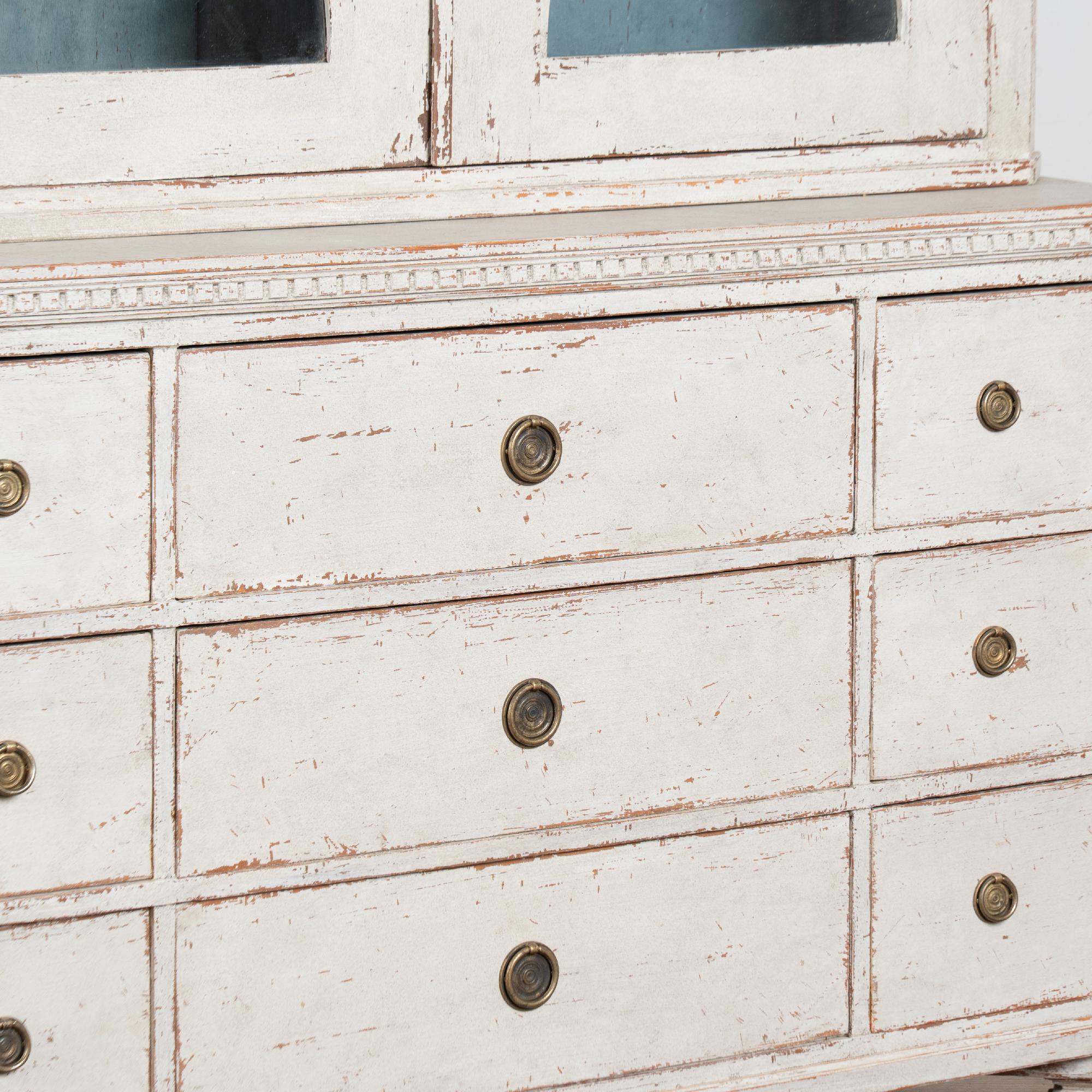 19th century Swedish bookcase or display cabinet crafted in pine. The lower section features nine drawers with a larger central drawers flanked by smaller drawers.