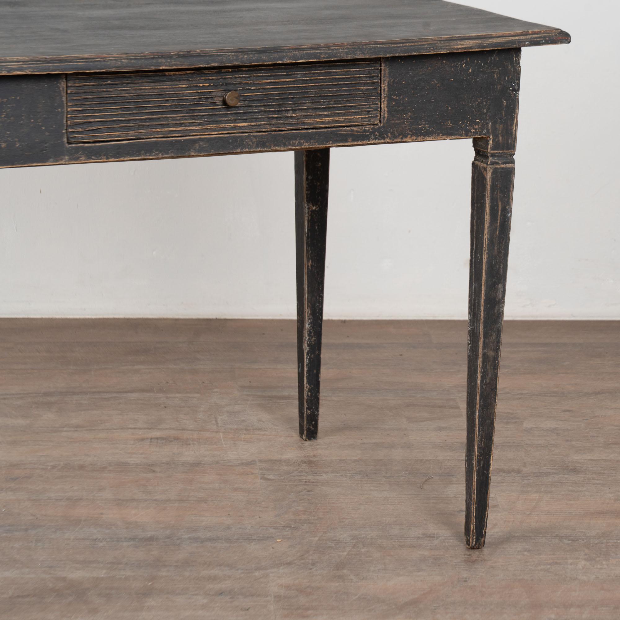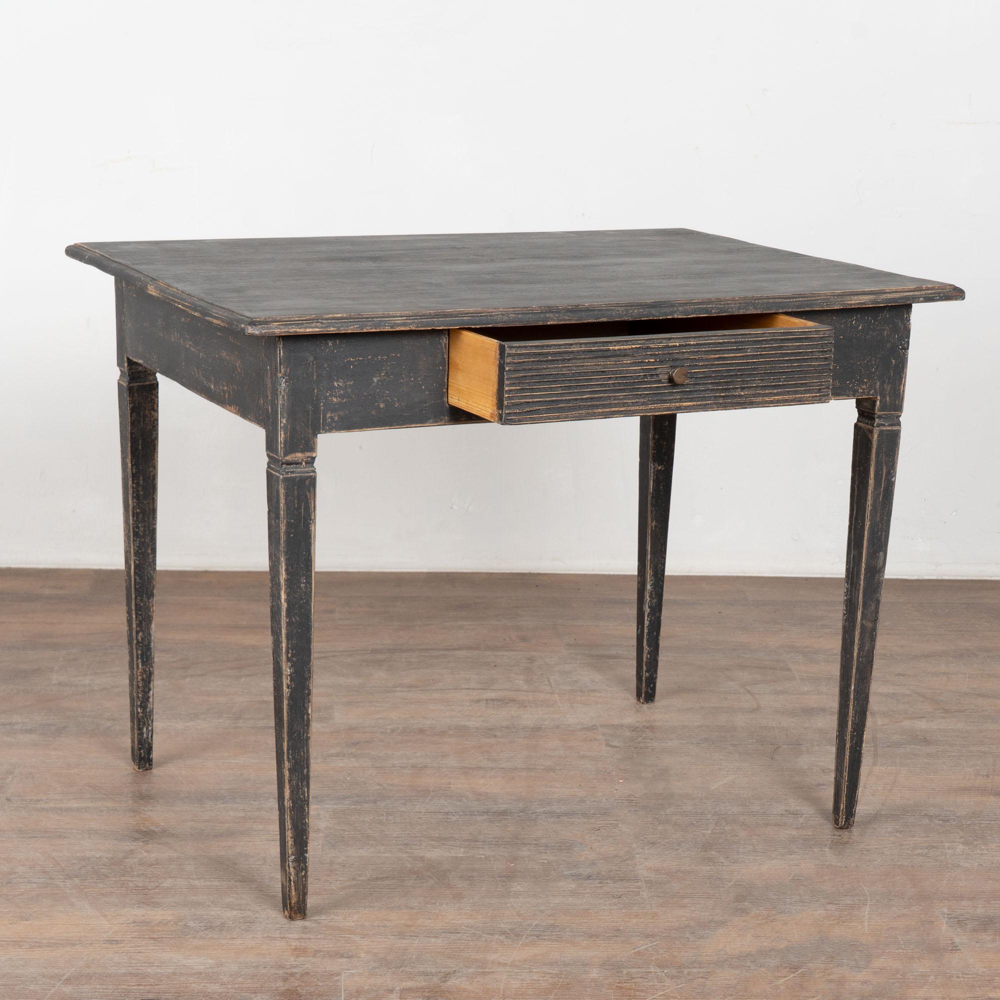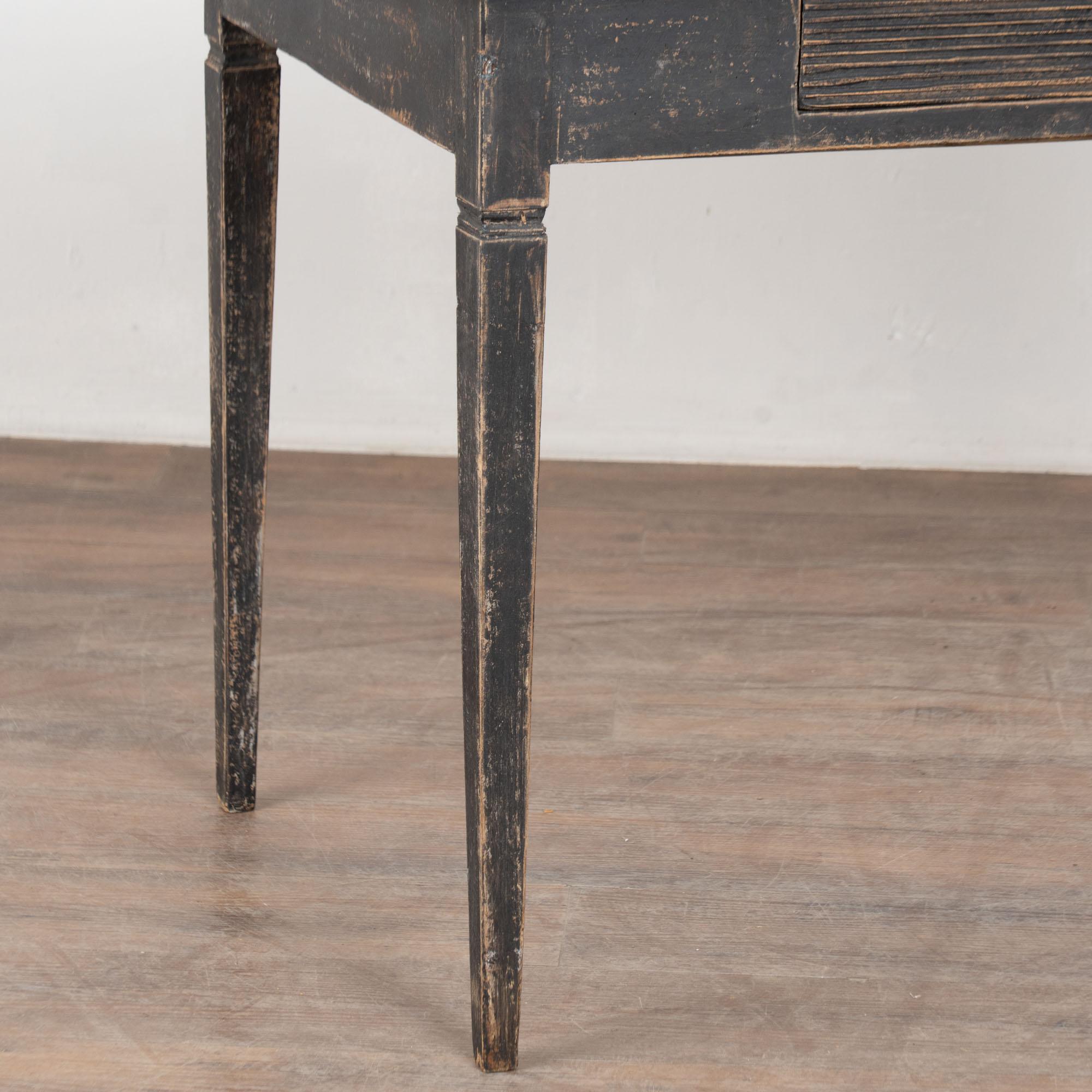 Antique Swedish Gustavian Black Painted Side Table With Drawer. Tapered legs and horizontal fluted carving along single drawer. May also serve as nightstand.