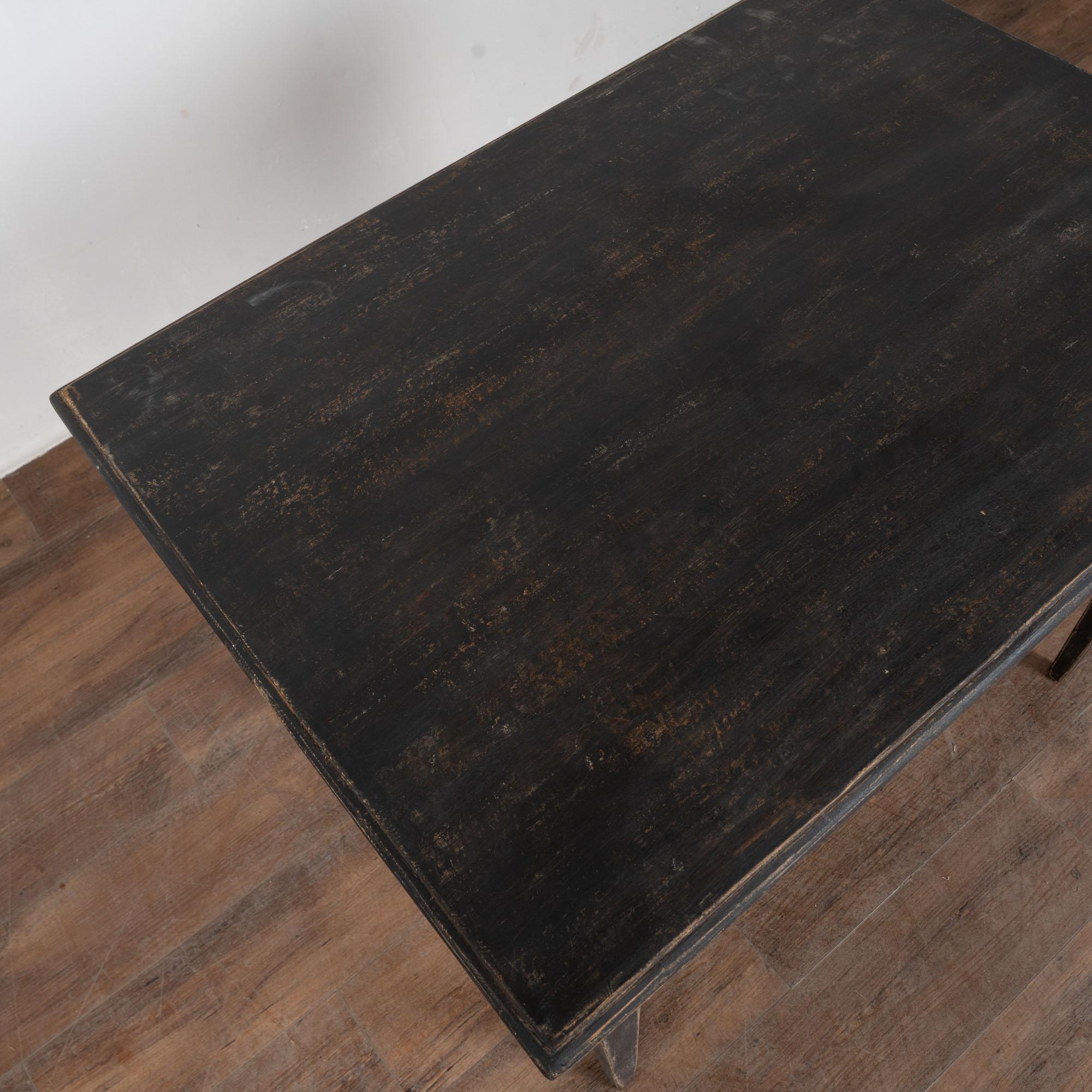 Distress to the black painted finish reveals natural pine below and adds to the aged character of this side table.
