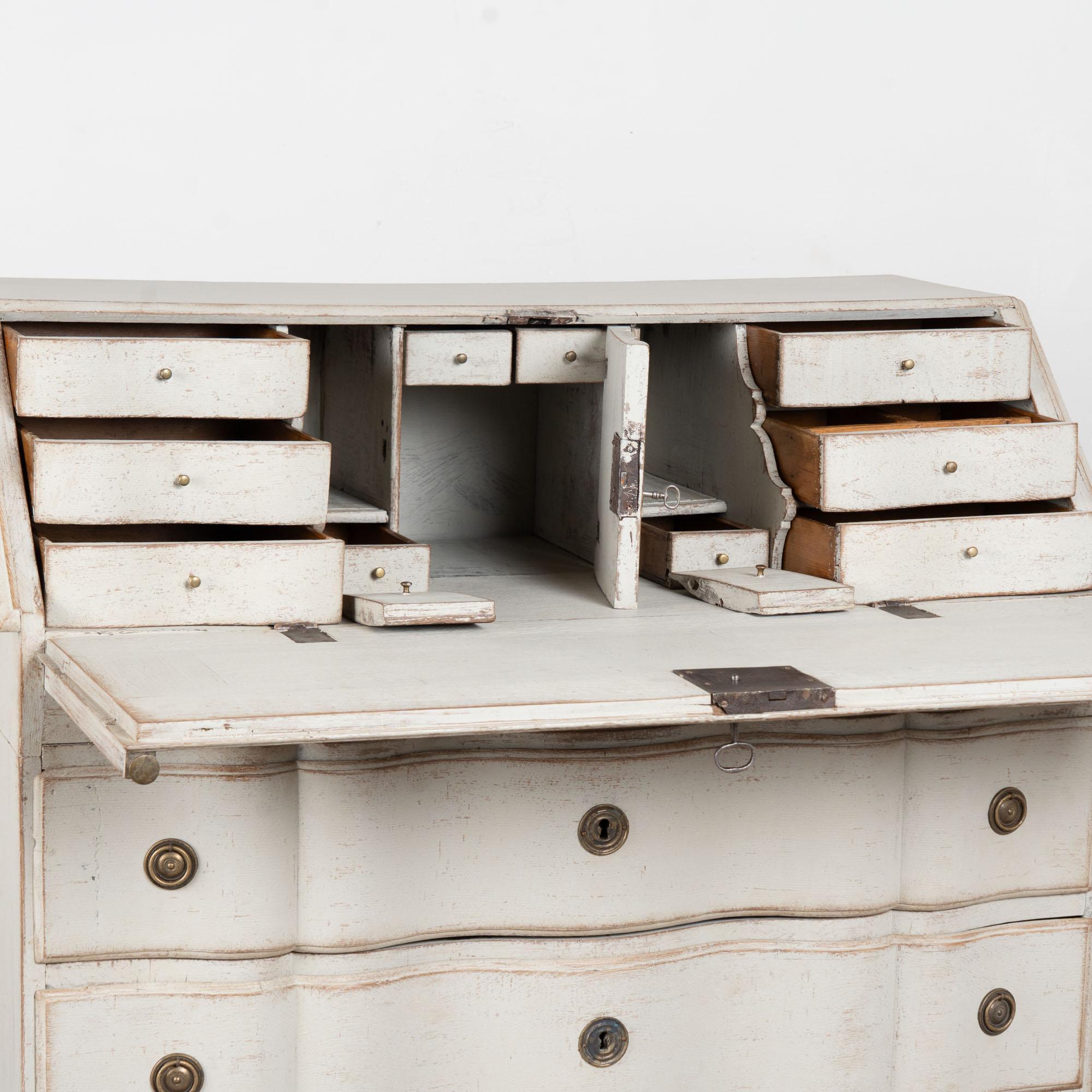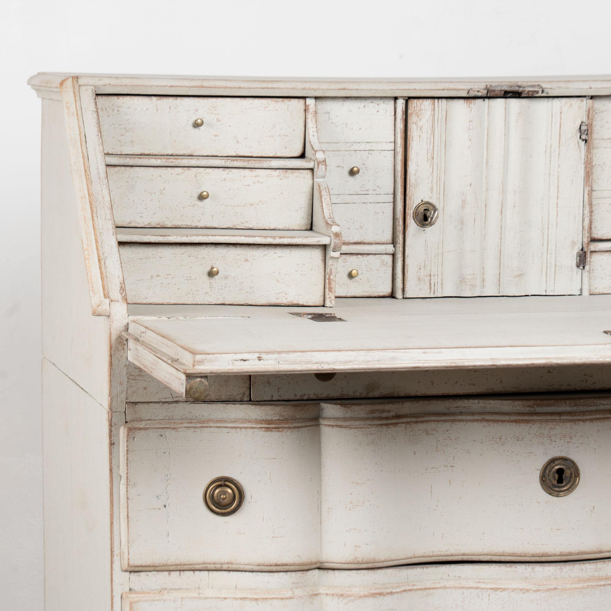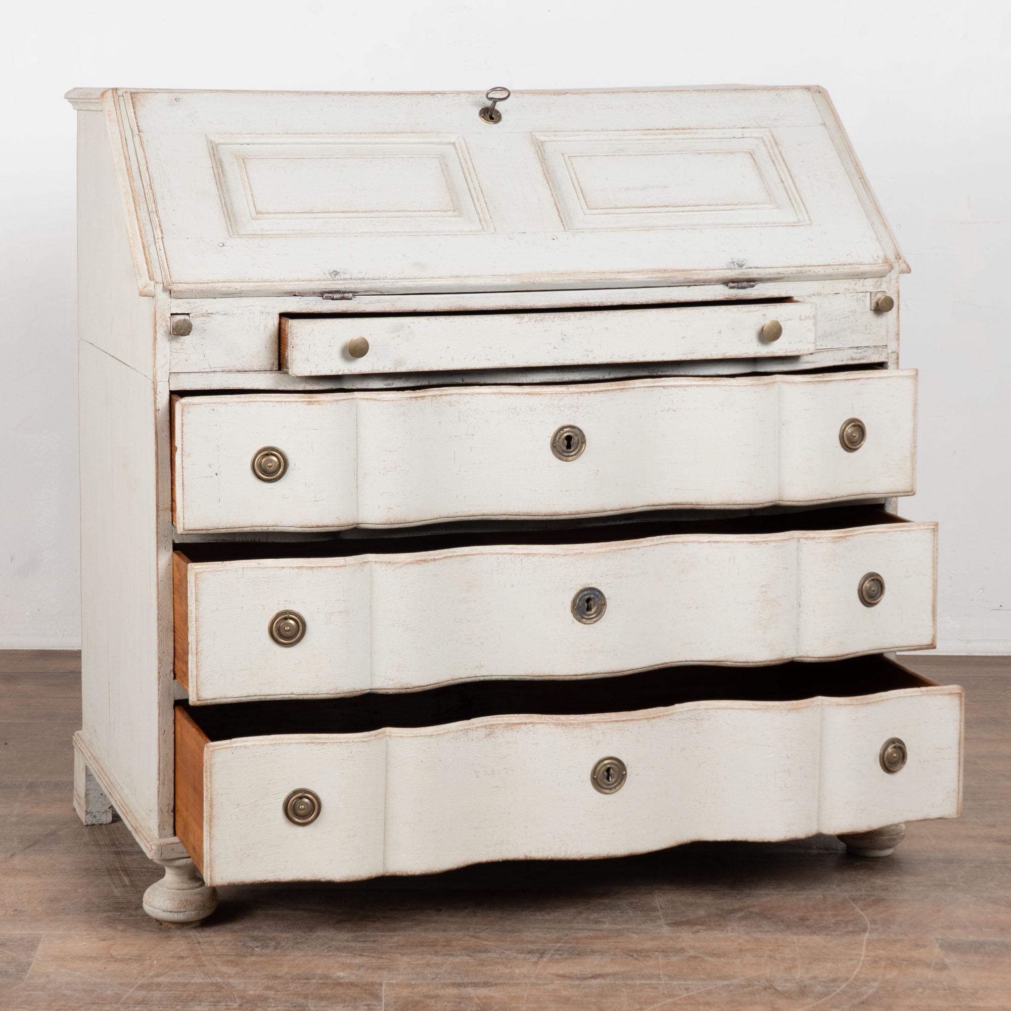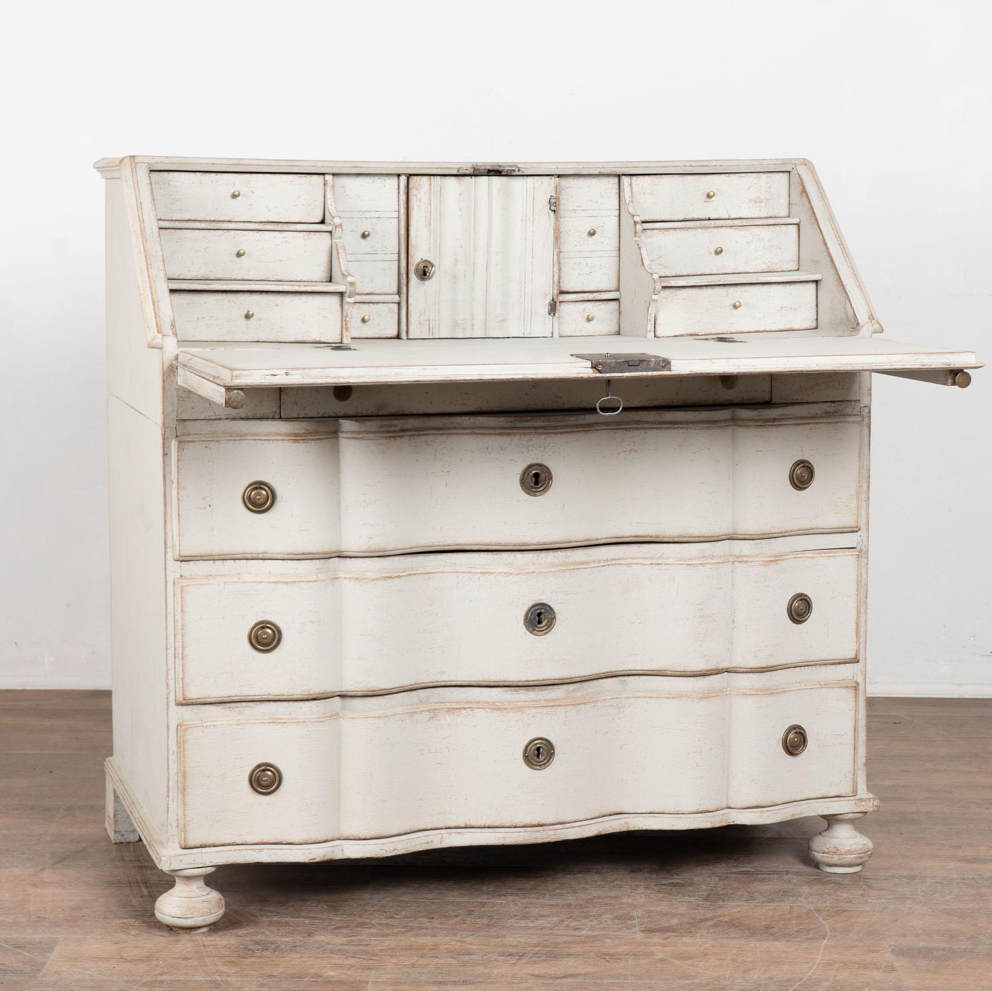 Early 19th-century Swedish oak secretary bureau with a newer professionally applied antique white painted exterior with pale gray undertones. The serpentine front enhances the visual appeal.