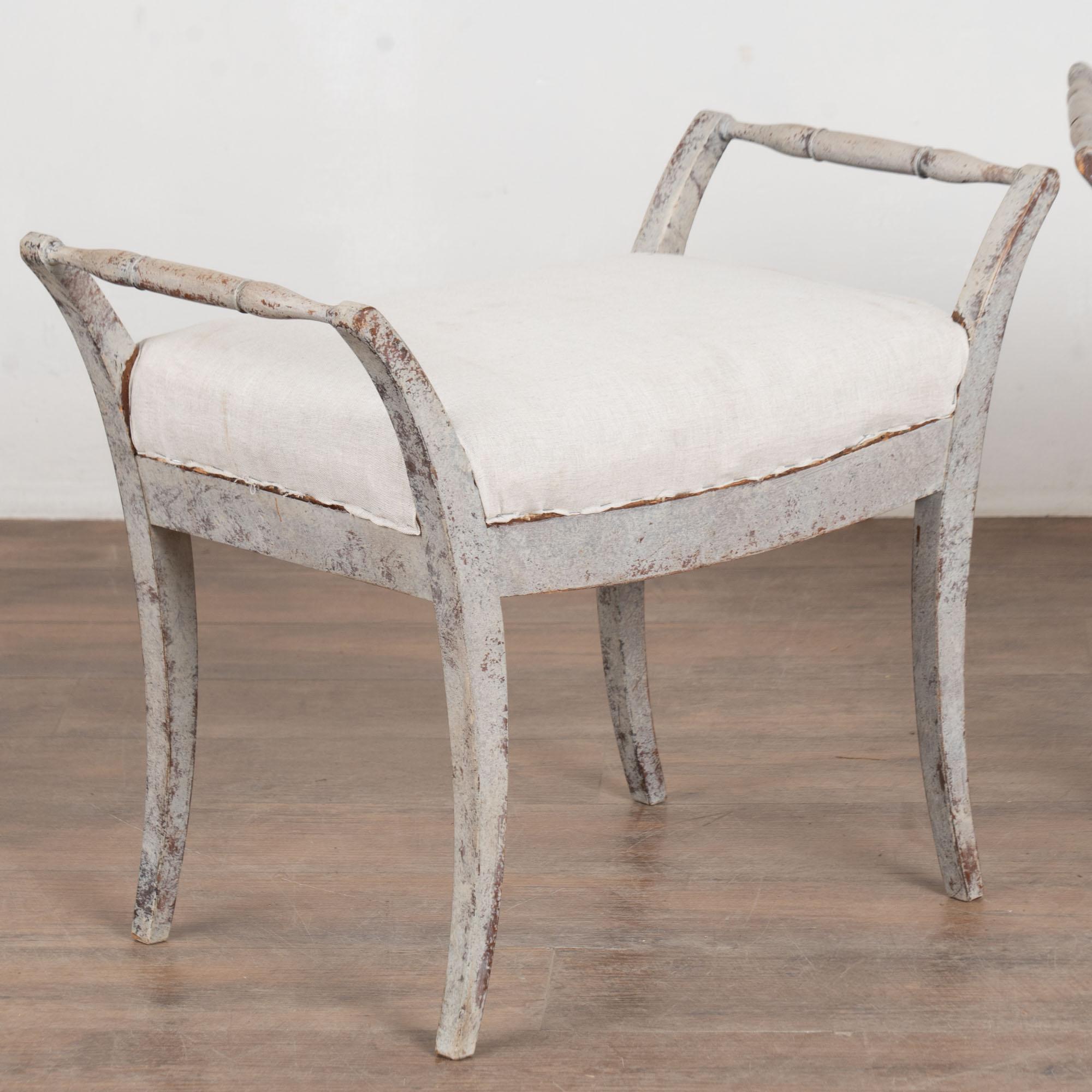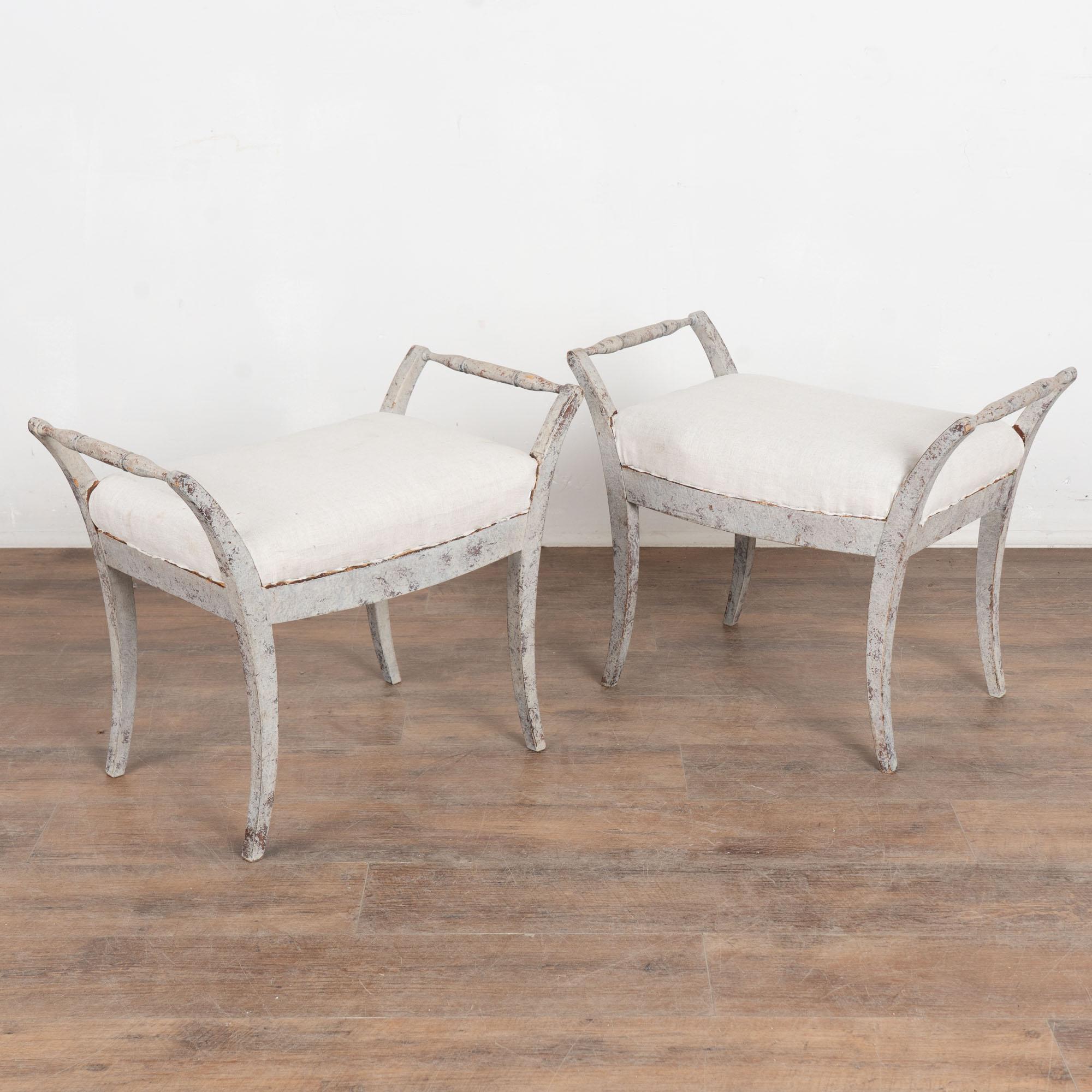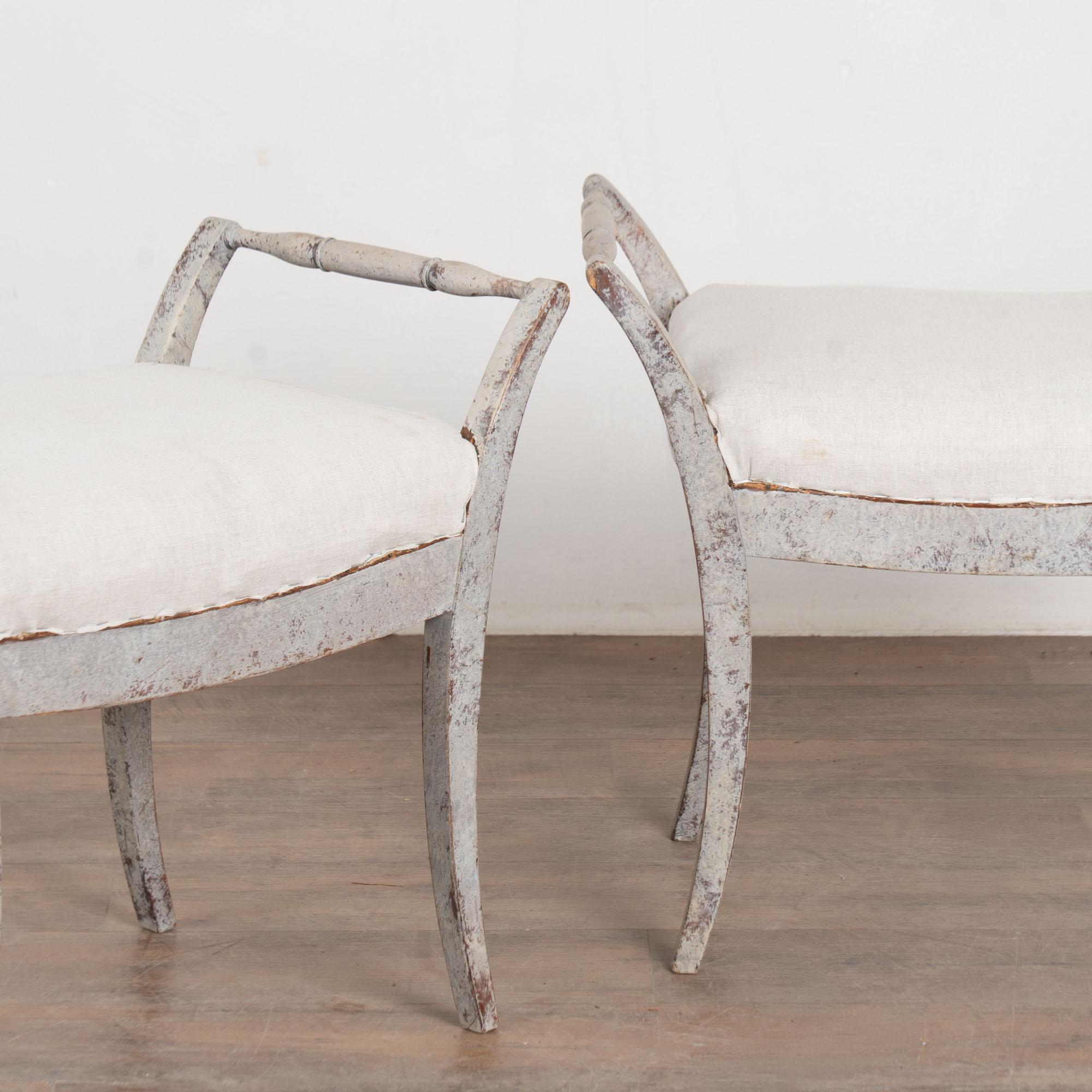 This lovely set of Swedish stools or tabourets have graceful, slightly curved legs which add an elegant touch to the pair. The turned hand rests provide stability as well as balanced beauty. The aged patina of the later gray paint has been rubbed and distressed down to the natural wood, adding depth of character.