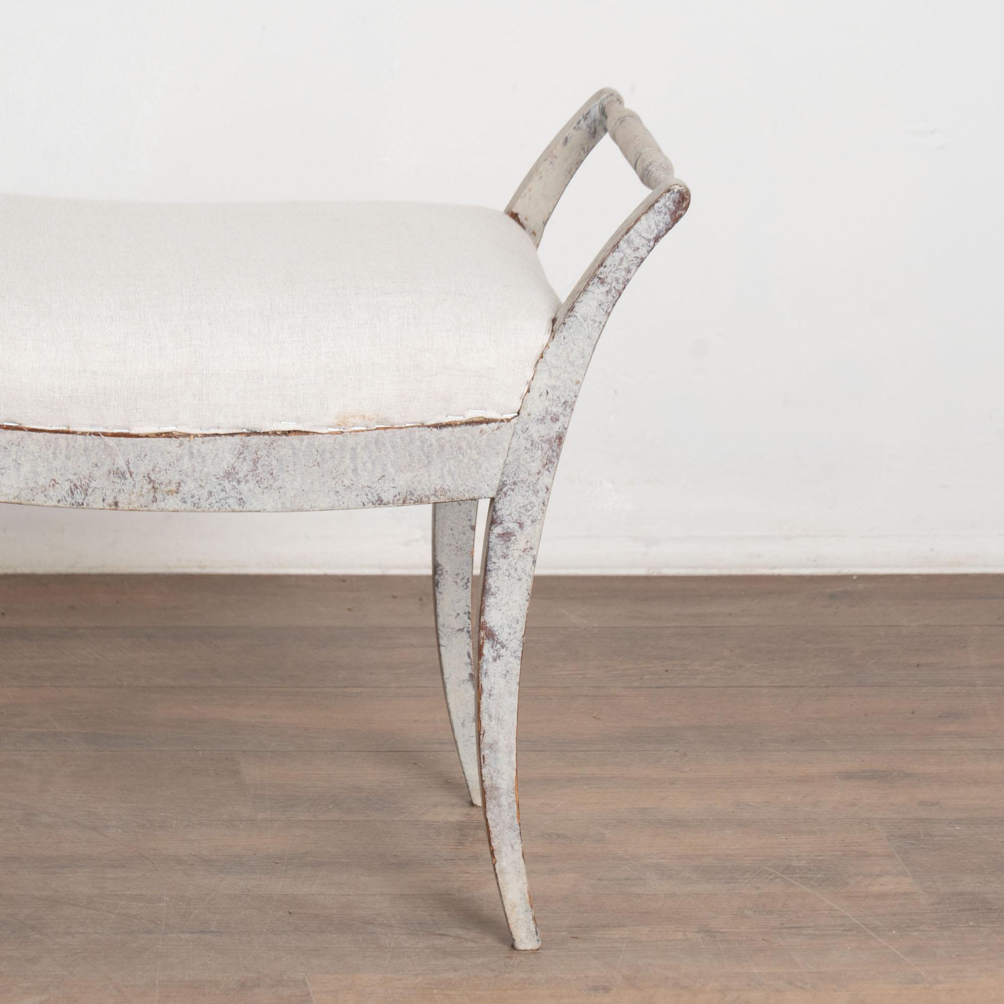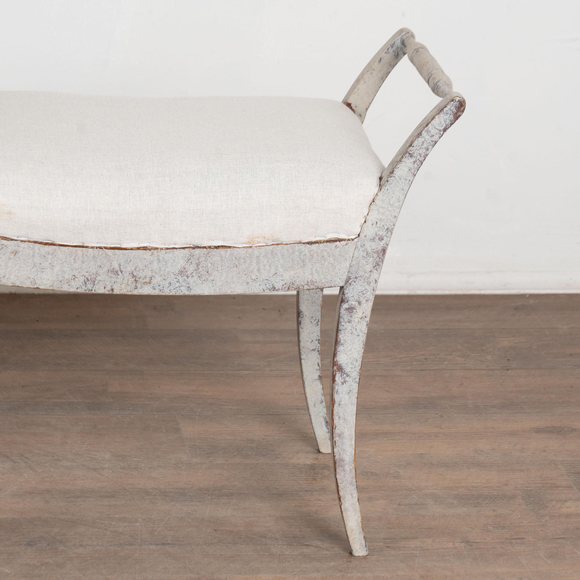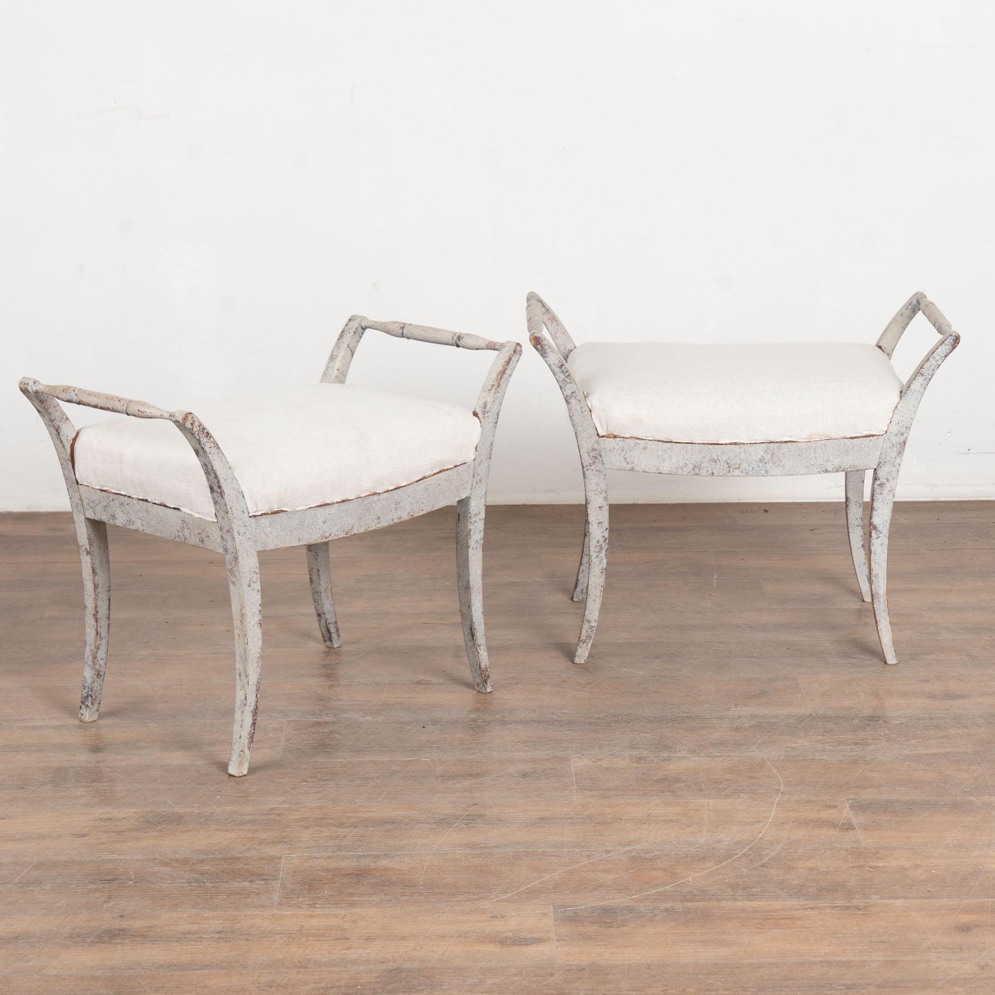 This lovely set of Swedish stools or tabourets have graceful, slightly curved legs which add an elegant touch to the pair. The turned hand rests provide stability as well as balanced beauty. The aged patina of the later gray paint has been rubbed and distressed down to the natural wood, adding depth of character.
