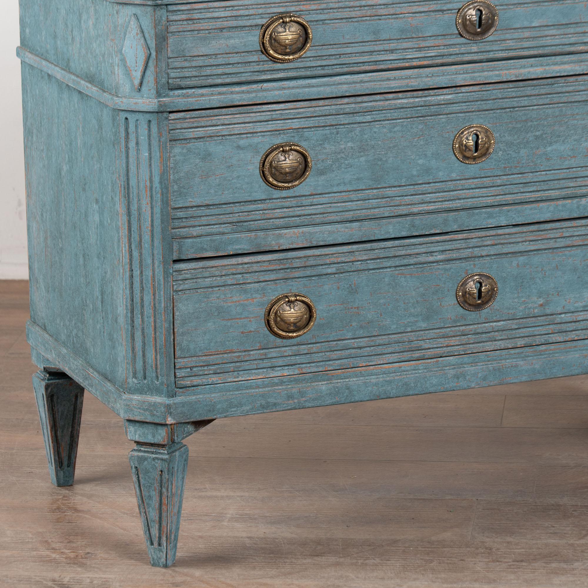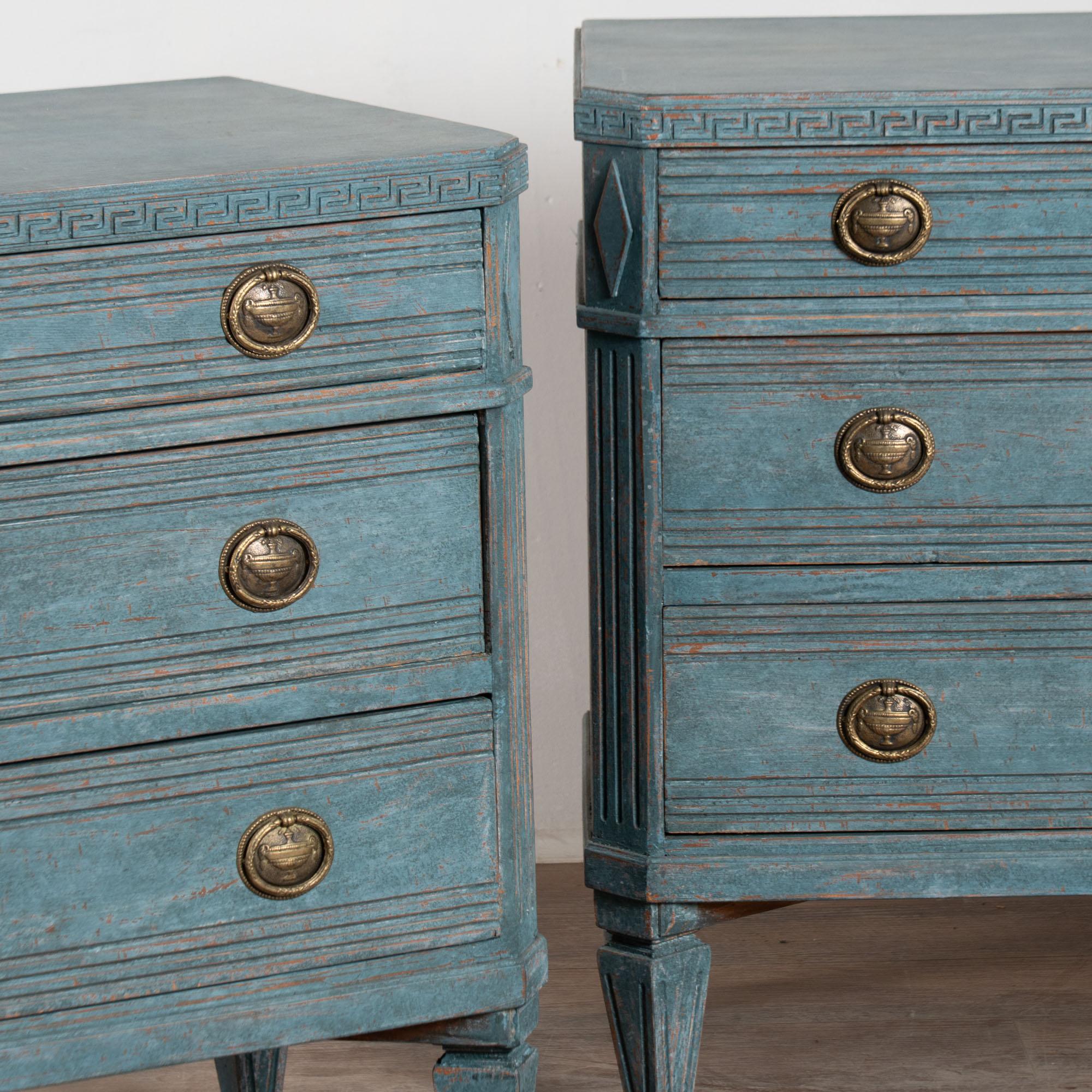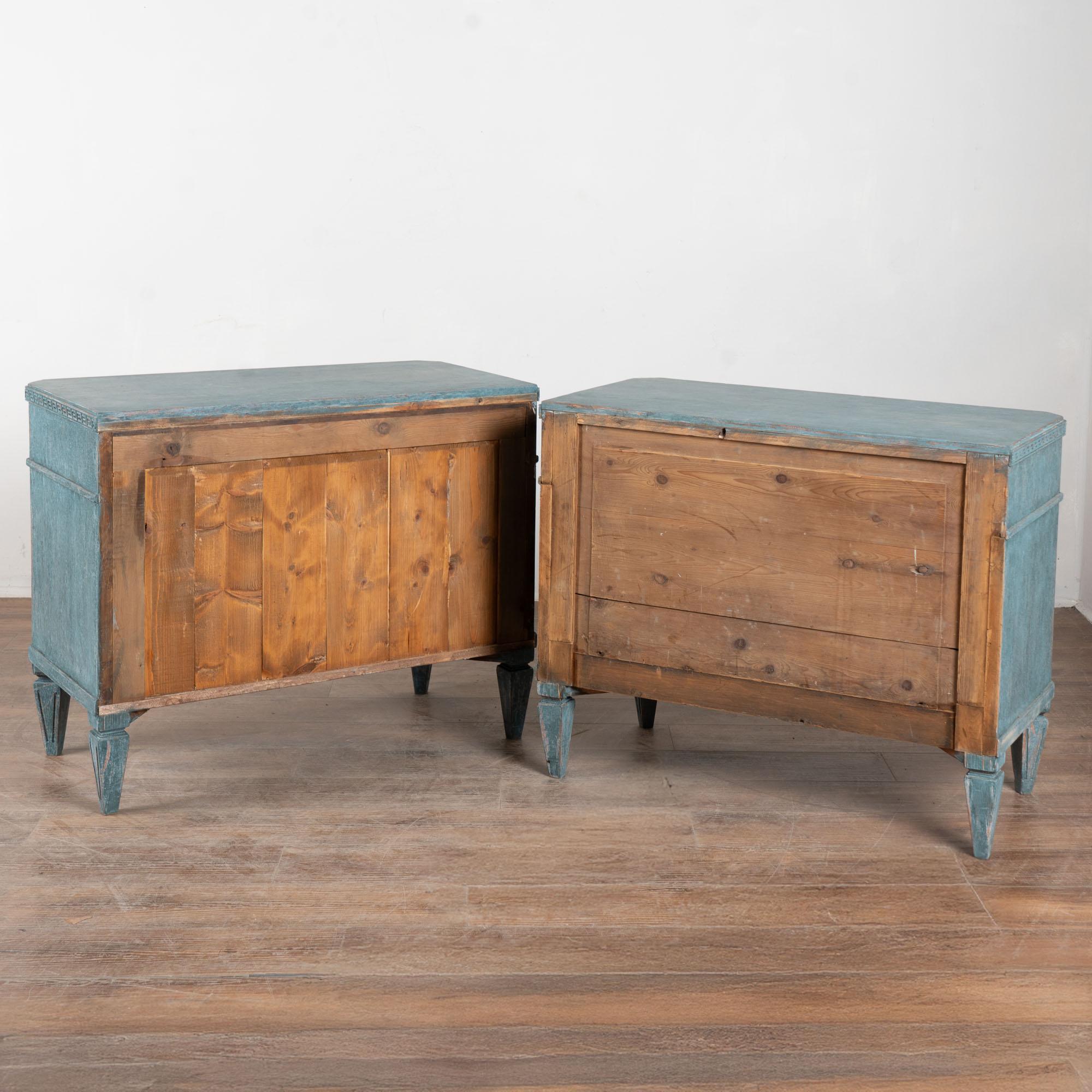 The newer, professionally applied blue custom painted finish is perfectly distressed to fit the age and grace of this lovely pair of Gustavian chests.