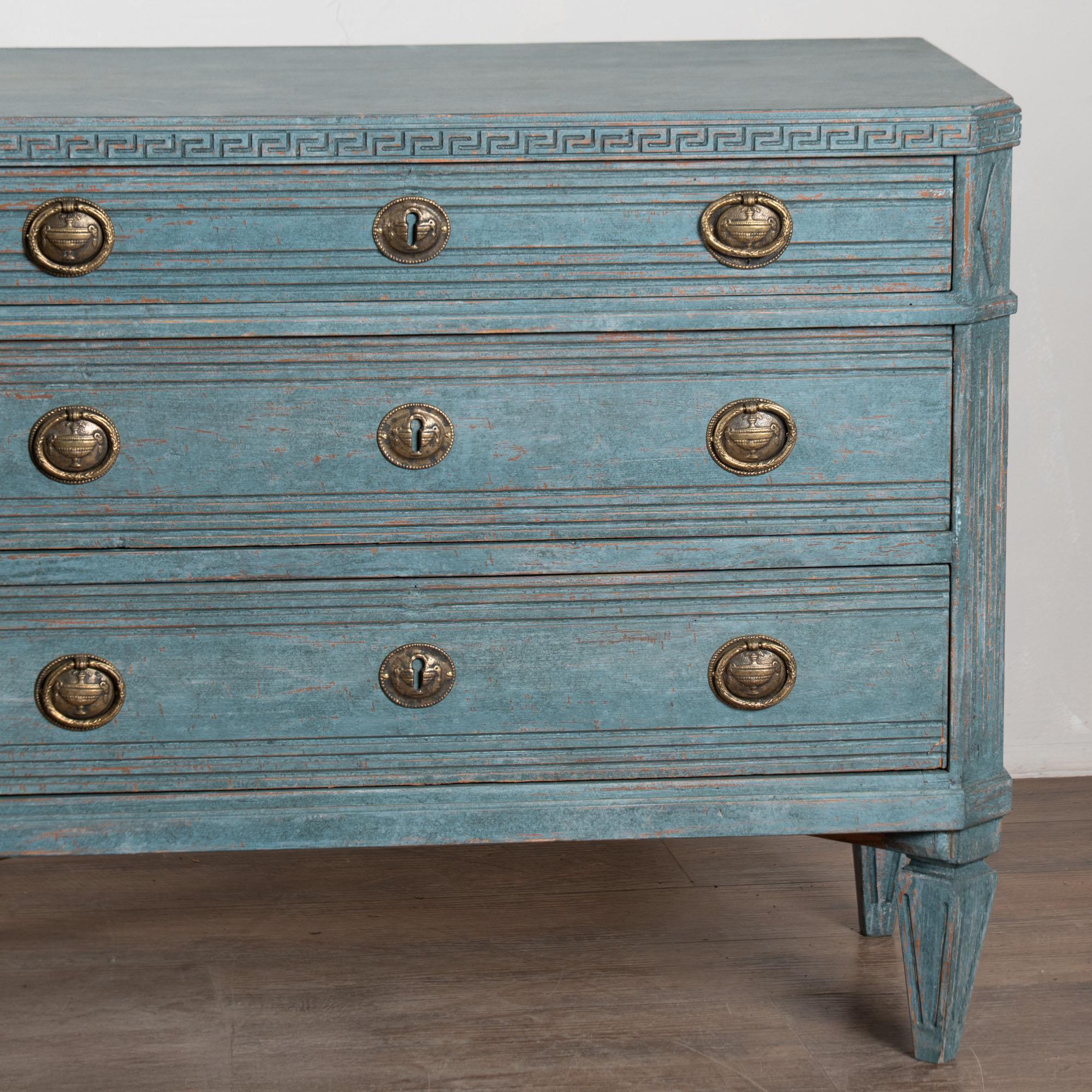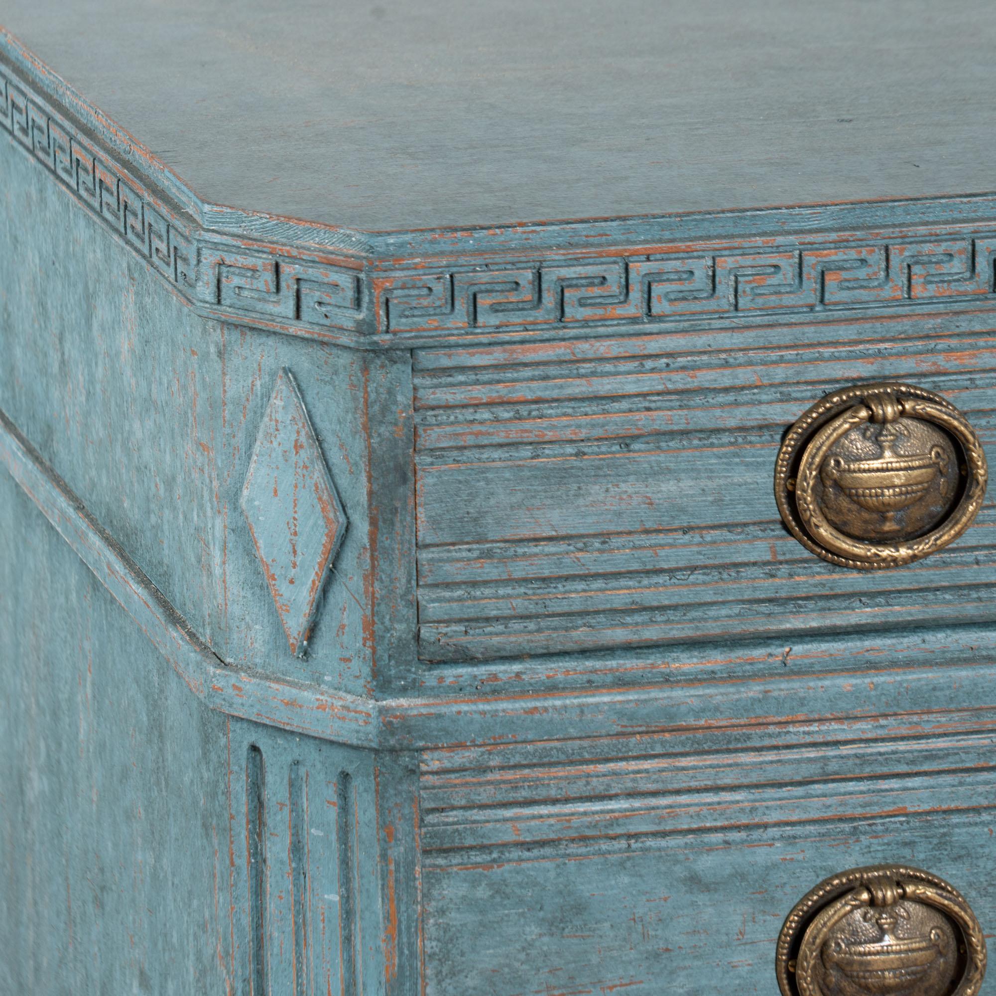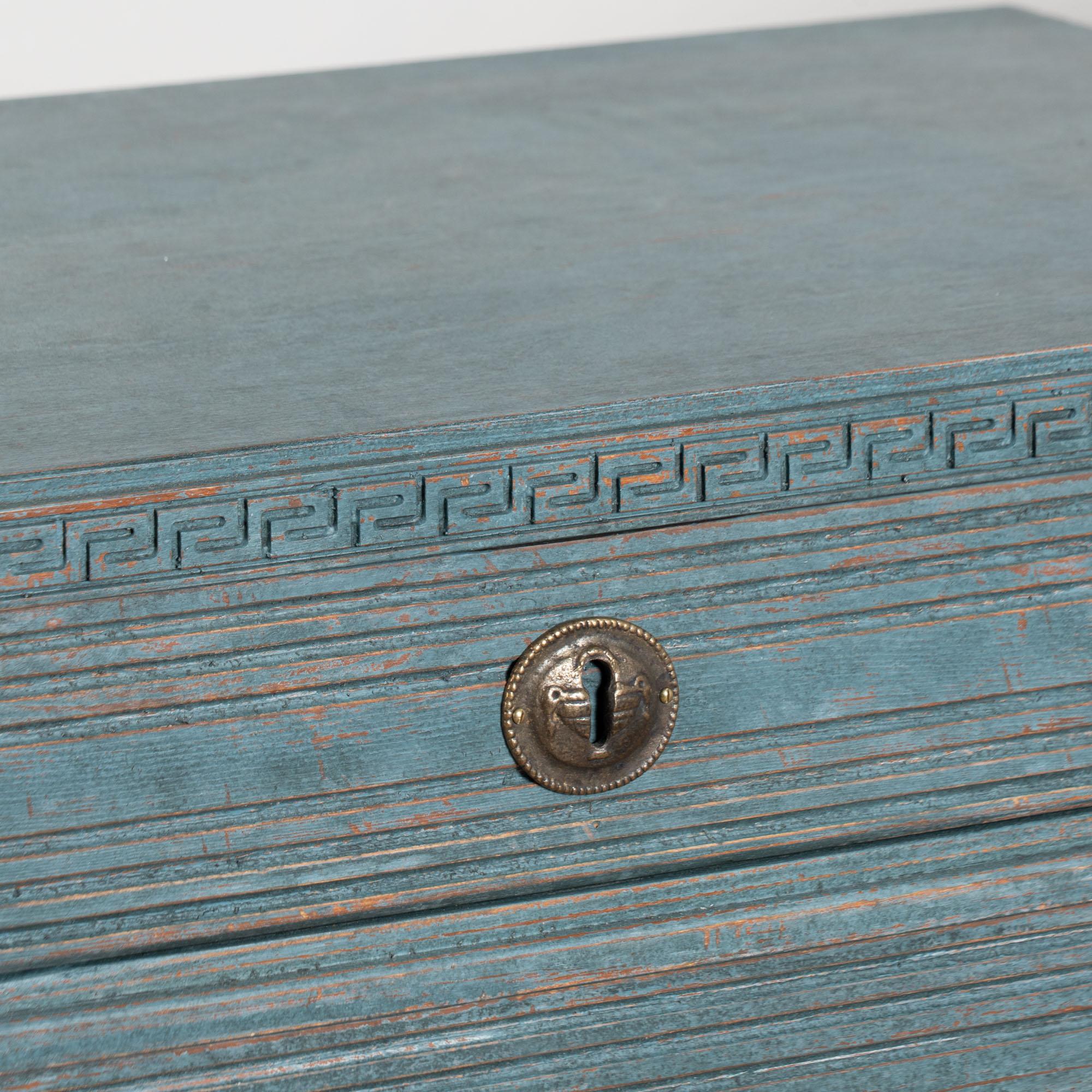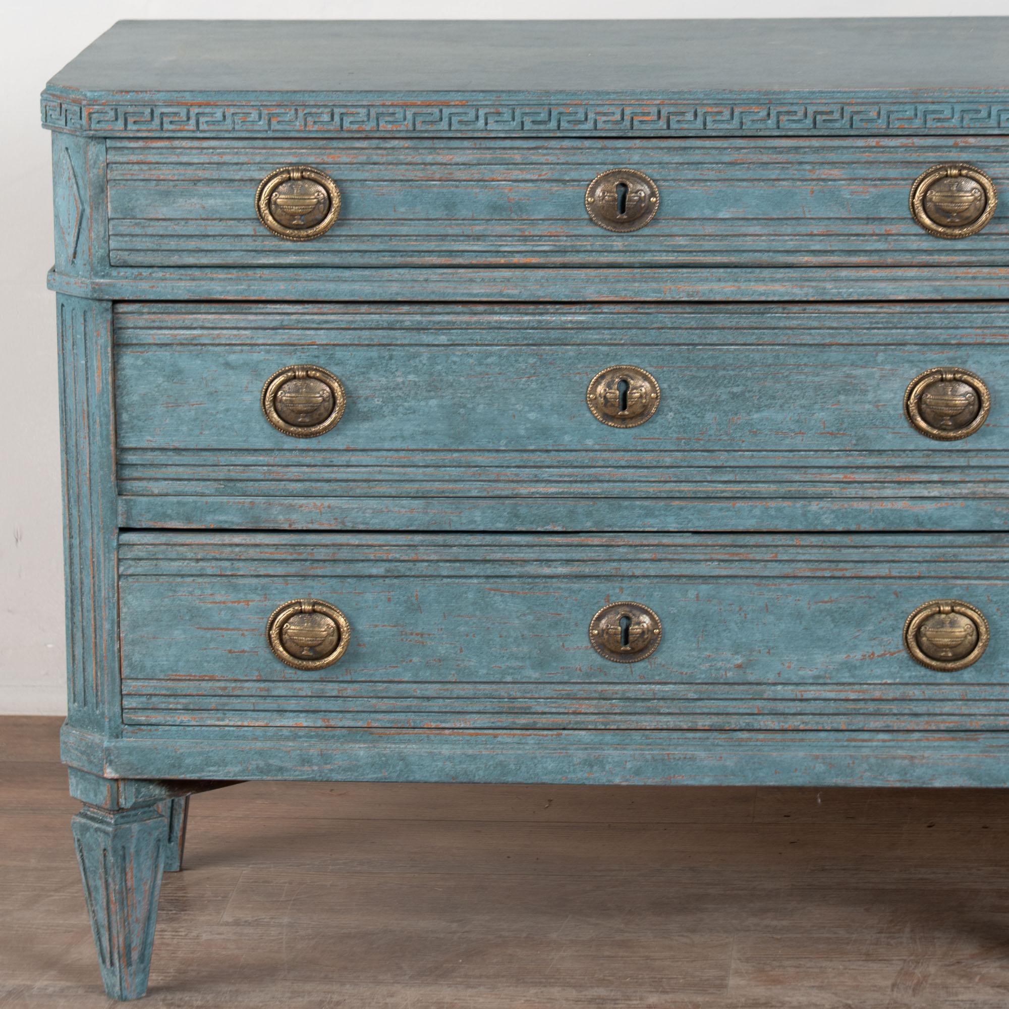 The newer, professionally applied blue custom painted finish is perfectly distressed to fit the age and grace of this lovely pair of Gustavian chests.