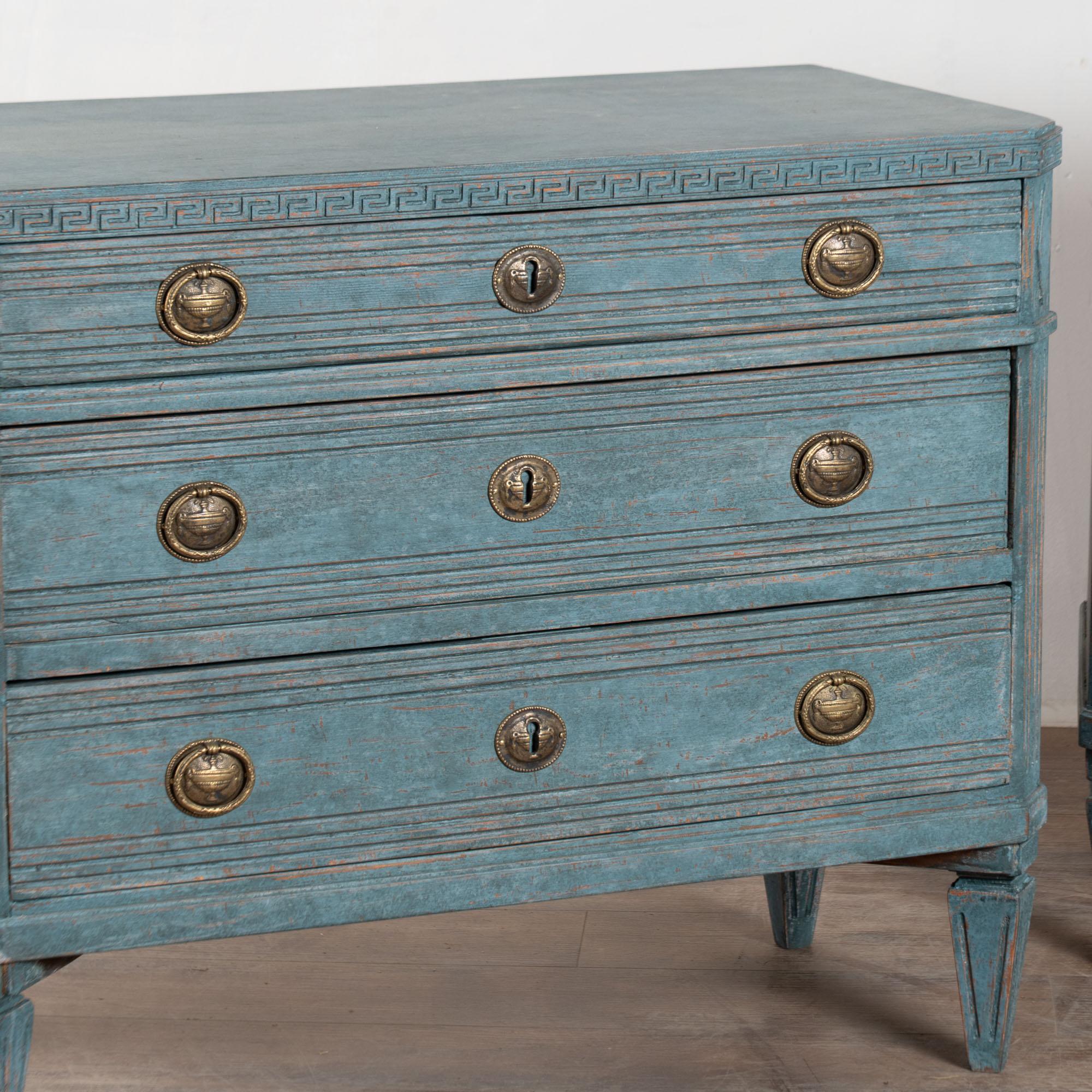 A pair of decorative Gustavian pine chest of three drawers with Greek key motif carved in upper top molding.