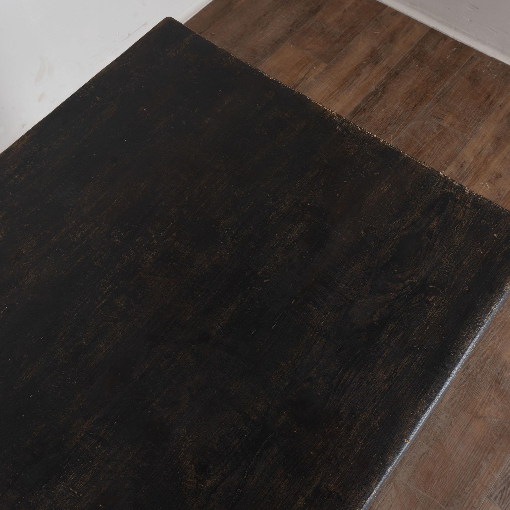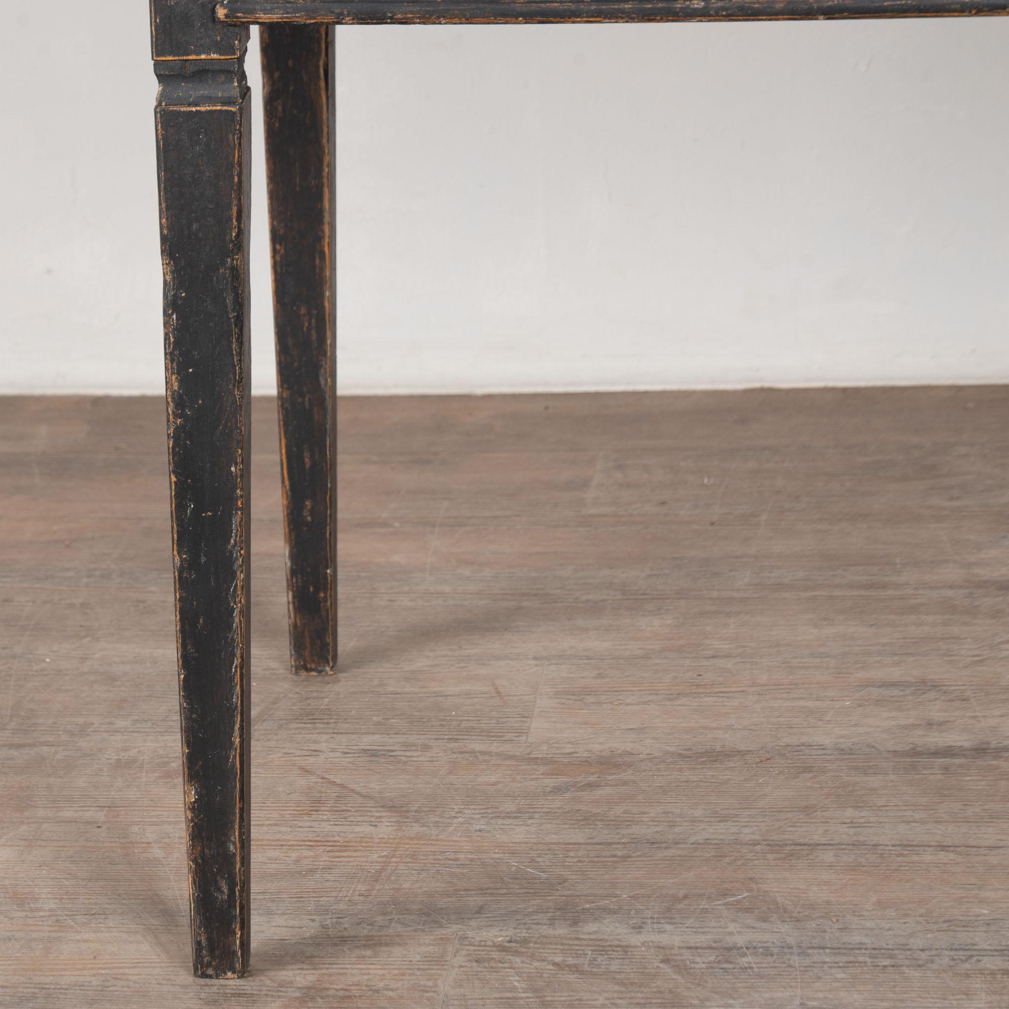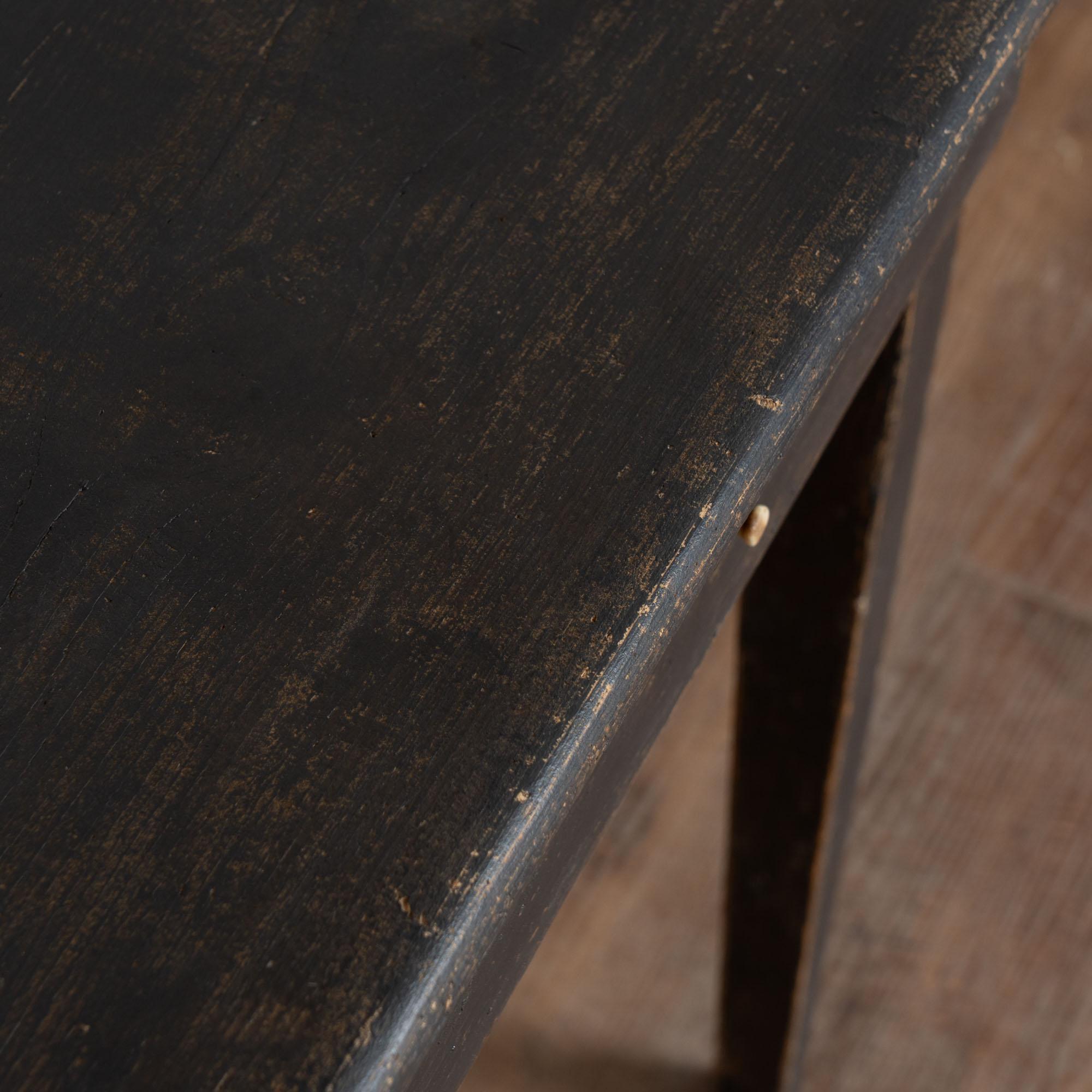 The table stands on tapered legs and features a later applied black painted finish that has been rubbed and distressed, revealing natural pine beneath and complementing the age and character of the piece.