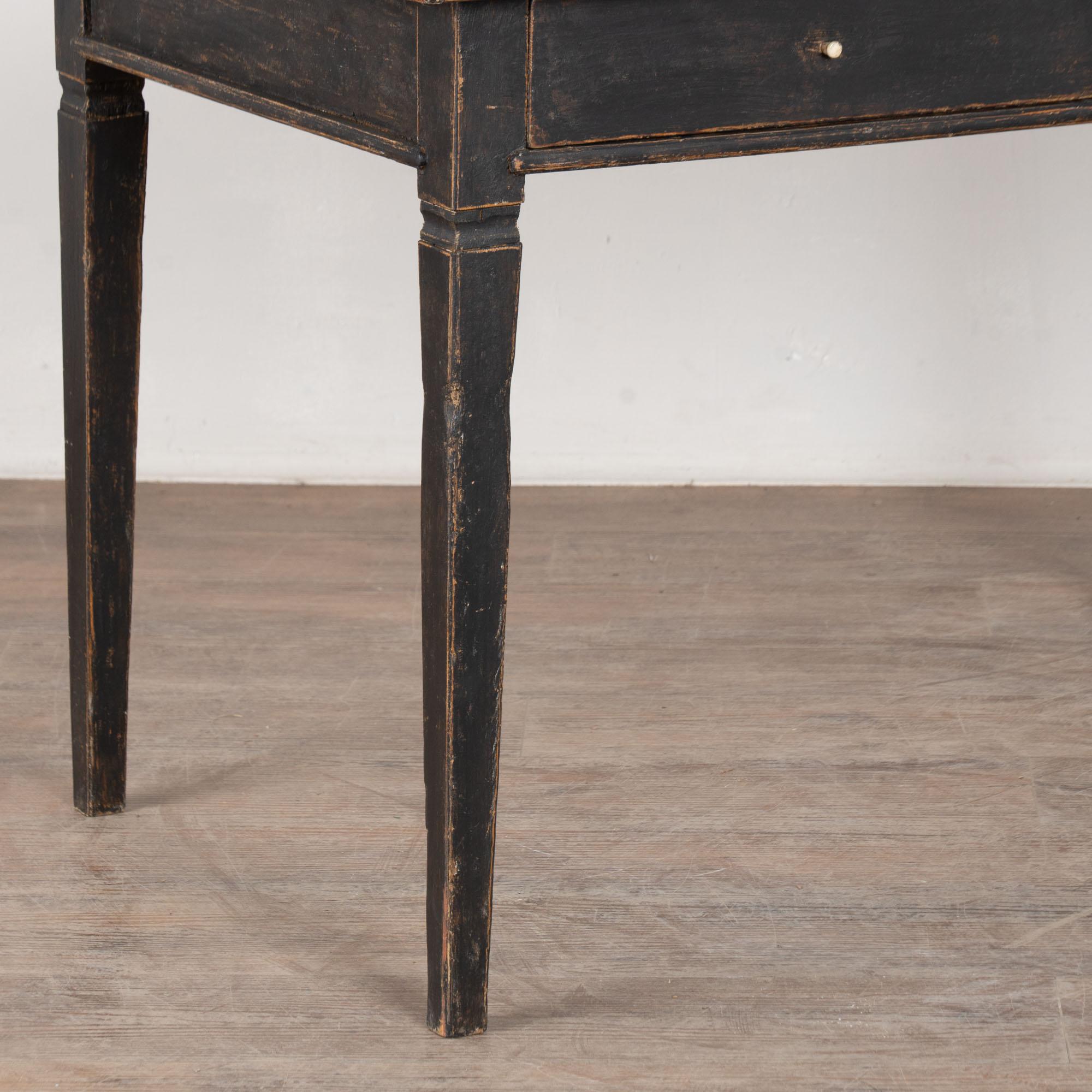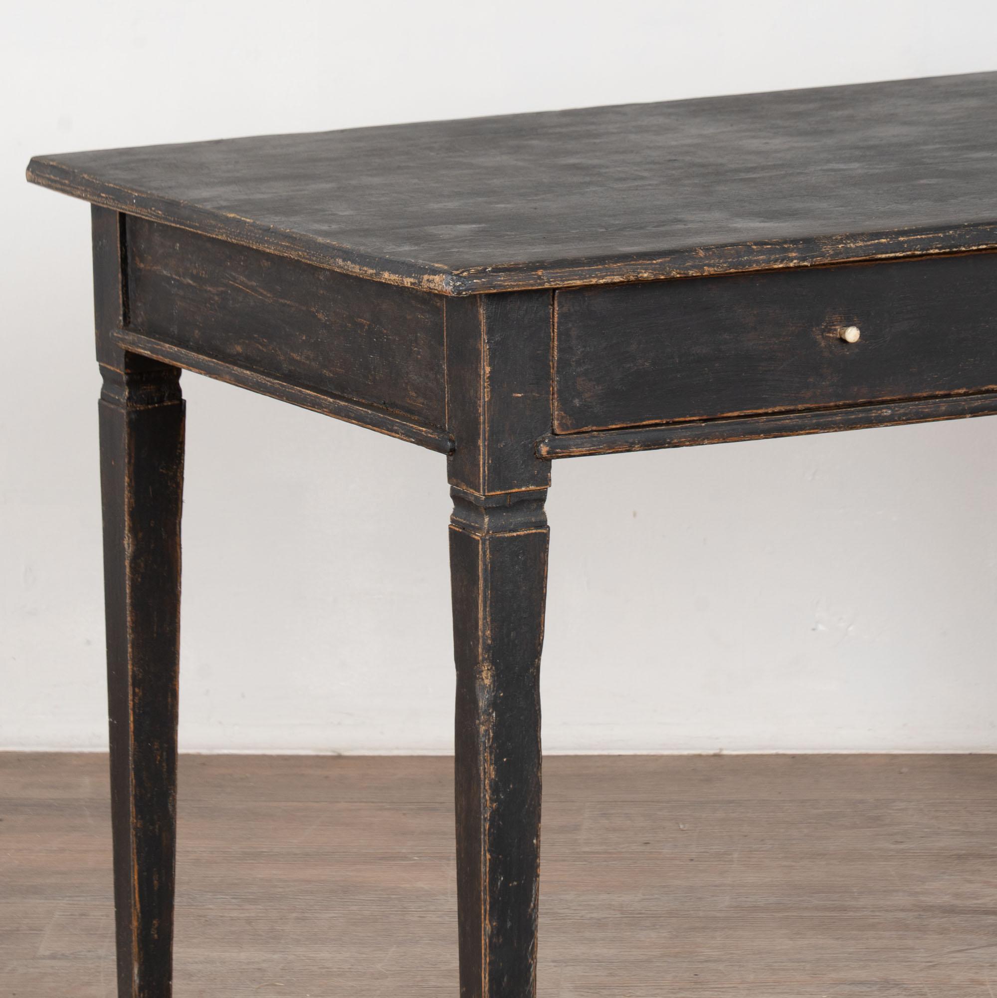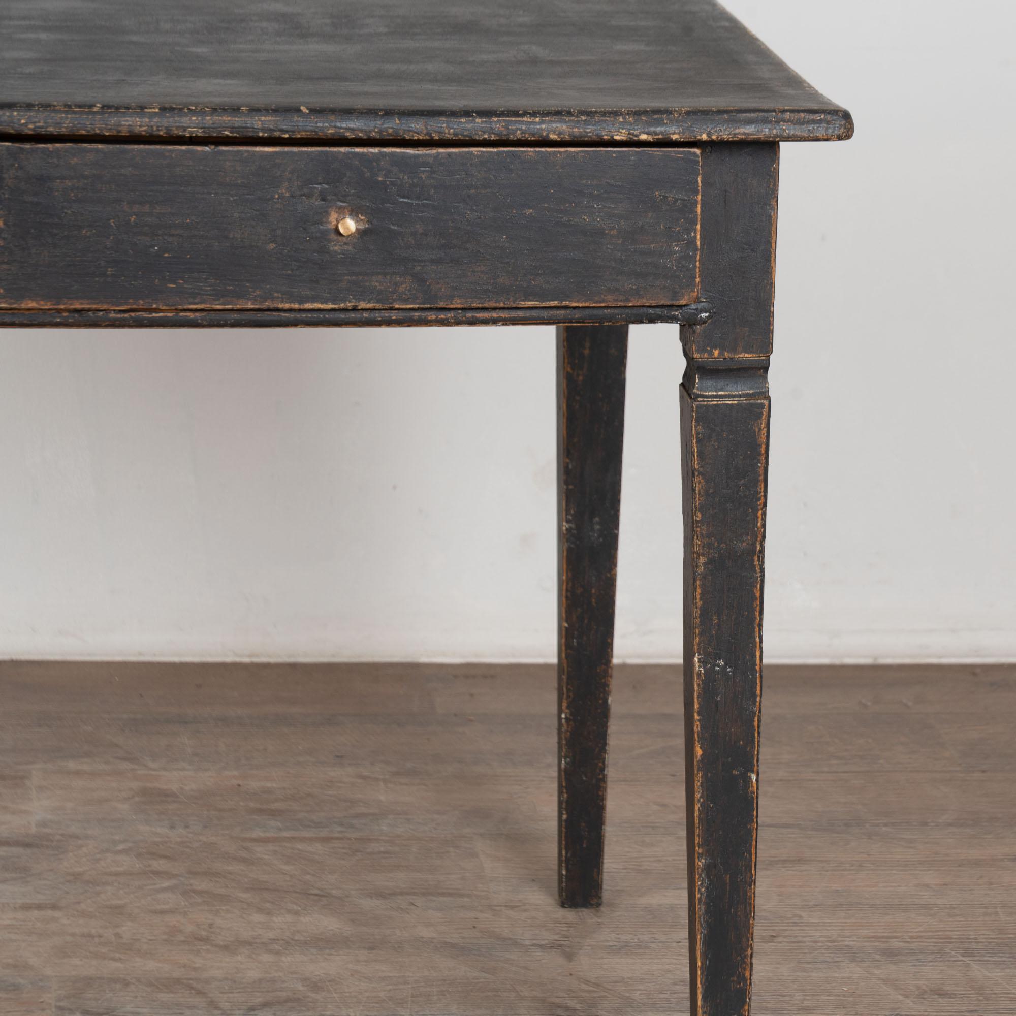 The table stands on tapered legs and features a later applied black painted finish that has been rubbed and distressed, revealing natural pine beneath and complementing the age and character of the piece.