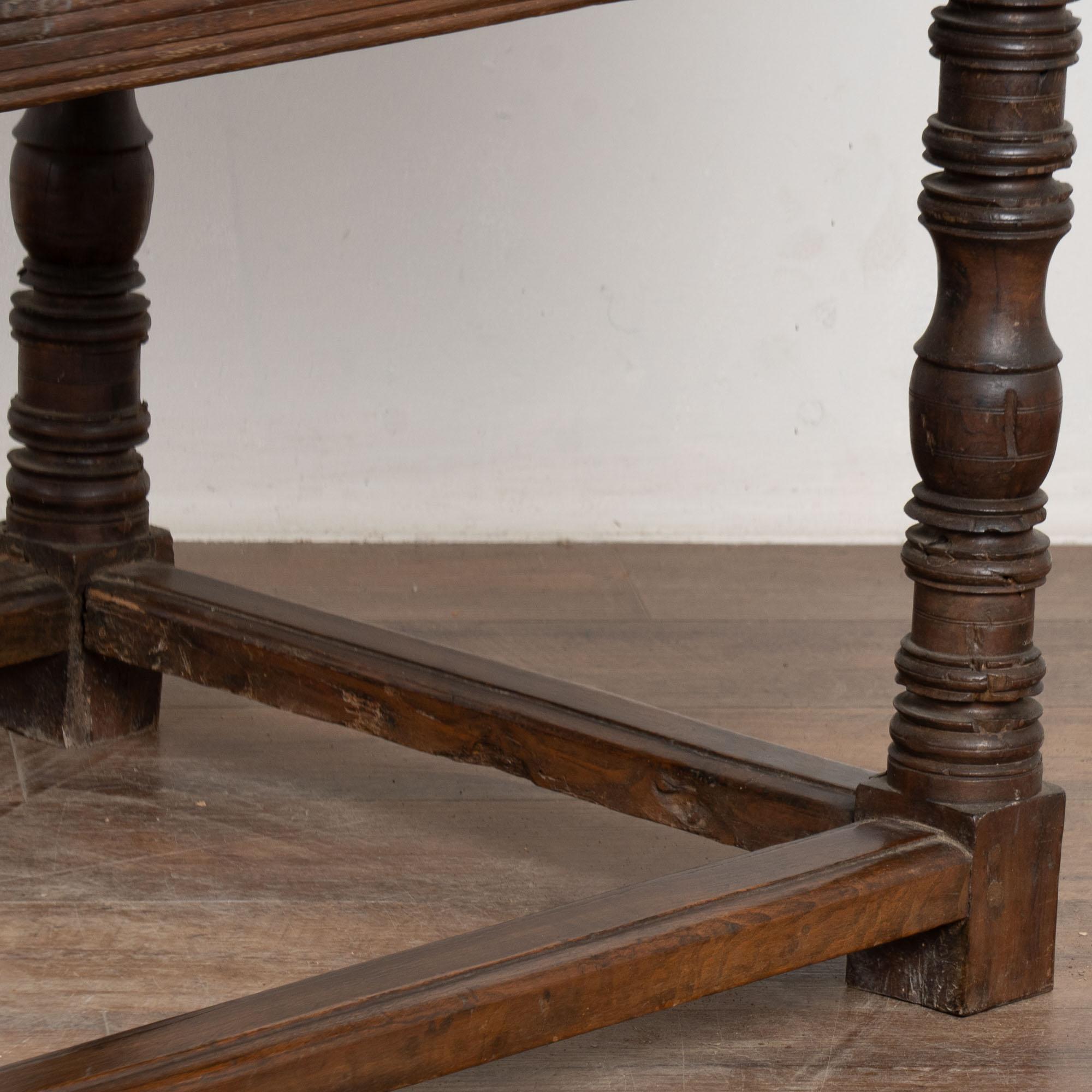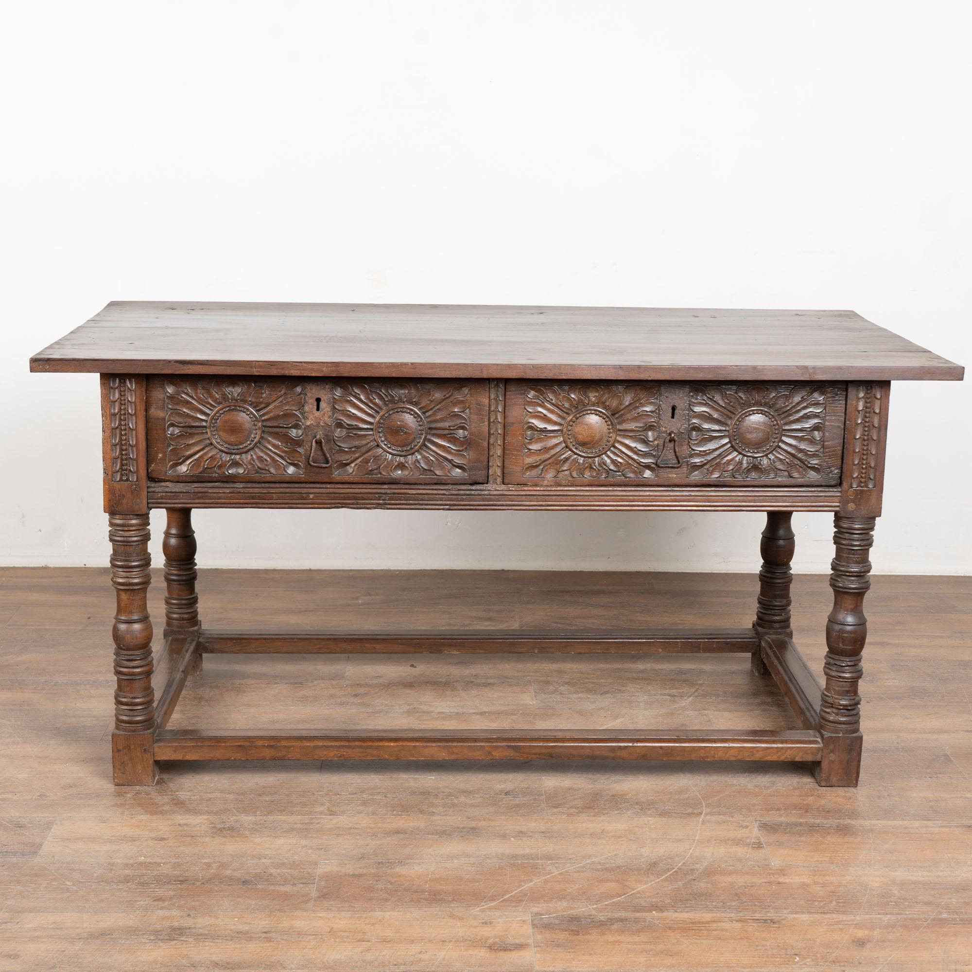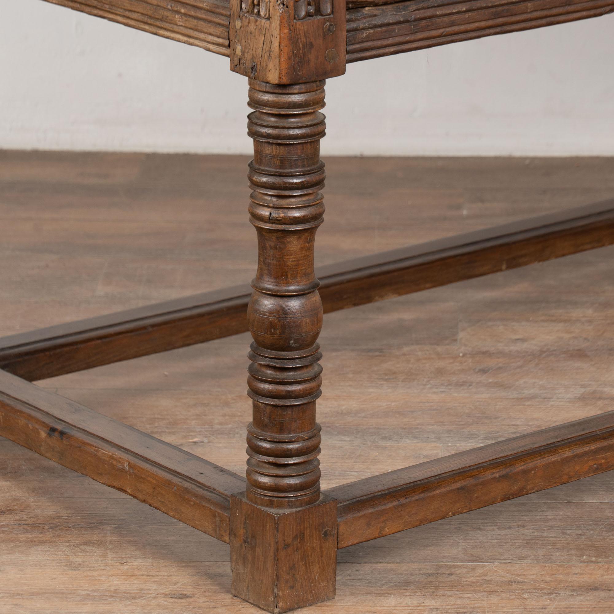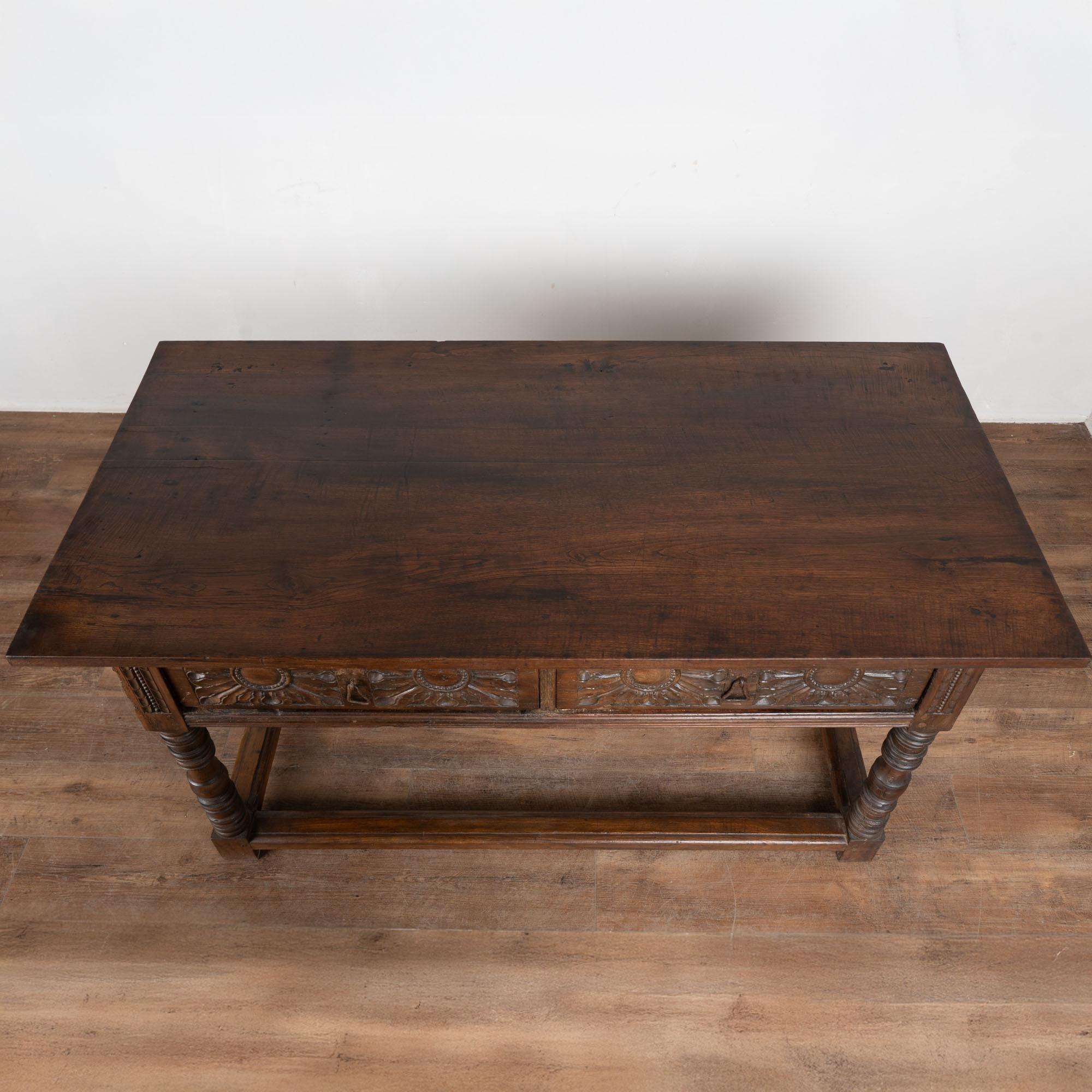 18th-century chestnut console table with deep, dark patina developed over 200 years of use. The table features carved drawer fronts, turned legs, and a trestle-style base.