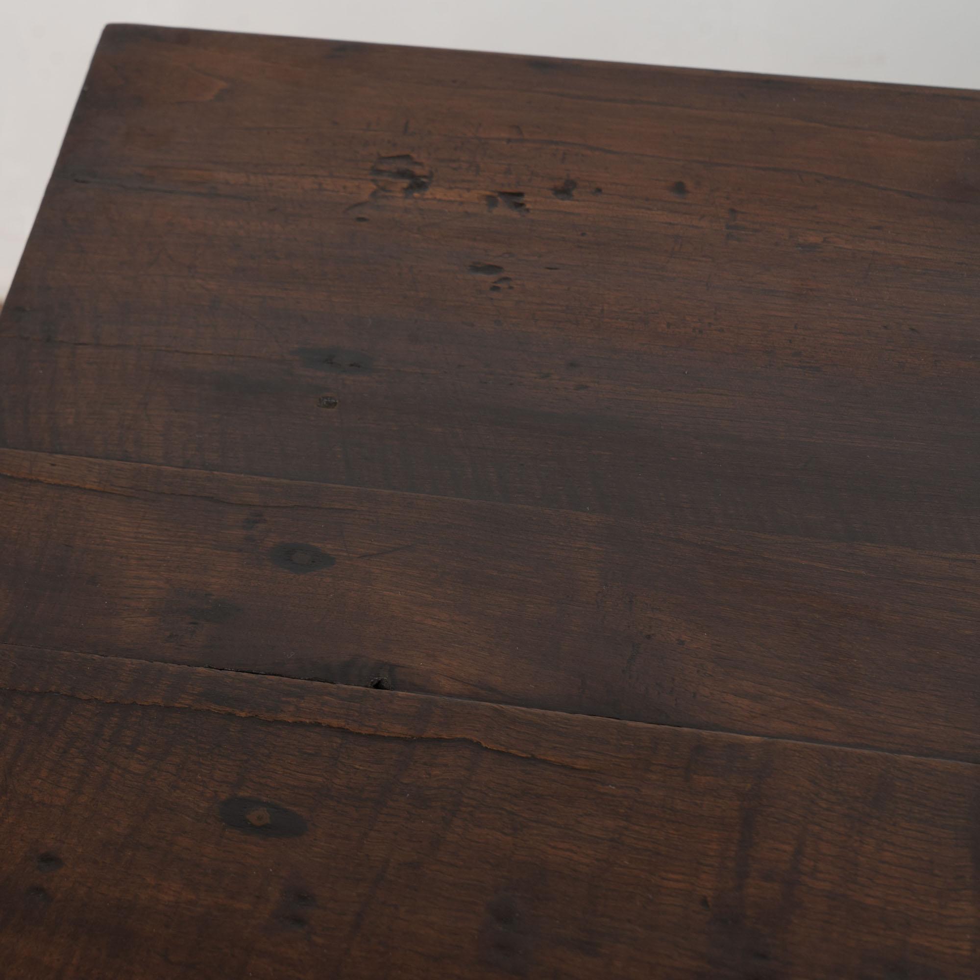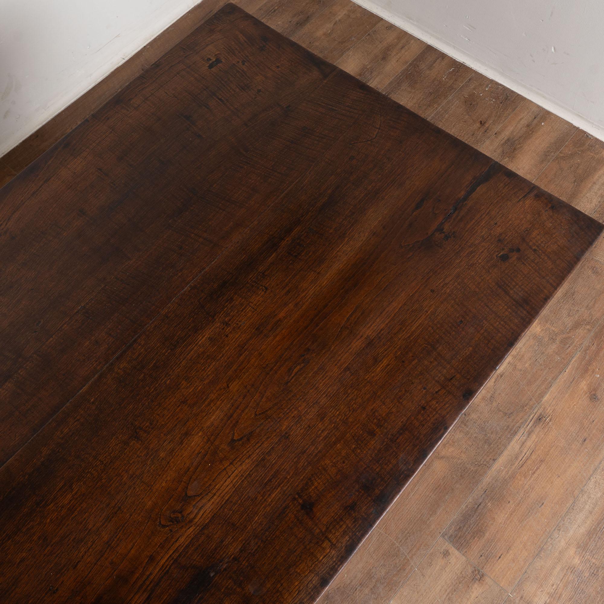 The top reflects centuries of wear through old repaired cracks, gouges, gnarls, stains, minimal bowing and historic surface activity. Edges and legs show much distress with nicks, abrassions, cracks etc. Signs of old dried wormholes (No longer active) consistent with early European furniture are visible.