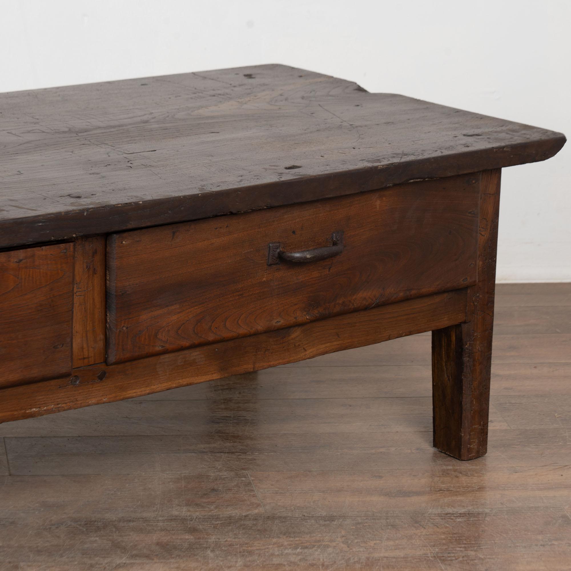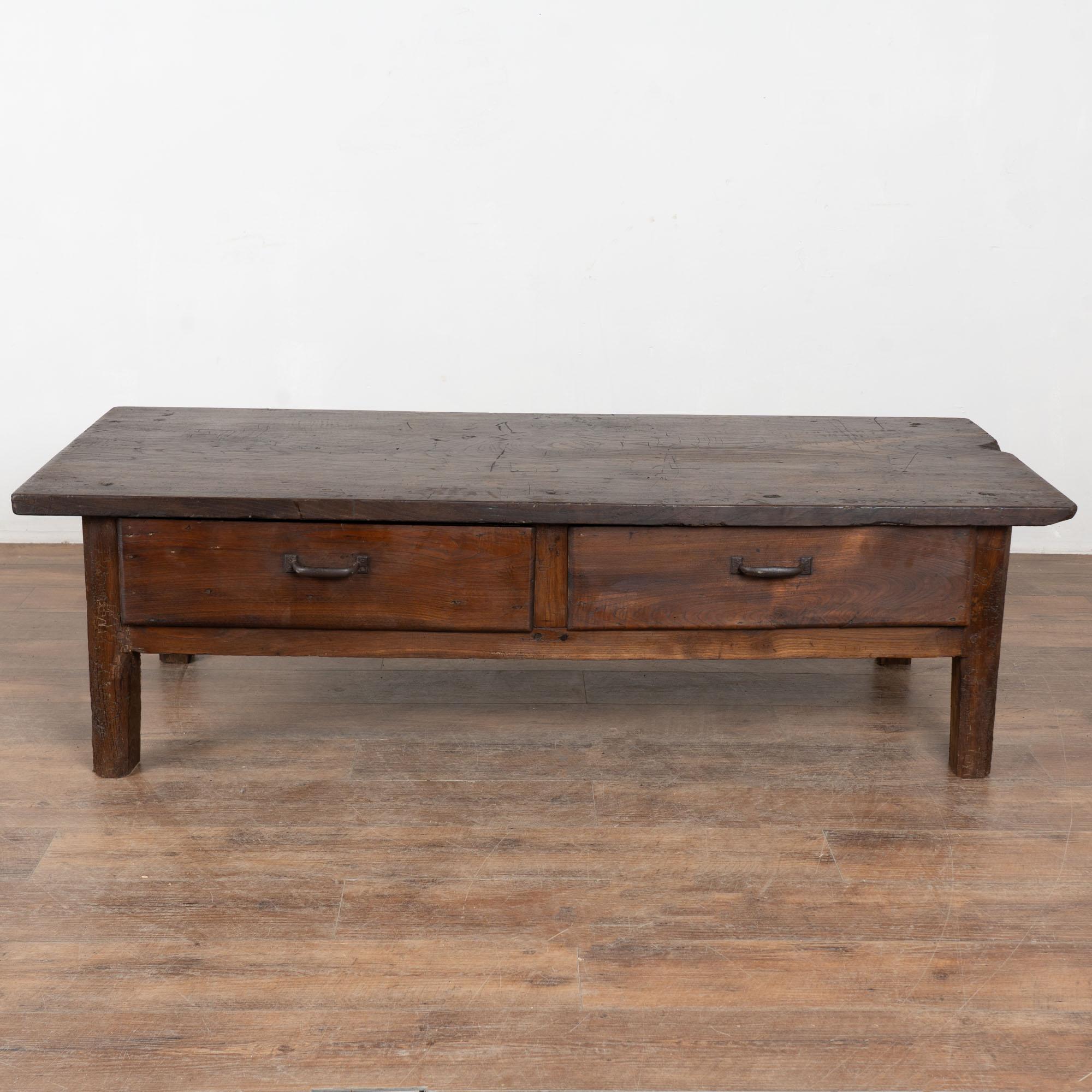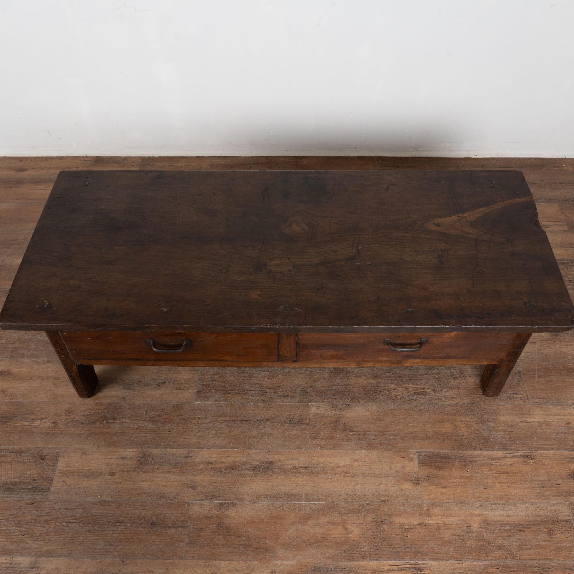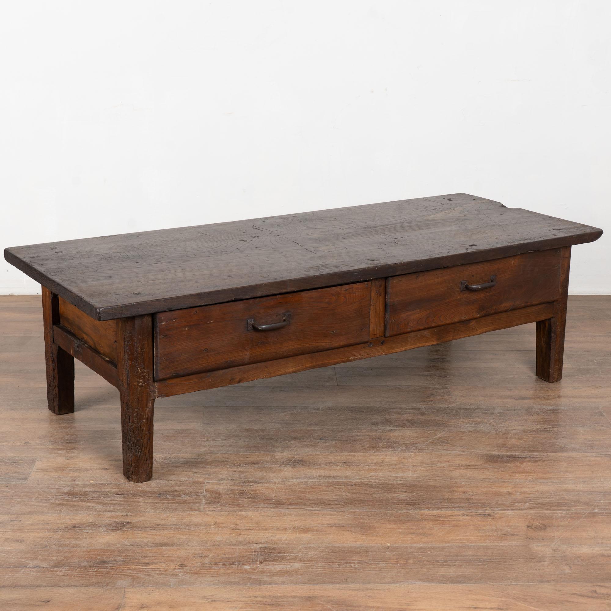 This rustic dark chestnut coffee table features two drawers with iron pulls. The extensive wear and distress give this table its remarkable character. Gouges, cracks, scratches, and traces of old wormholes appear throughout the top, drawers, and legs (where old wormhole remains are most dominate and no longer active). Old cracks have been repaired, preserving the sturdy structure while maintaining its timeworn charm.