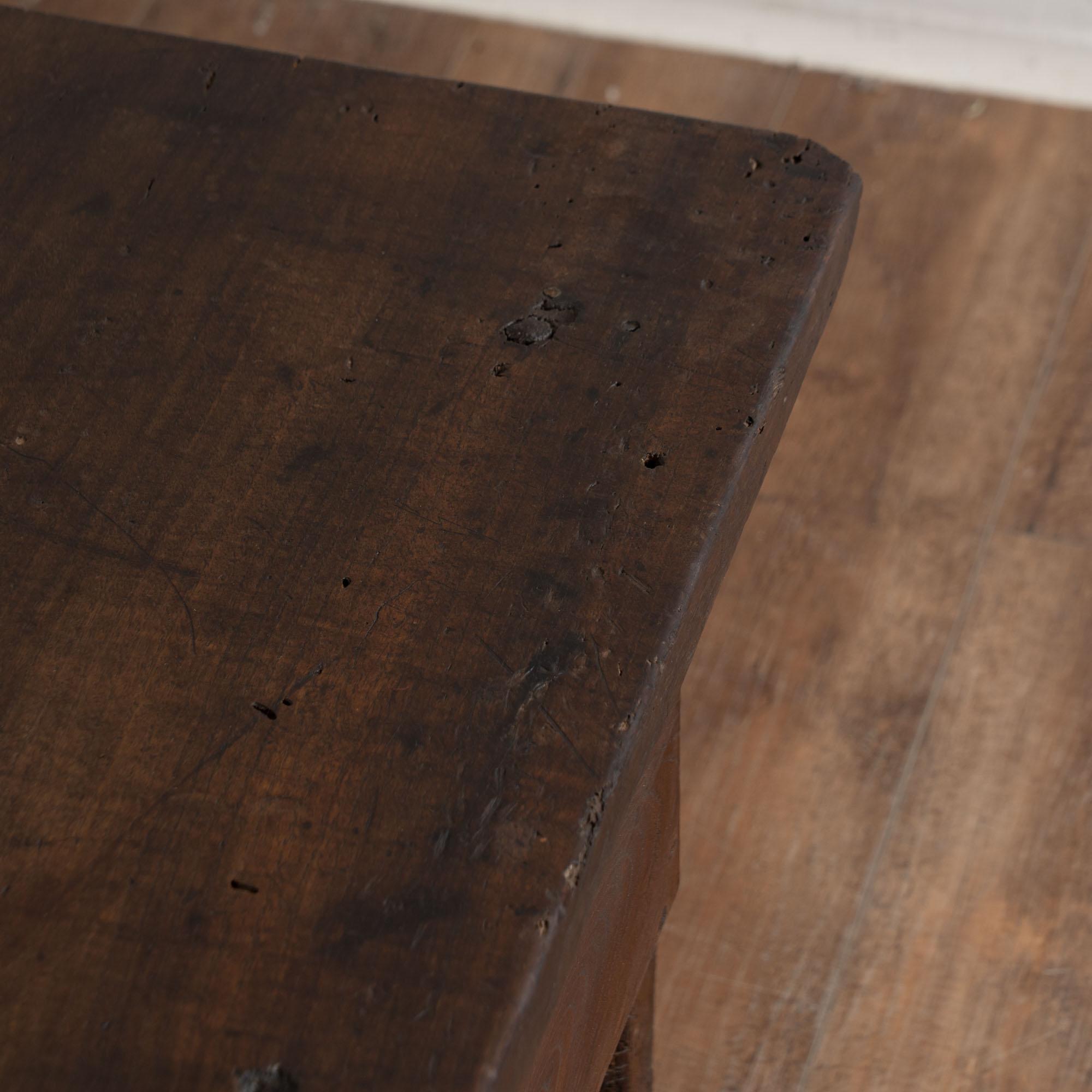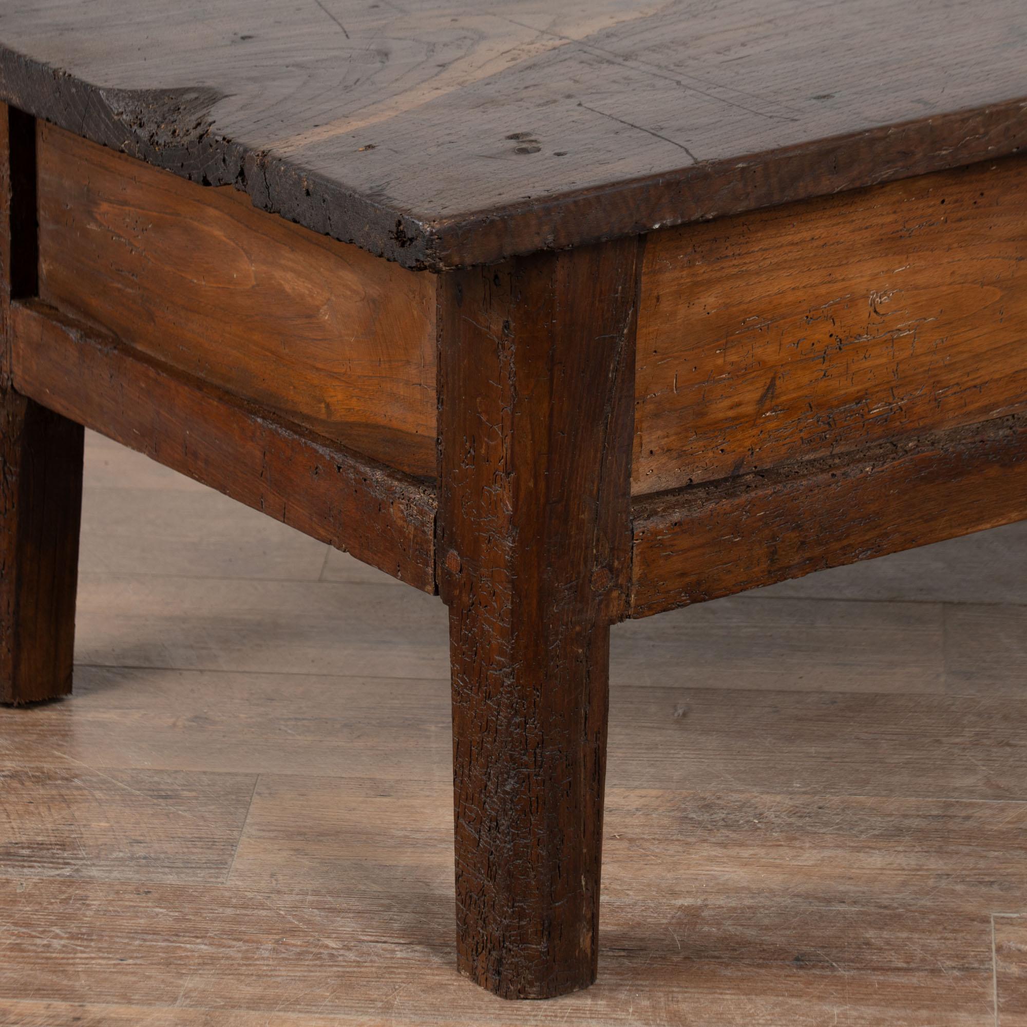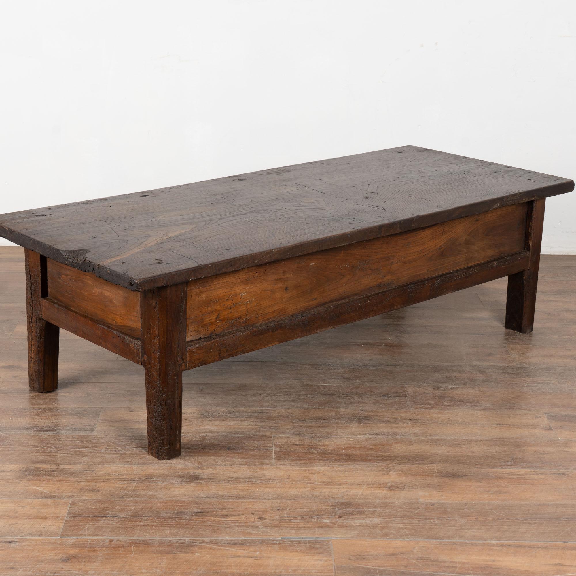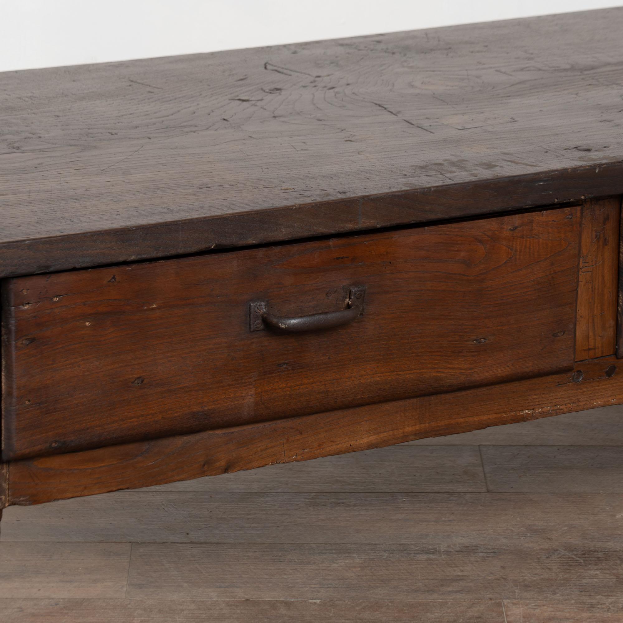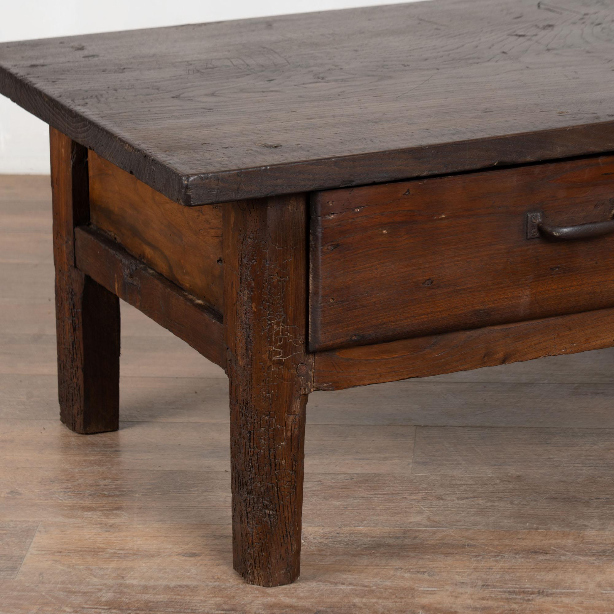 This rustic dark chestnut coffee table features two drawers with iron pulls. The extensive wear and distress give this table its remarkable character. Gouges, cracks, scratches, and traces of old wormholes appear throughout the top, drawers, and legs (where old wormhole remains are most dominate and no longer active). Old cracks have been repaired, preserving the sturdy structure while maintaining its timeworn charm.