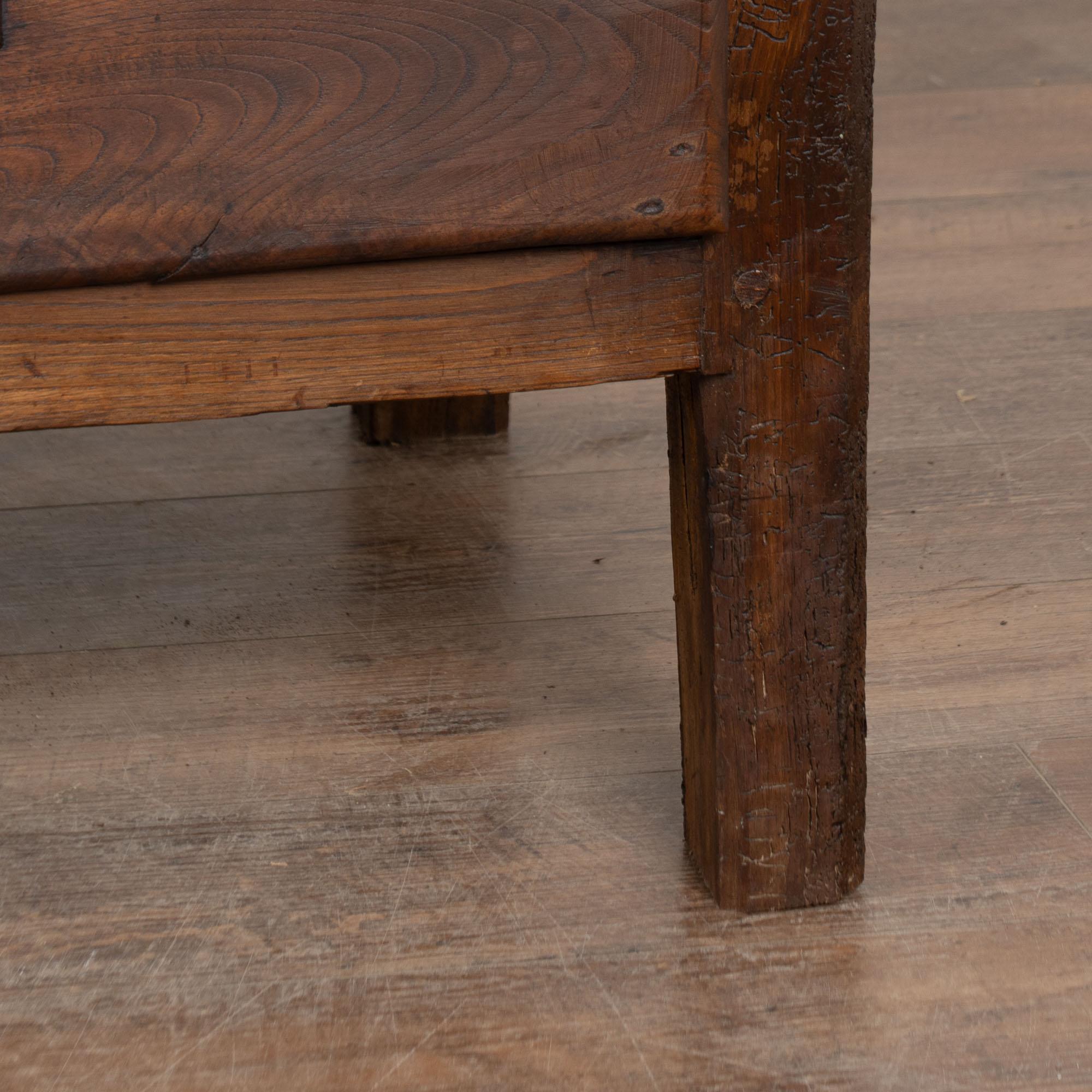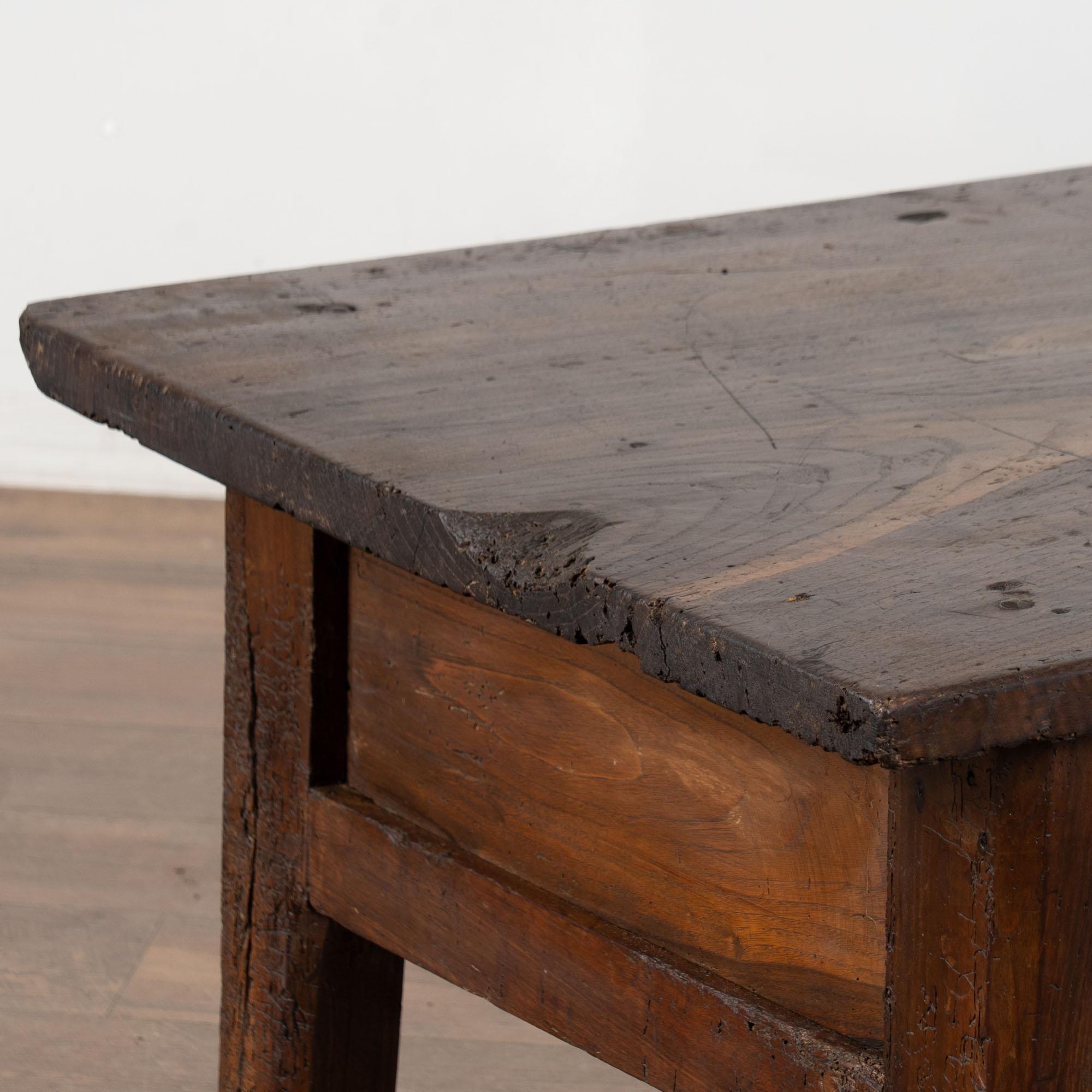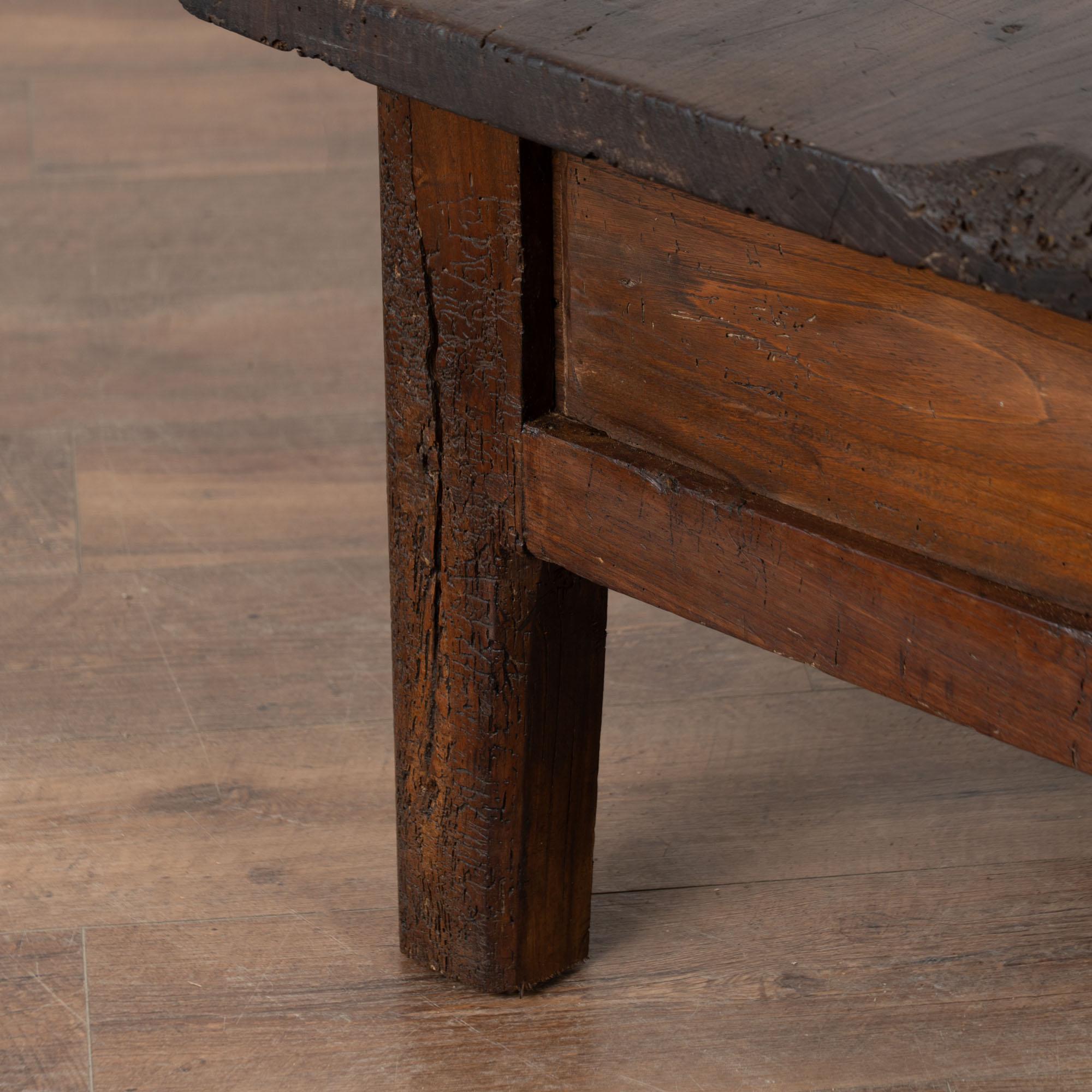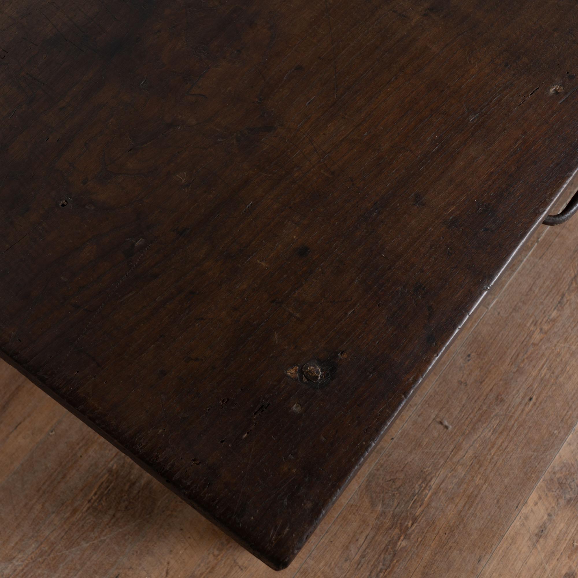 This rustic dark chestnut coffee table features two drawers with iron pulls. The extensive wear and distress give this table its remarkable character. Gouges, cracks, scratches, and traces of old wormholes appear throughout the top, drawers, and legs (where old wormhole remains are most dominate and no longer active). Old cracks have been repaired, preserving the sturdy structure while maintaining its timeworn charm.