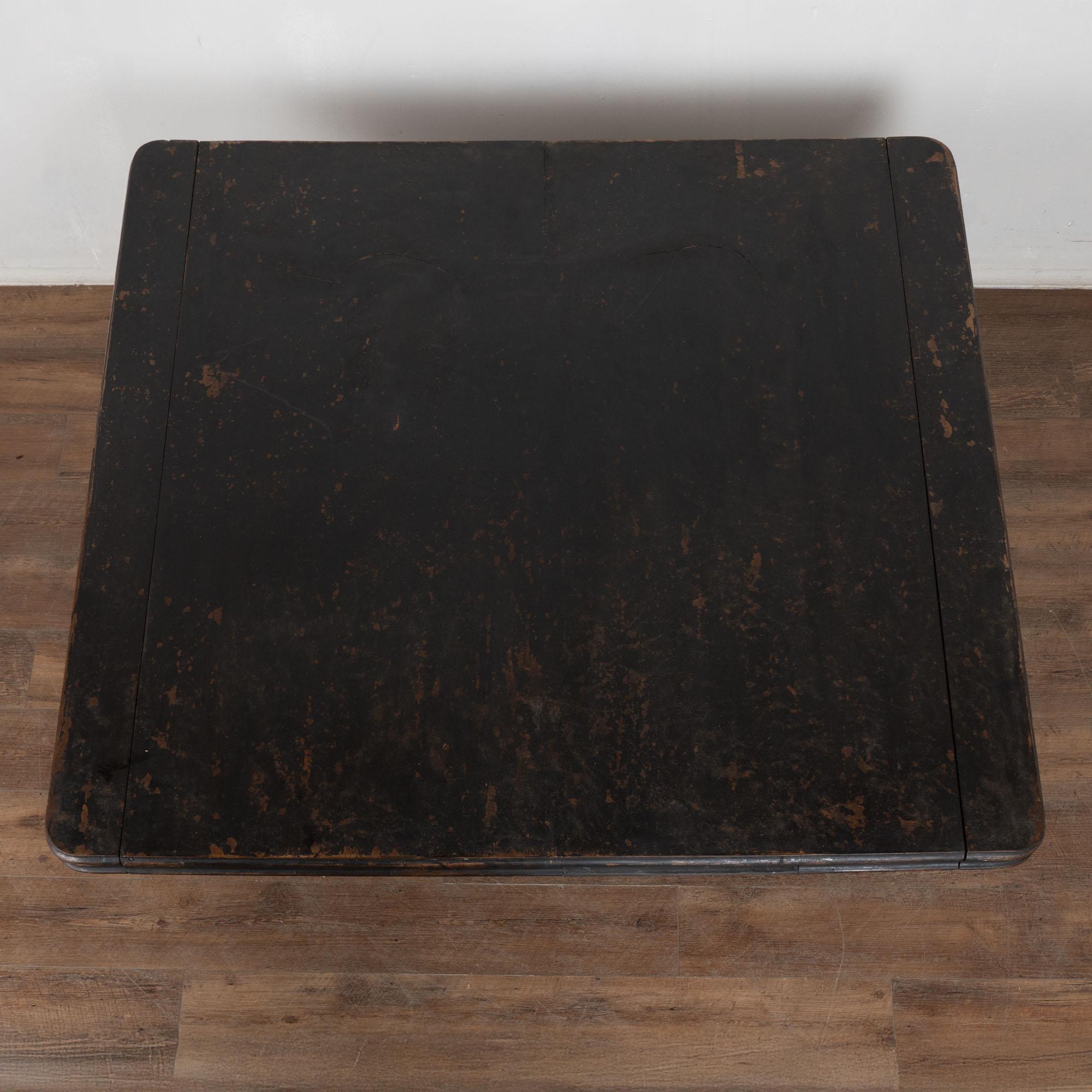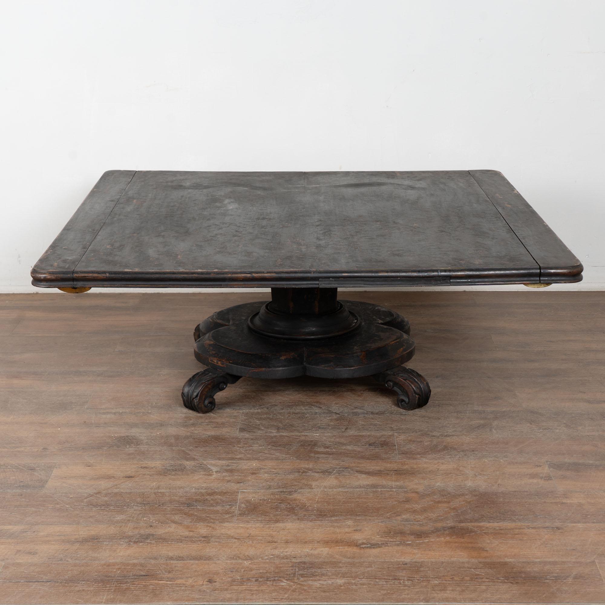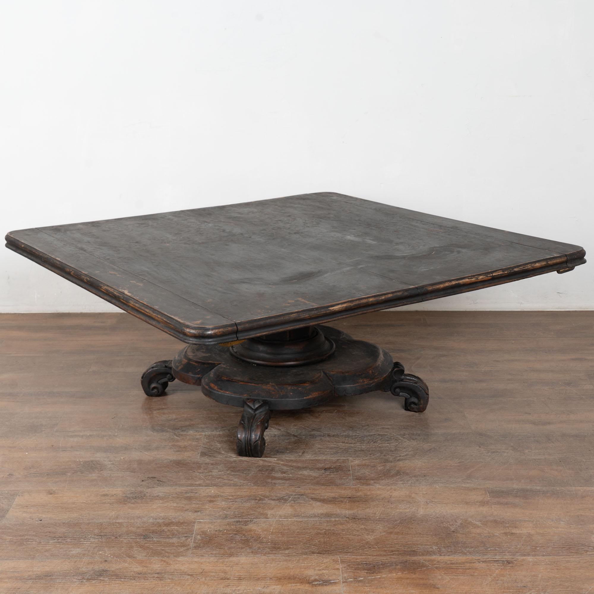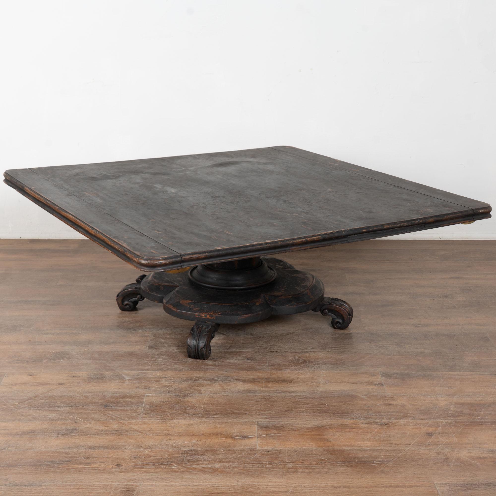 19th century black painted Swedish large square coffee table, crafted in oak. While the black paint is old, it is likely not original to the age of the table. The base is a dramatic pedestal form, curved and raised on four carved feet, giving the table a bold and highly functional silhouette. This table was likely cut down at some point in time, and signs along the top edges suggest it may once have been able to adapt with leaves. It creates a large square coffee table form not typical to earlier years. Please take a close look at the top in photos. Two rounded cracks were touched up at some point in time. Distress to the painted finish reveals natural wood below, adding dimension and character. Restored strong, stable, and ready to use. Scratches, nicks, and cracks reflect generations of use.