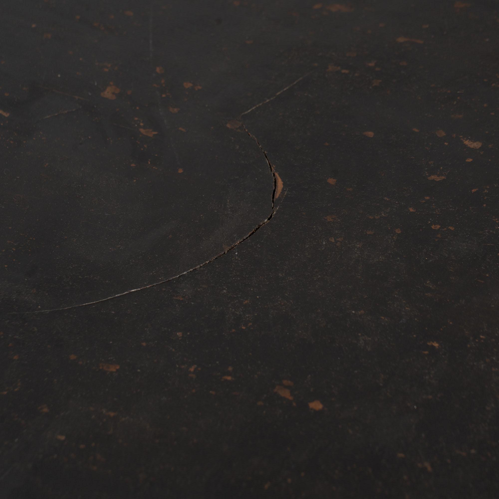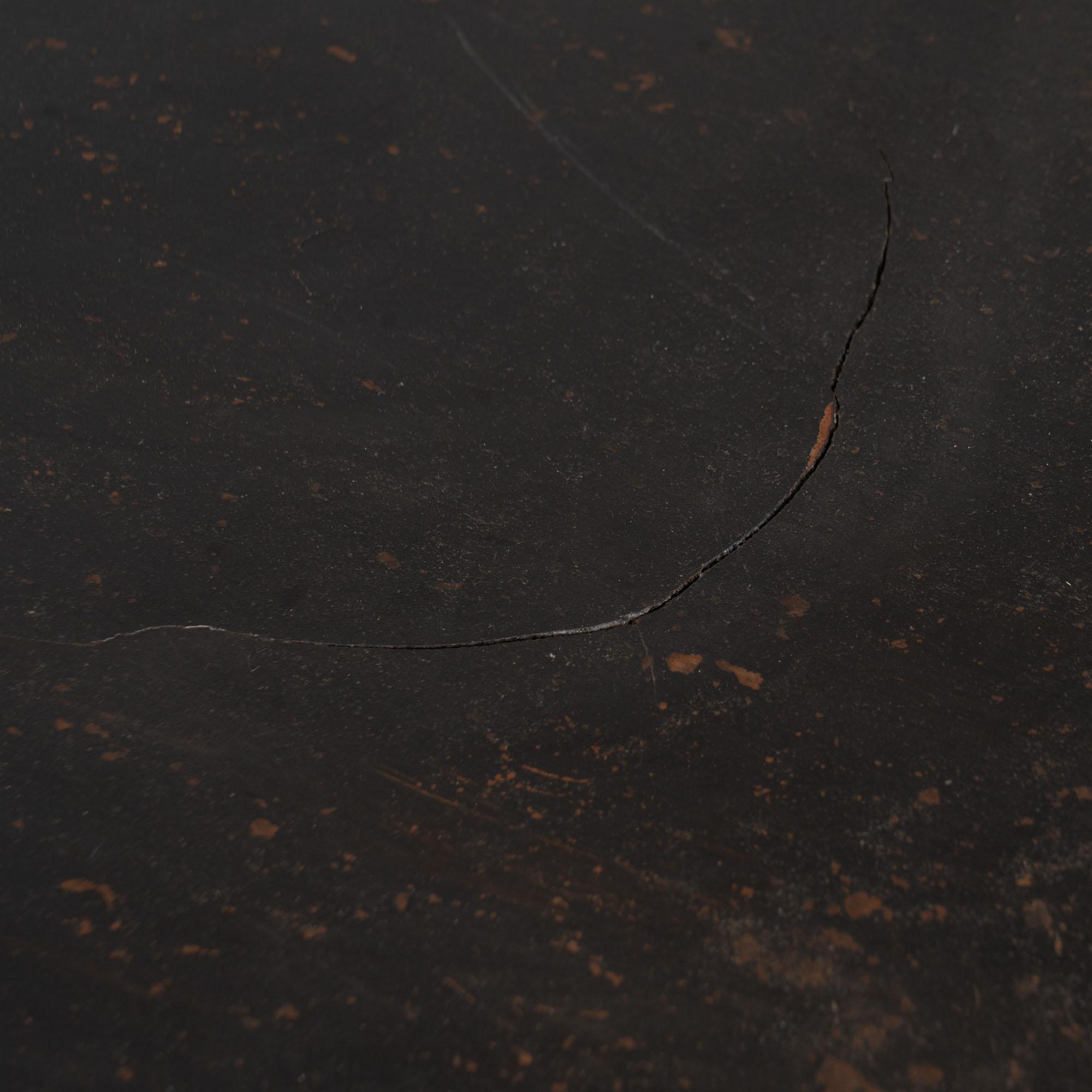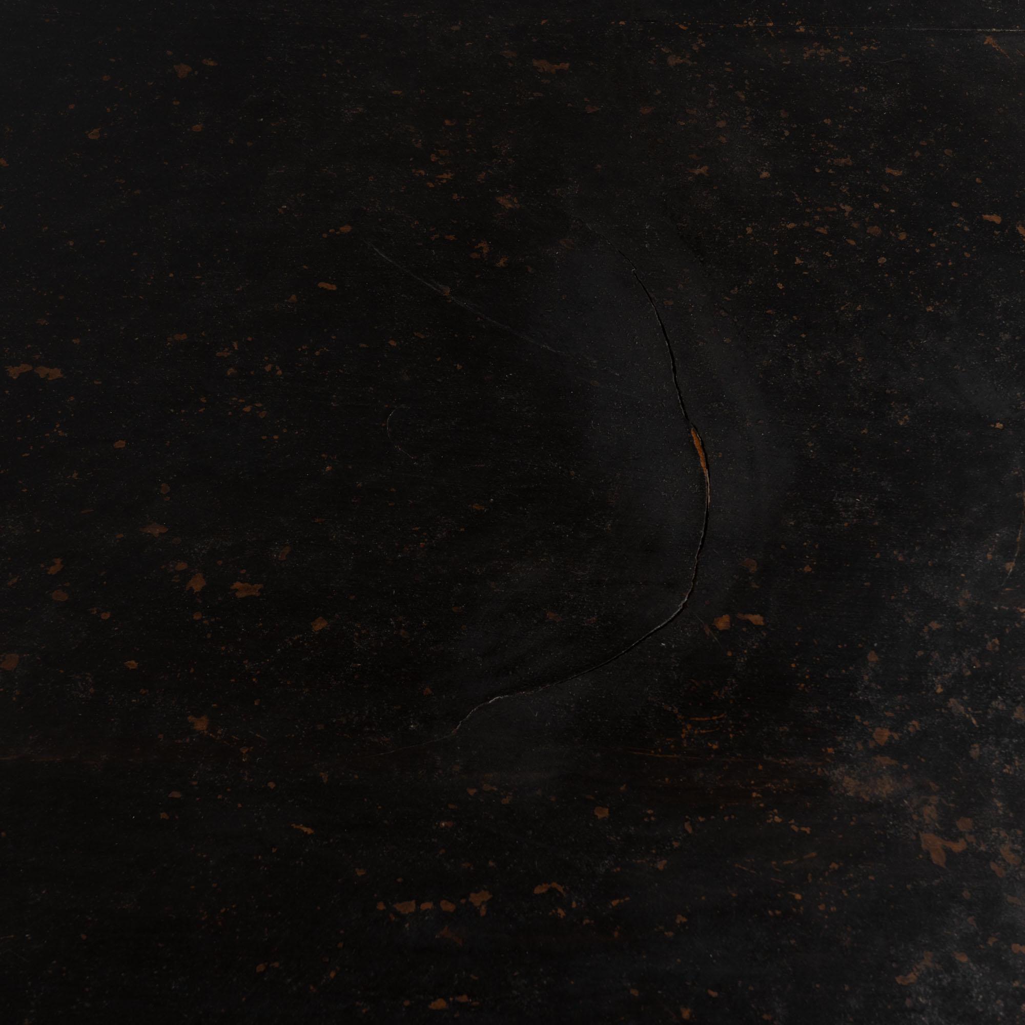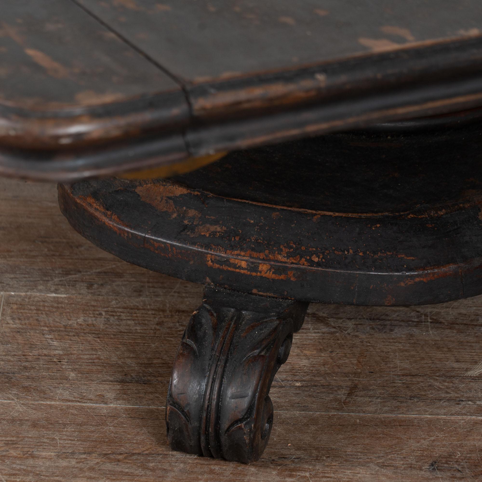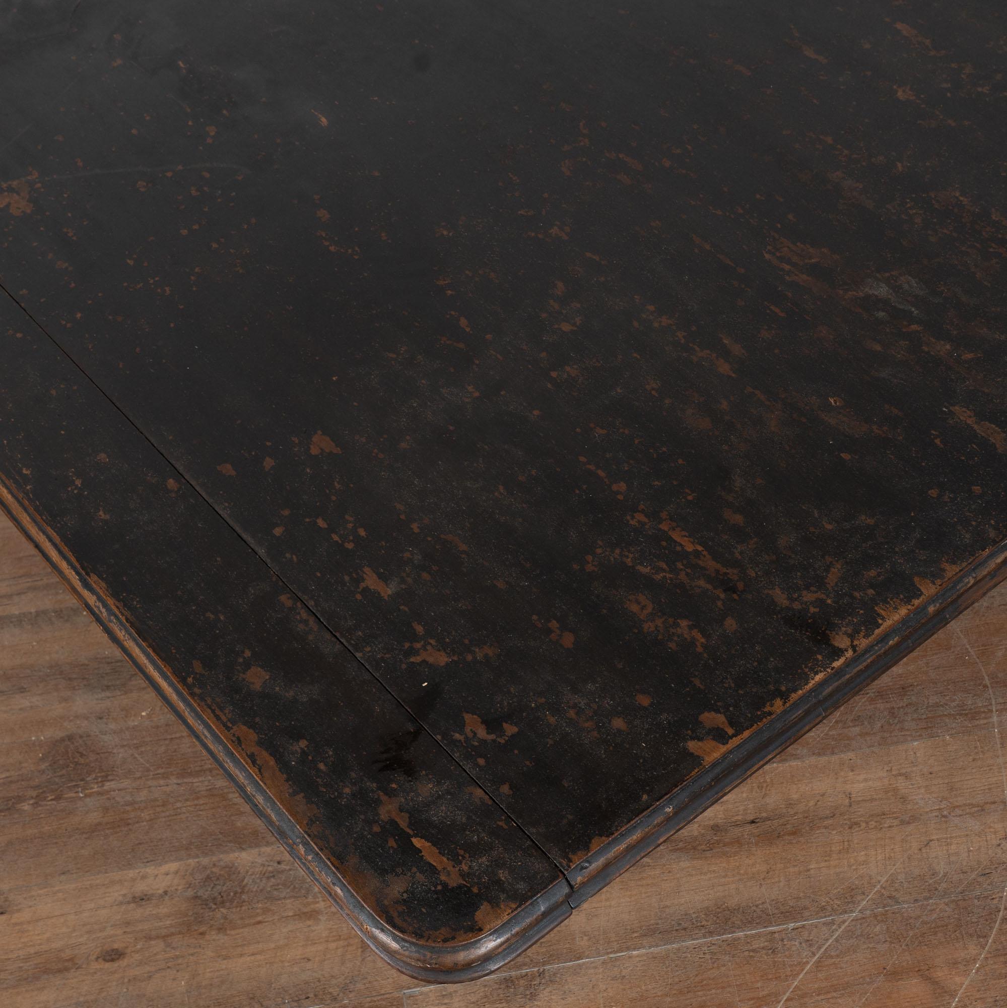 19th century black painted Swedish large square coffee table, crafted in oak. While the black paint is old, it is likely not original to the age of the table. The base is a dramatic pedestal form, curved and raised on four carved feet, giving the table a bold and highly functional silhouette. This table was likely cut down at some point in time, and signs along the top edges suggest it may once have been able to adapt with leaves. It creates a large square coffee table form not typical to earlier years. Please take a close look at the top in photos. Two rounded cracks were touched up at some point in time. Distress to the painted finish reveals natural wood below, adding dimension and character. Restored strong, stable, and ready to use. Scratches, nicks, and cracks reflect generations of use.