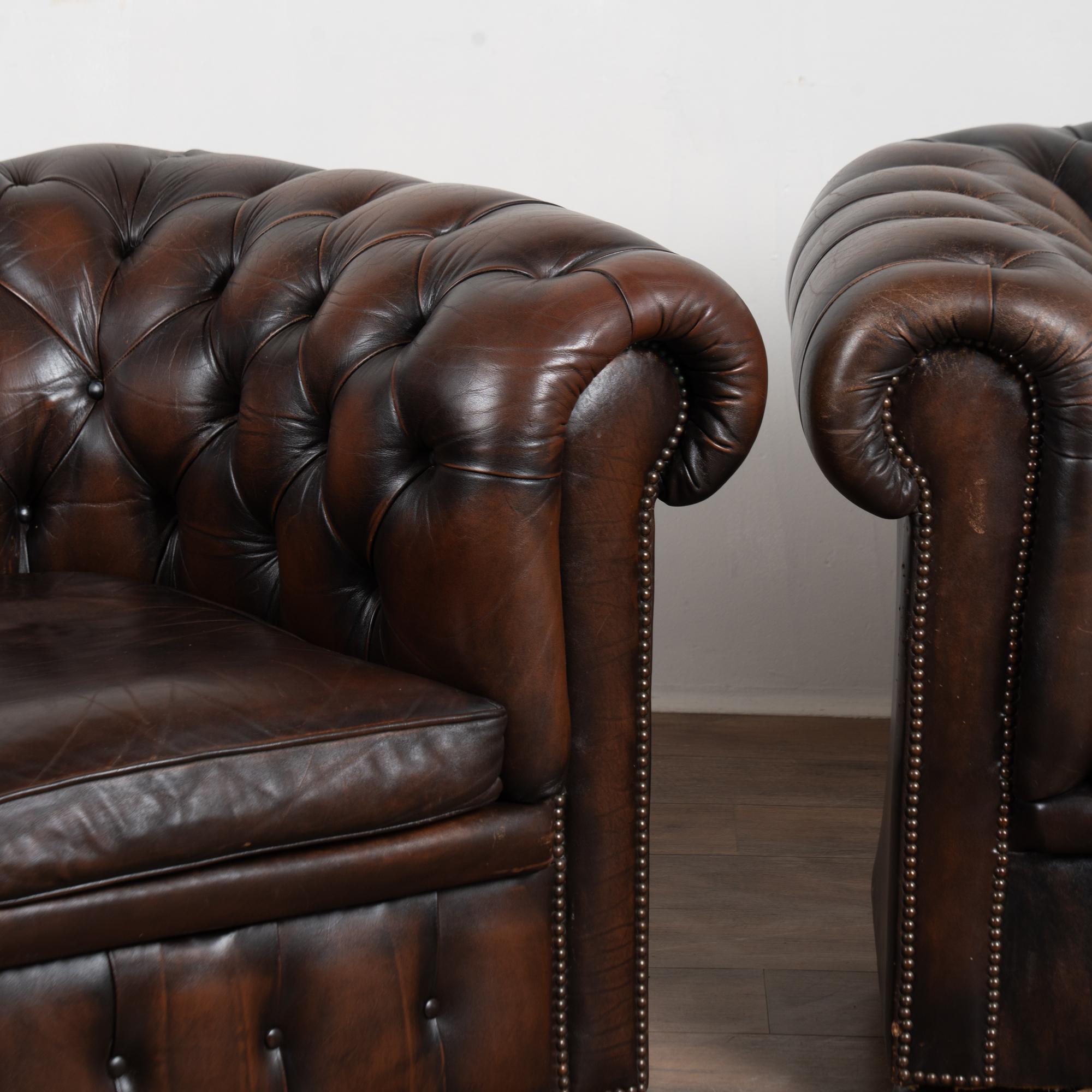 Pair, vintage brown leather chesterfield club arm chairs resting on bun feet.