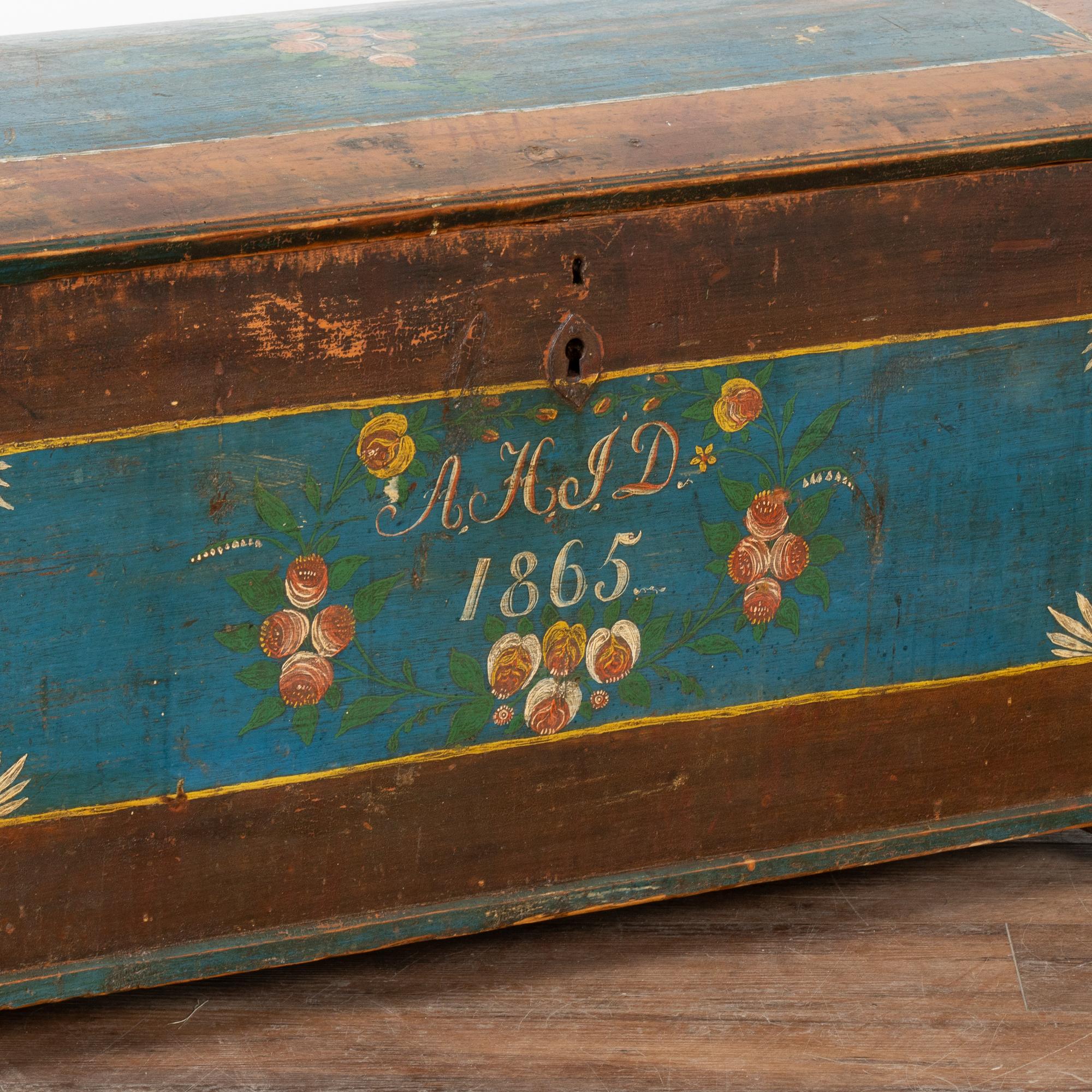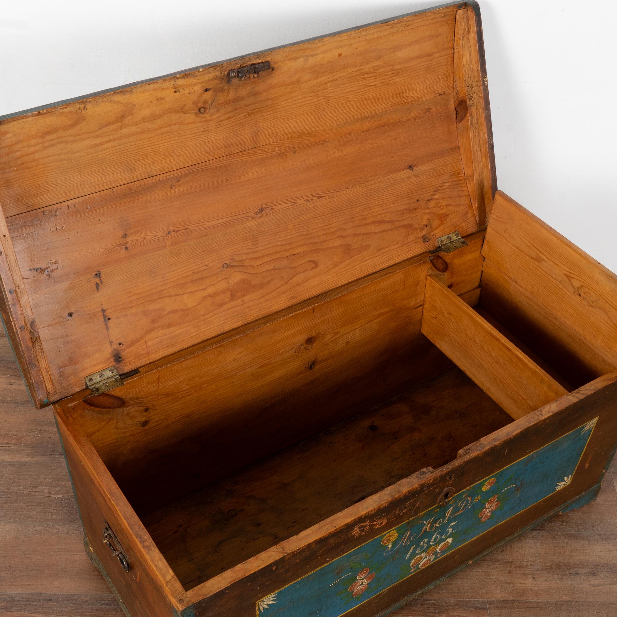 The original brown finish provides a great background to highlight the blued painted panels of flowers along the front and top. Generations of use are reflected in the distress to the finish, many areas revealing the natural pine wood below.