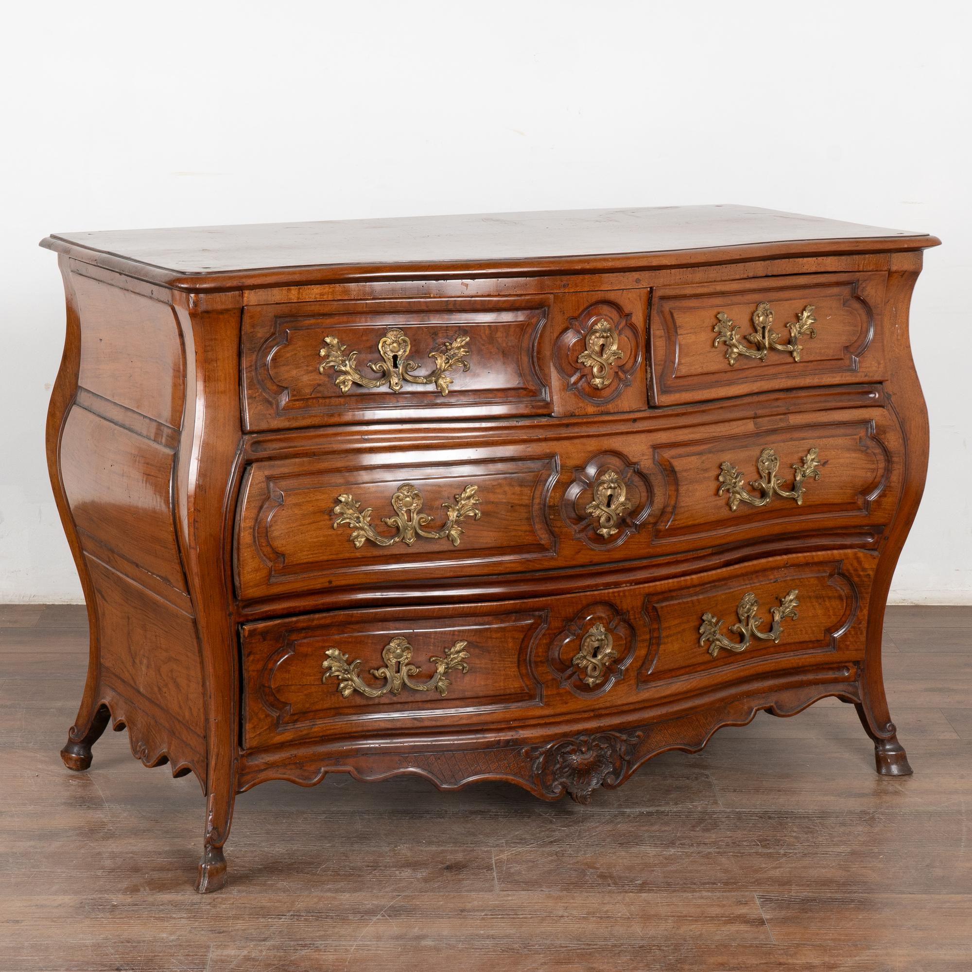 French walnut rococo three drawer commode with graceful curved front and sides resting on carved feet.