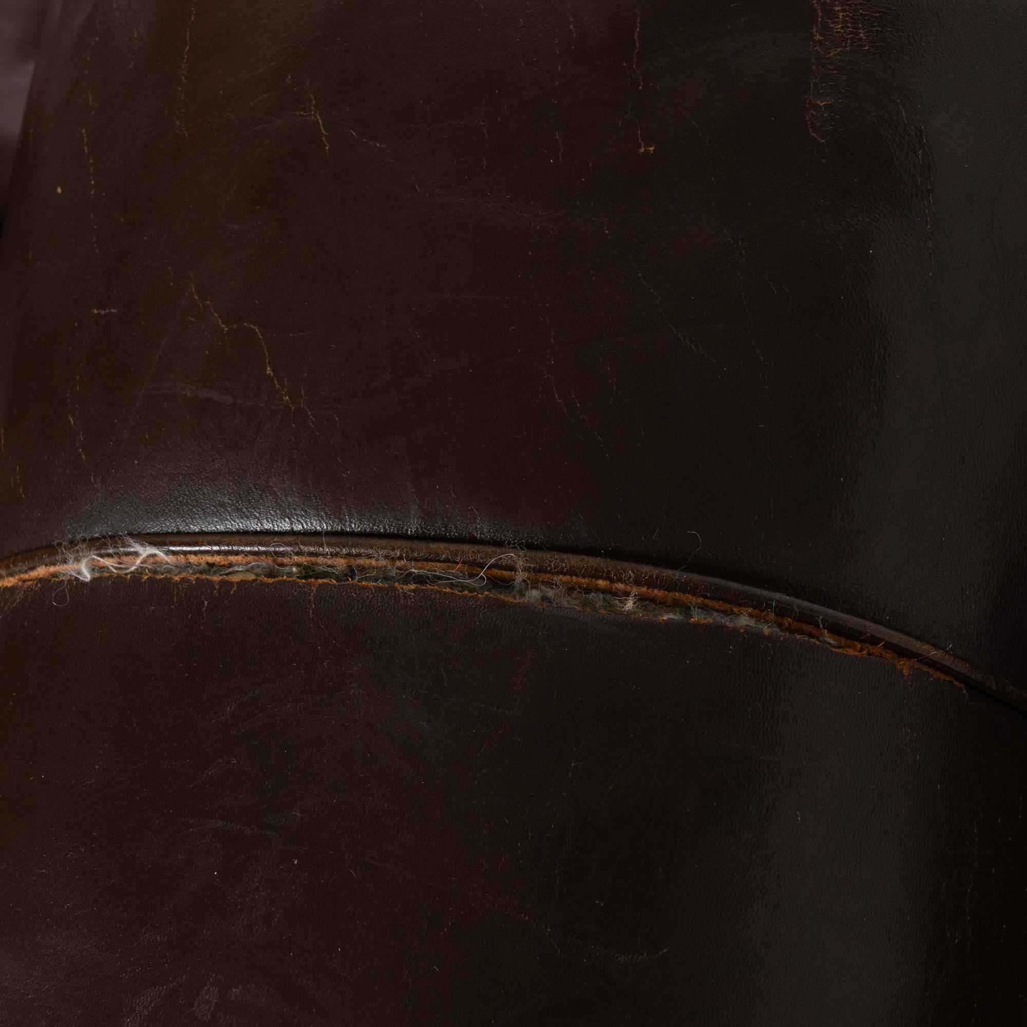 This pair shows signs of typical age and wear to the dark brown leather including scratches, stains, scuffs, impressions, etc. Extensive wear with cracking and impressions seen in the seat. A split to seam along chair arm is notable. The leather will likely benefit from a conditioner/cleaner which we leave to the discretion of the buyer.