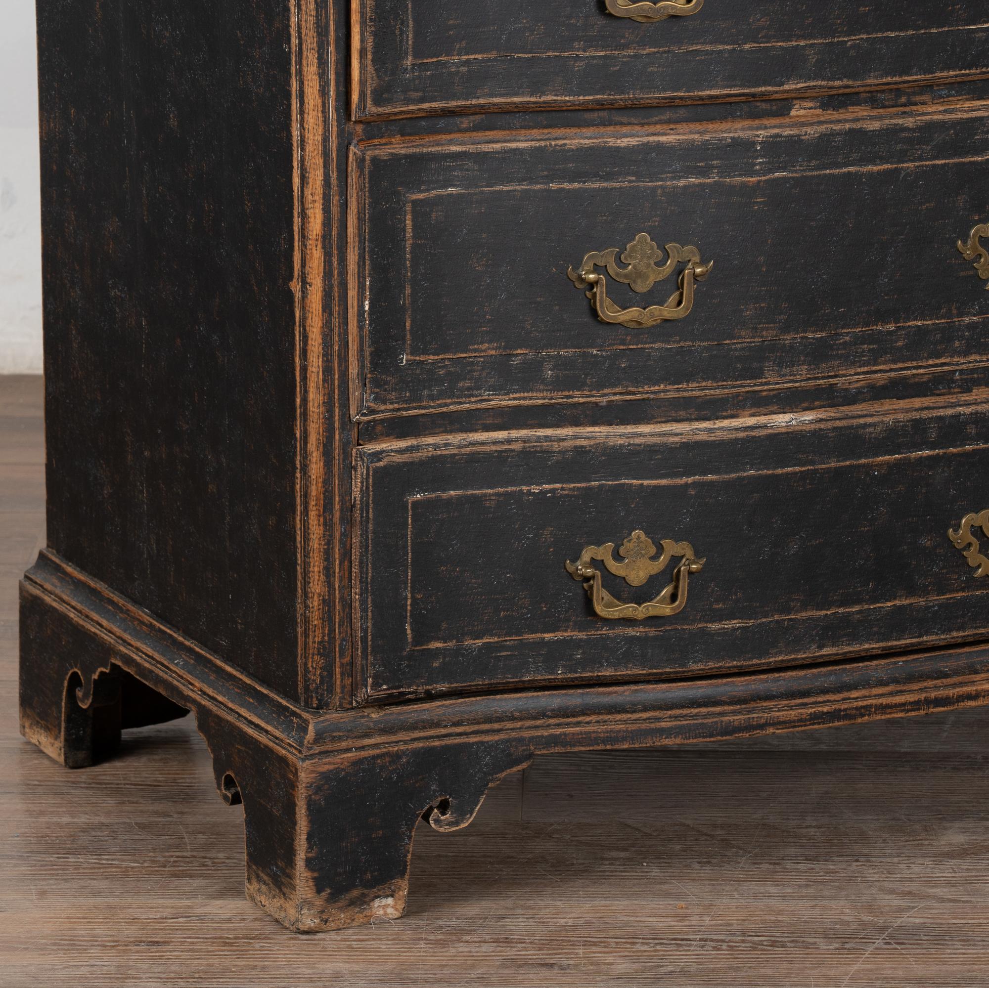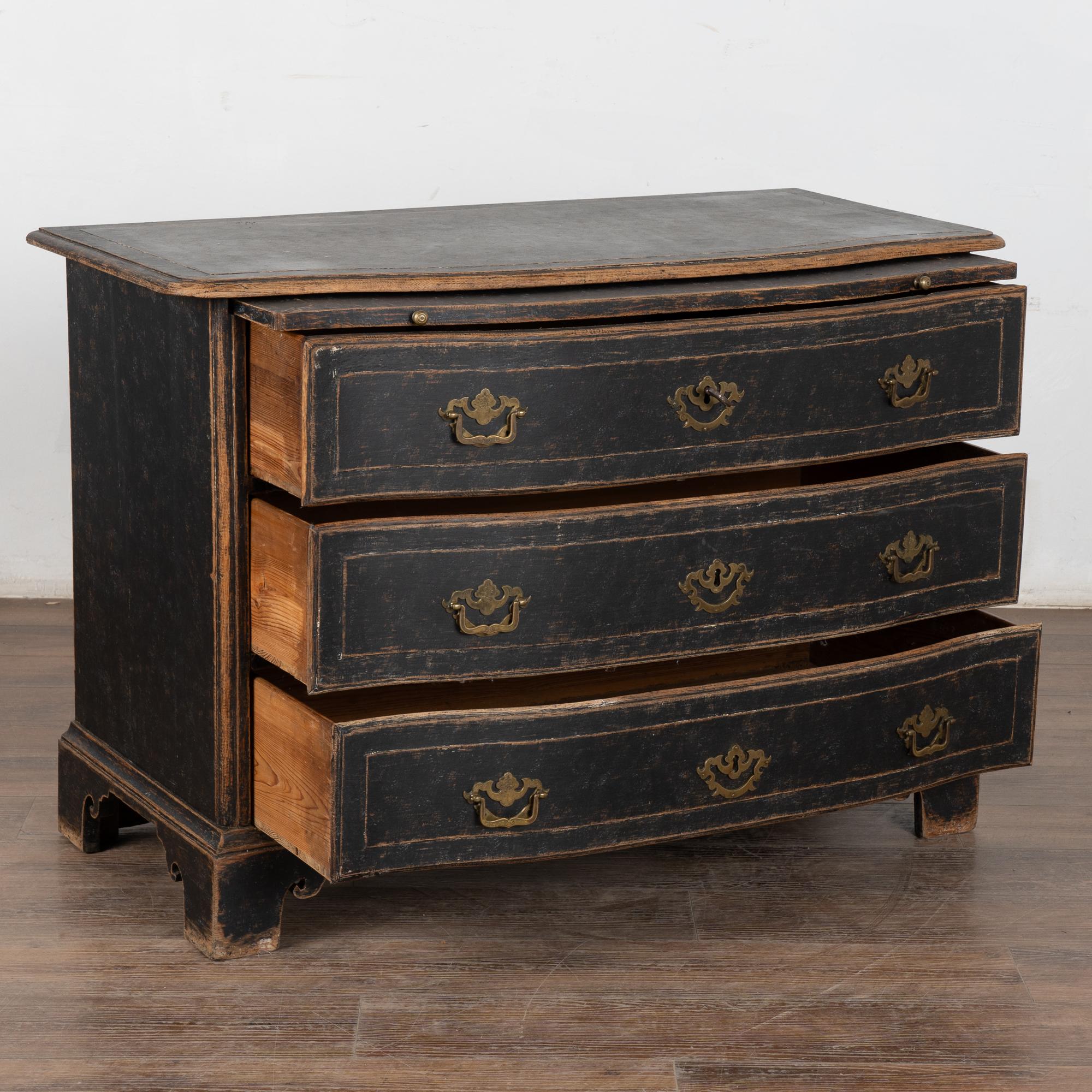 Antique baroque chest of three drawers from Sweden, circa 1800's. The black painted finish has been lightly scraped exposing the natural wood beneath and highlighting the details of the casework.