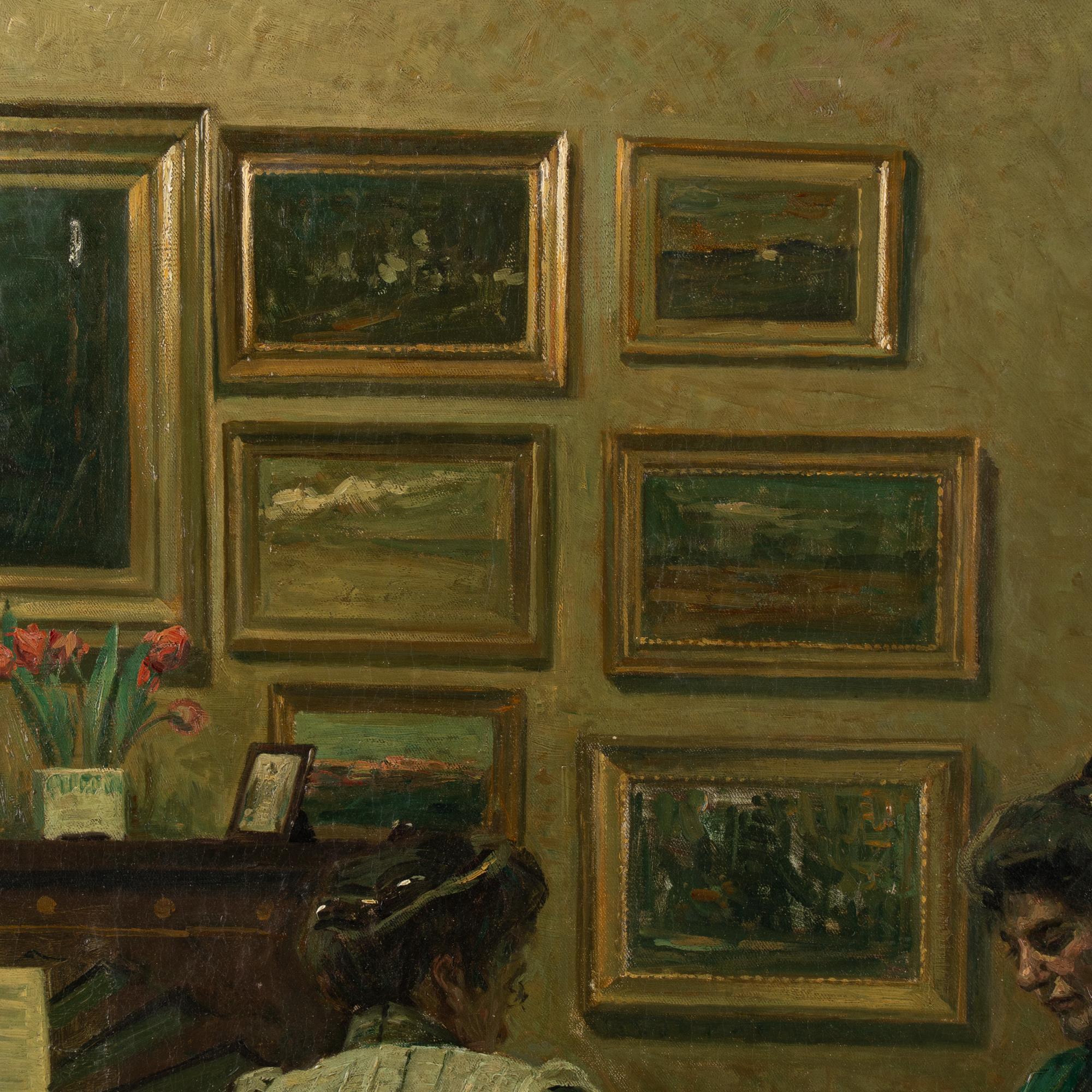 Original oil on canvas painting of Interior with two women at a card table. Signed and dated Fritz Kraul 1912.