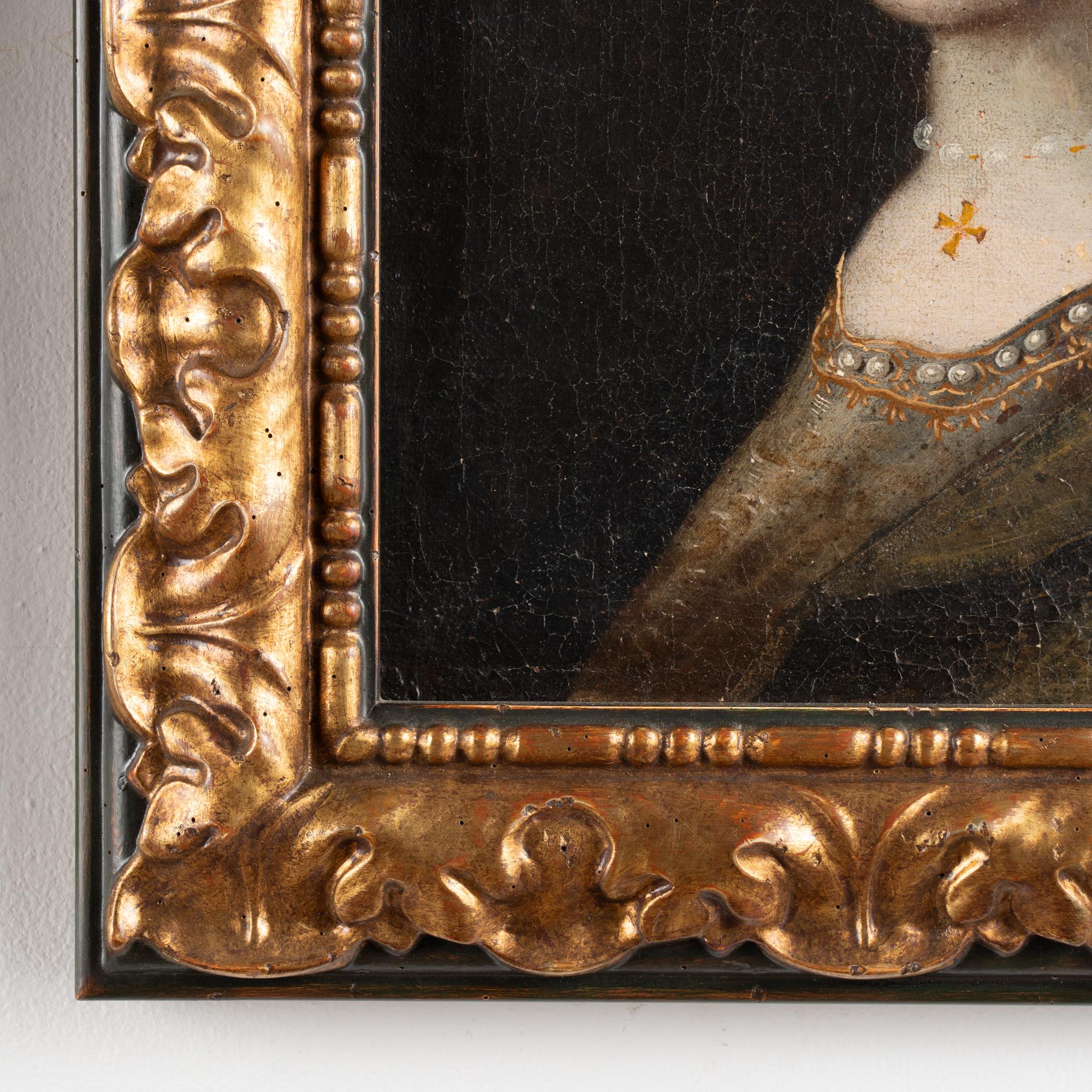 Original oil on canvas, a pair of portraits of a young woman with pearl necklace and a young man in a golden embroidered red cape. Unsigned.