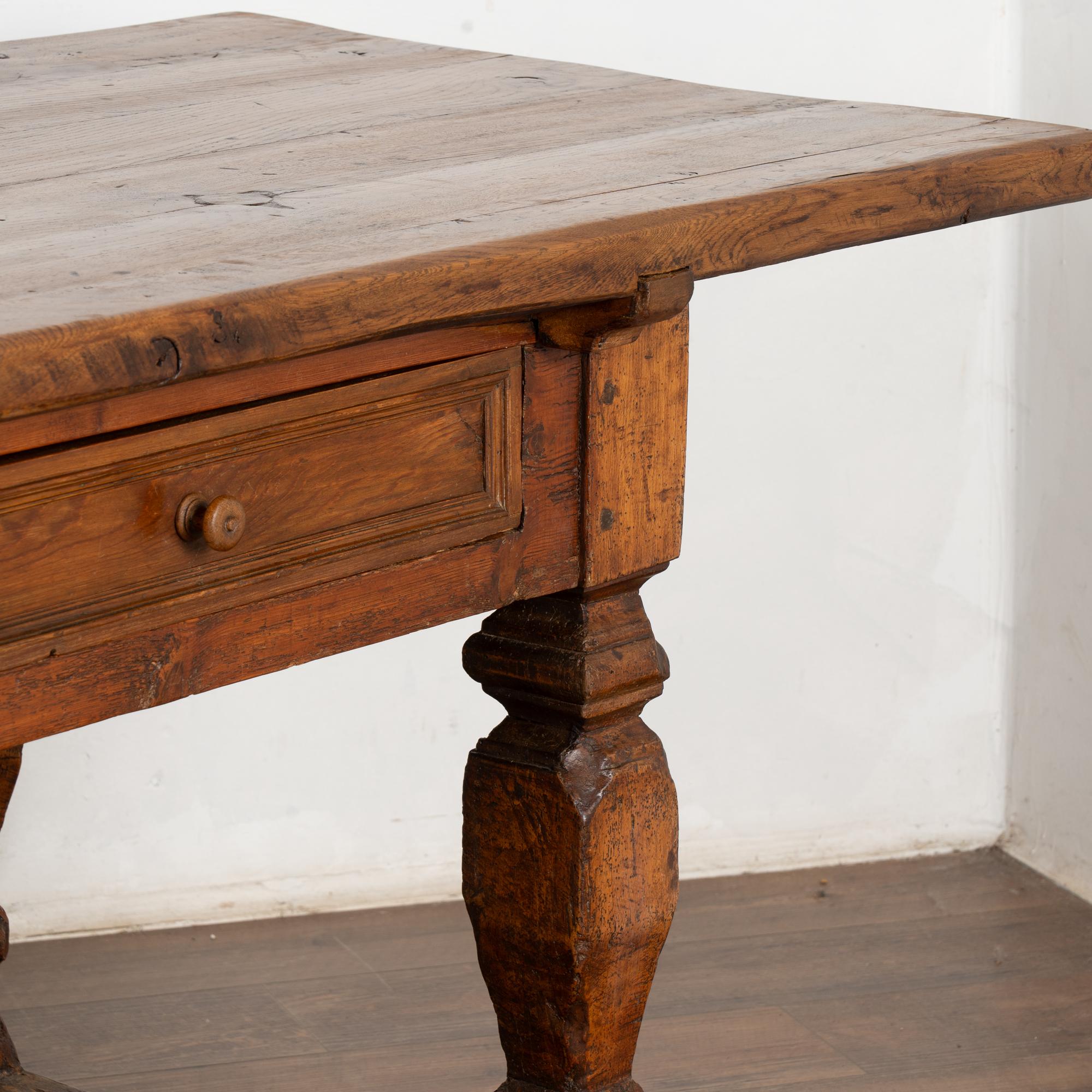 This handsome baroque oak library table with two functioning drawers has heavy turned legs and lower stretcher.