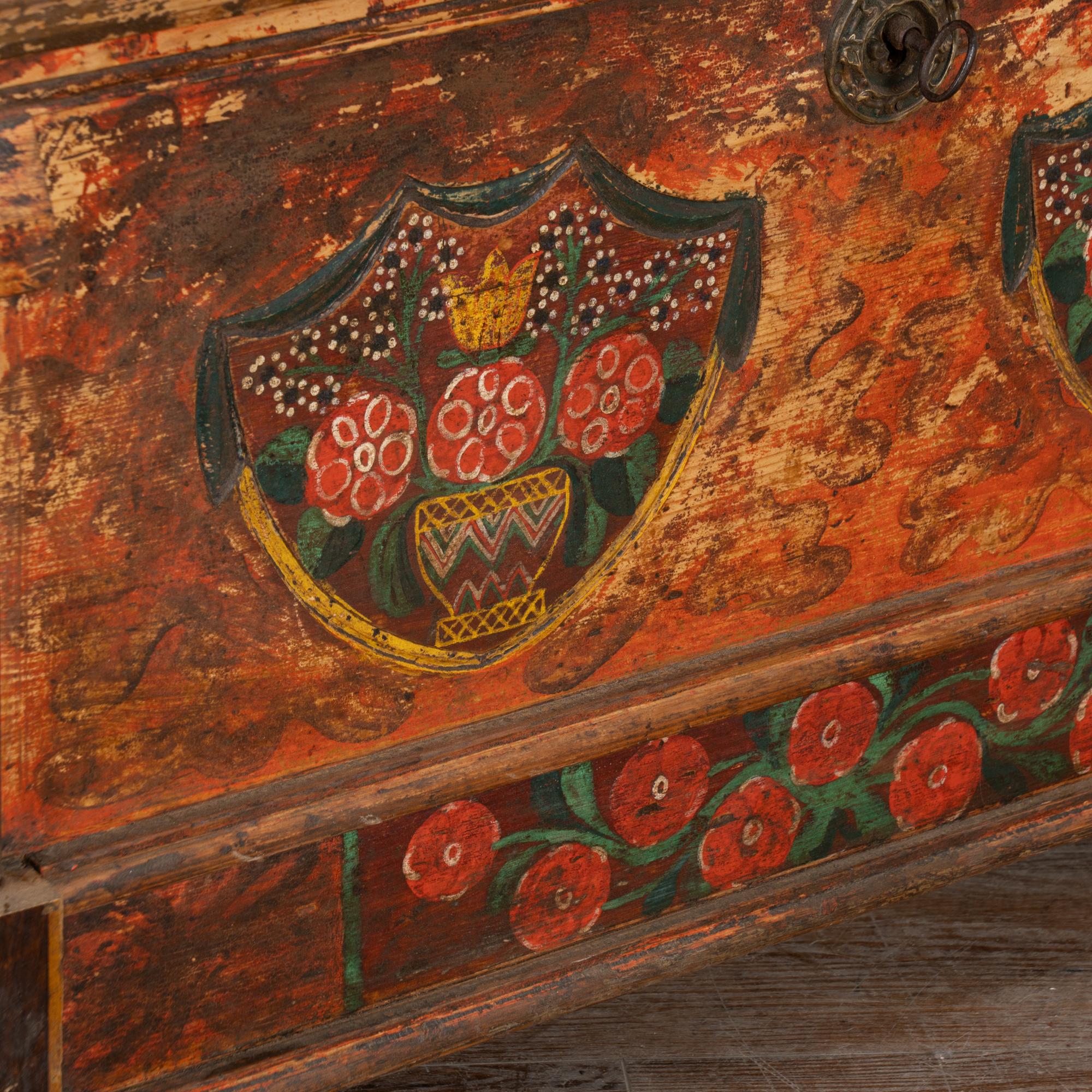 The colorful paint is all original on this beautiful flat top trunk. Flowers were a traditional embellishment as seen on the front of this handcrafted trunk with red, orange, green, yellow floral details.