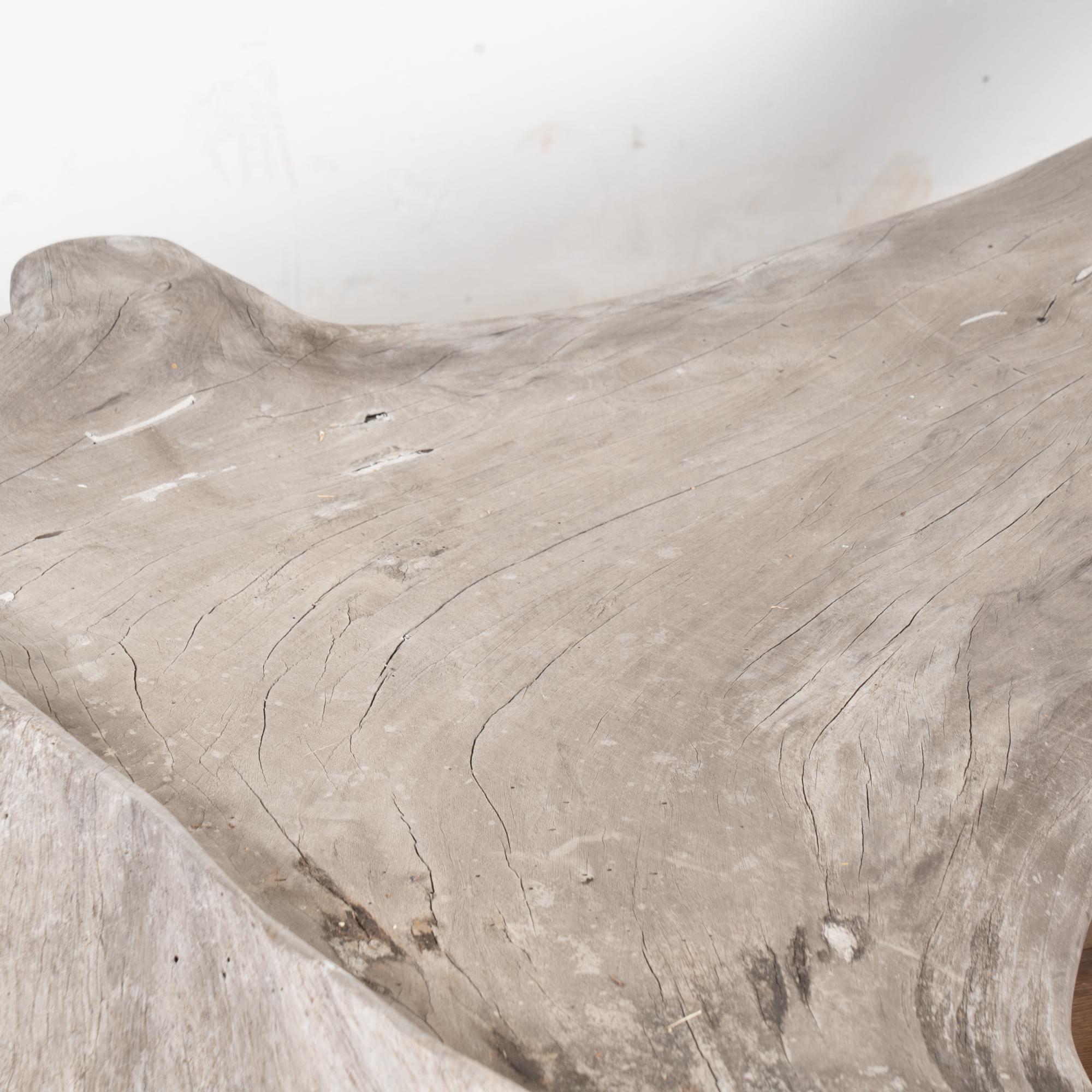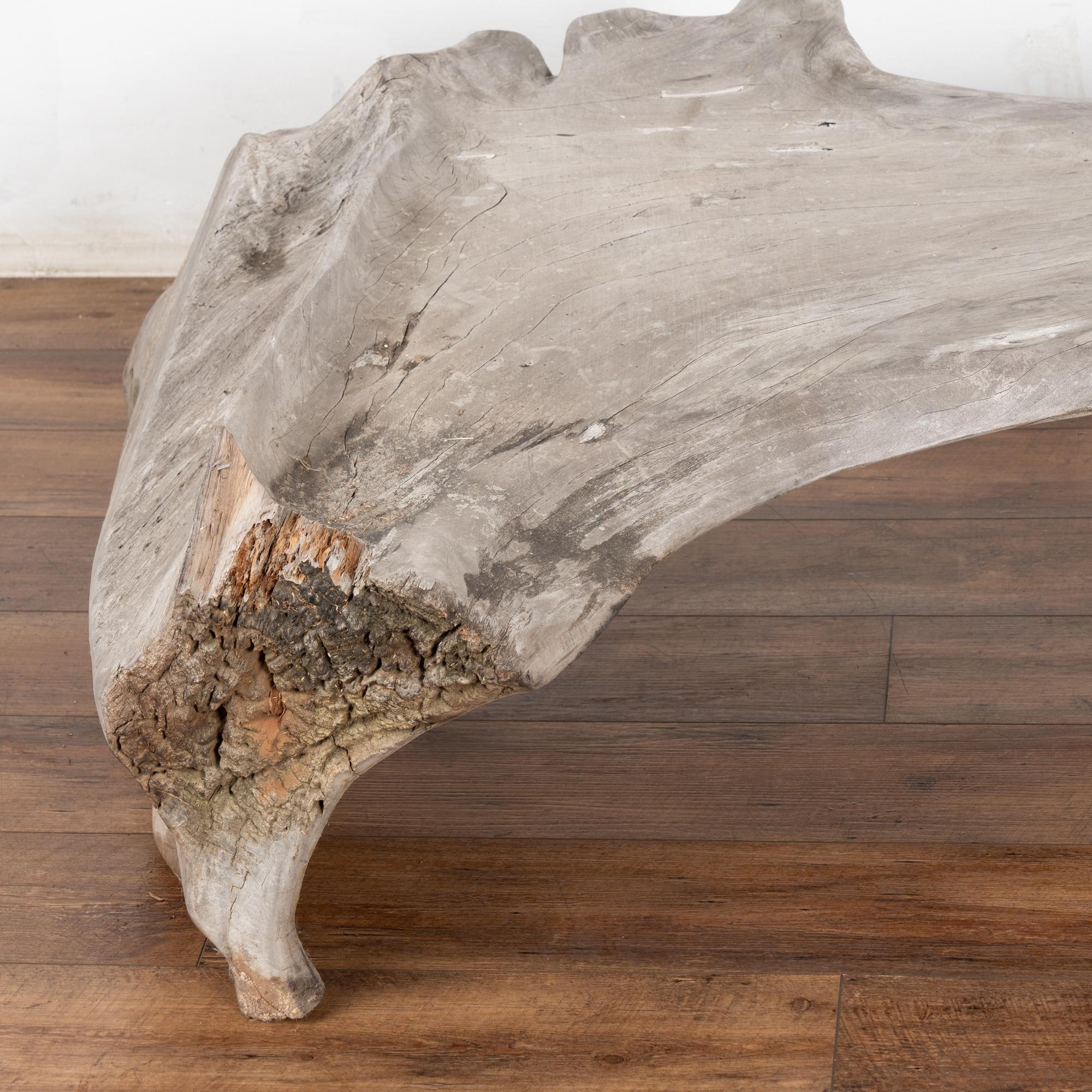 Worn and weathered through the elements, the seat of this teak root bench is one solid piece of wood, with the left end curving downward creating the leg.