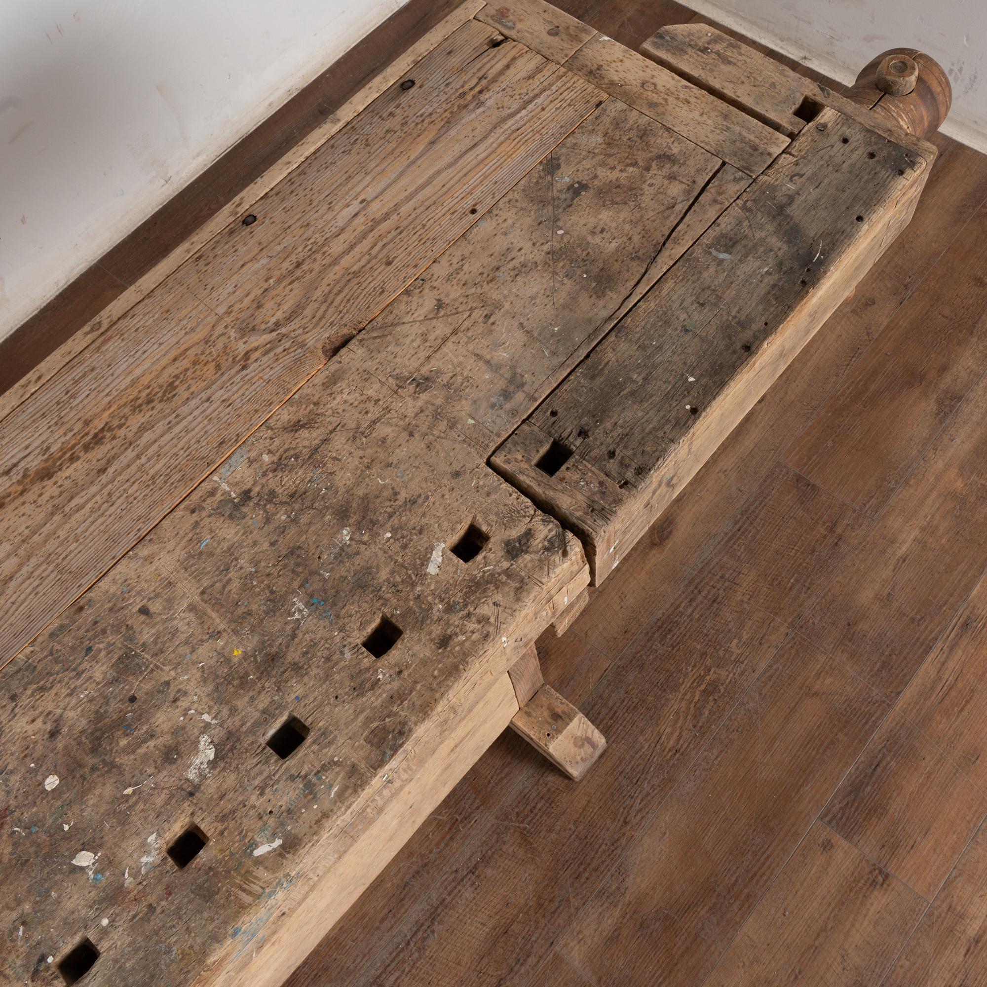 It has one vice with wood handle and a long 6.5' top filled with gouges, stains, paint spills and more, all reflecting generations of use. Please examine the close up photos to appreciate the patina, joints and old hardware.