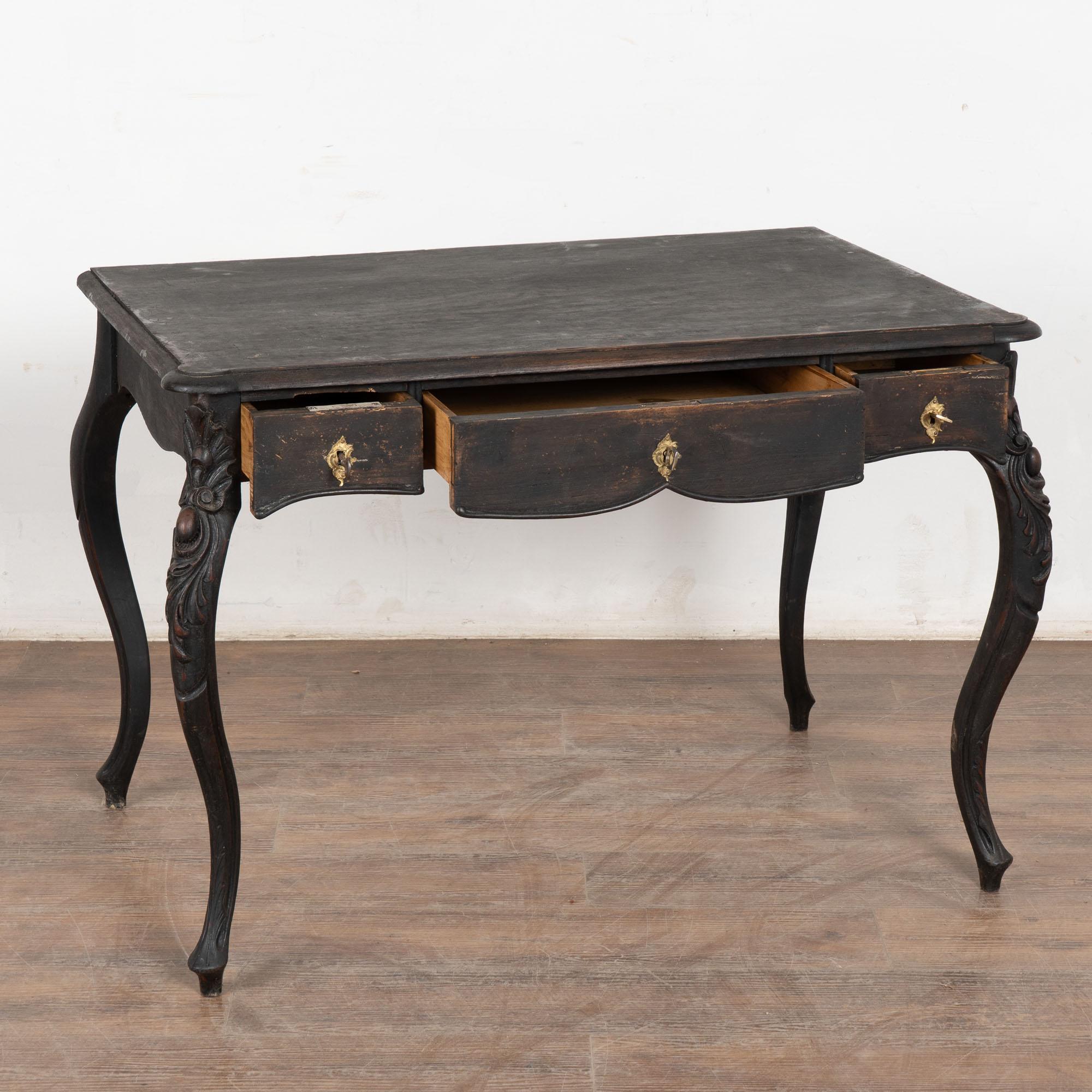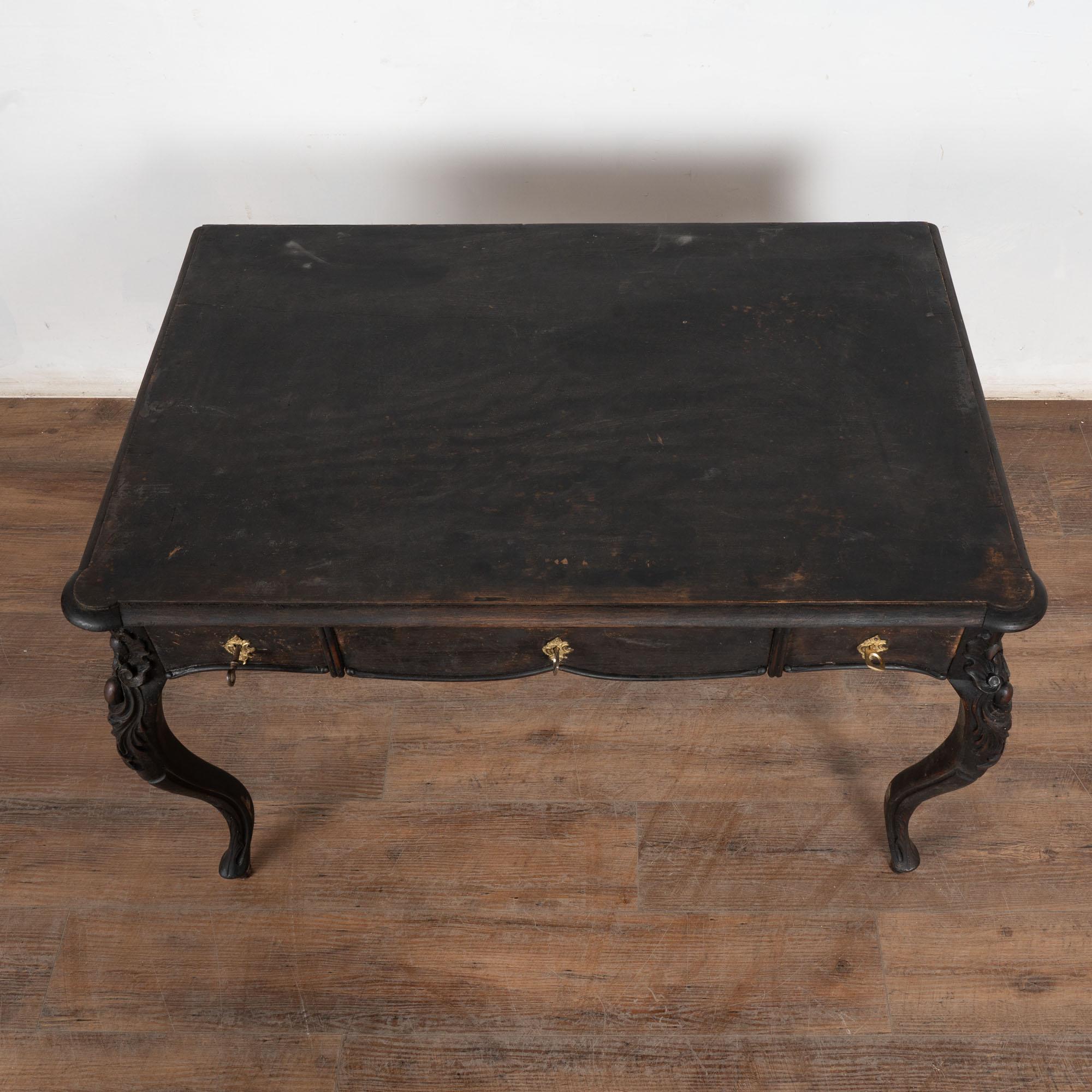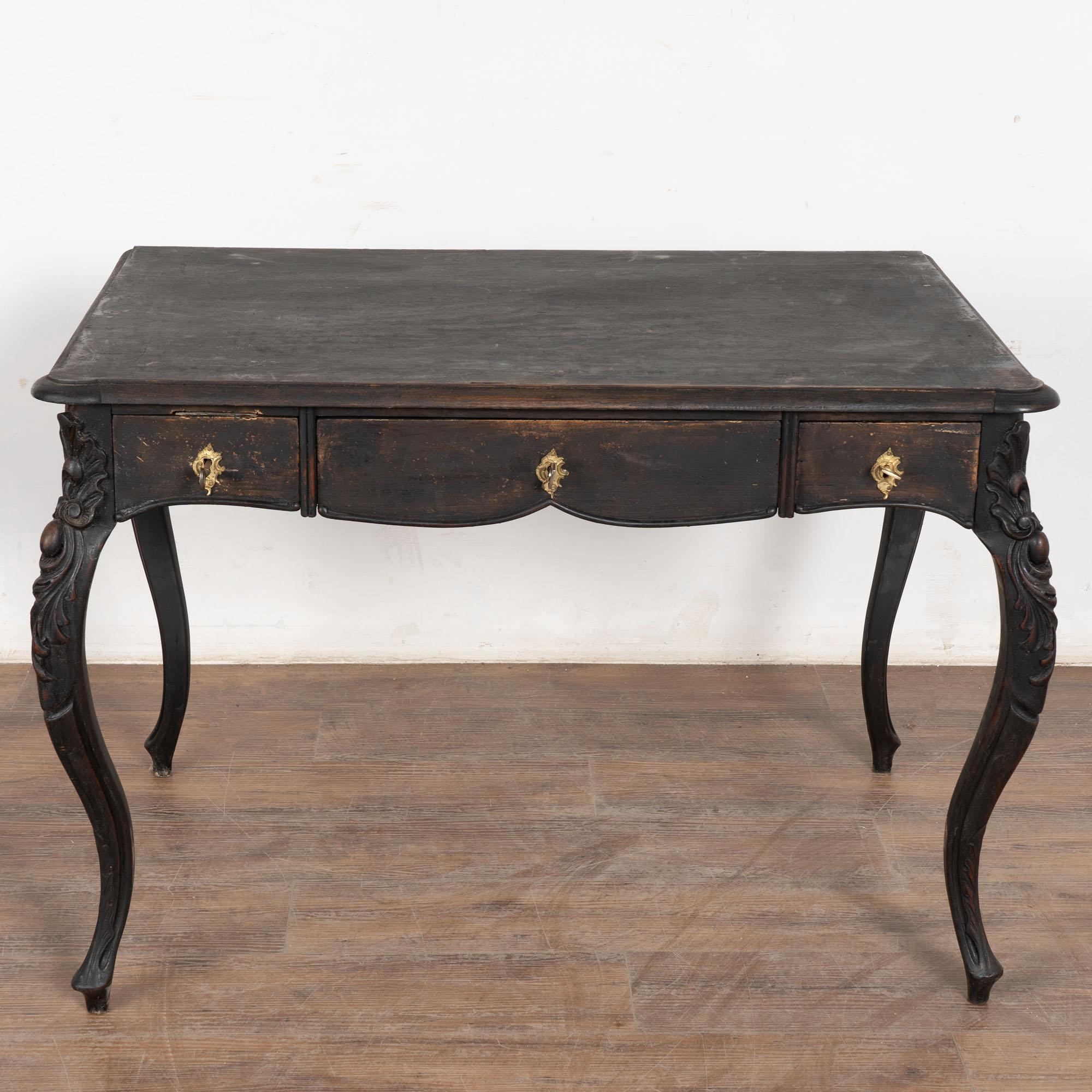 Late 19th-century Swedish pine desk with an old black painted finish that has been distressed over time.The desk features elongated carved cabriole legs and three functional drawers. Locks and key are present, though operation may be stiff.