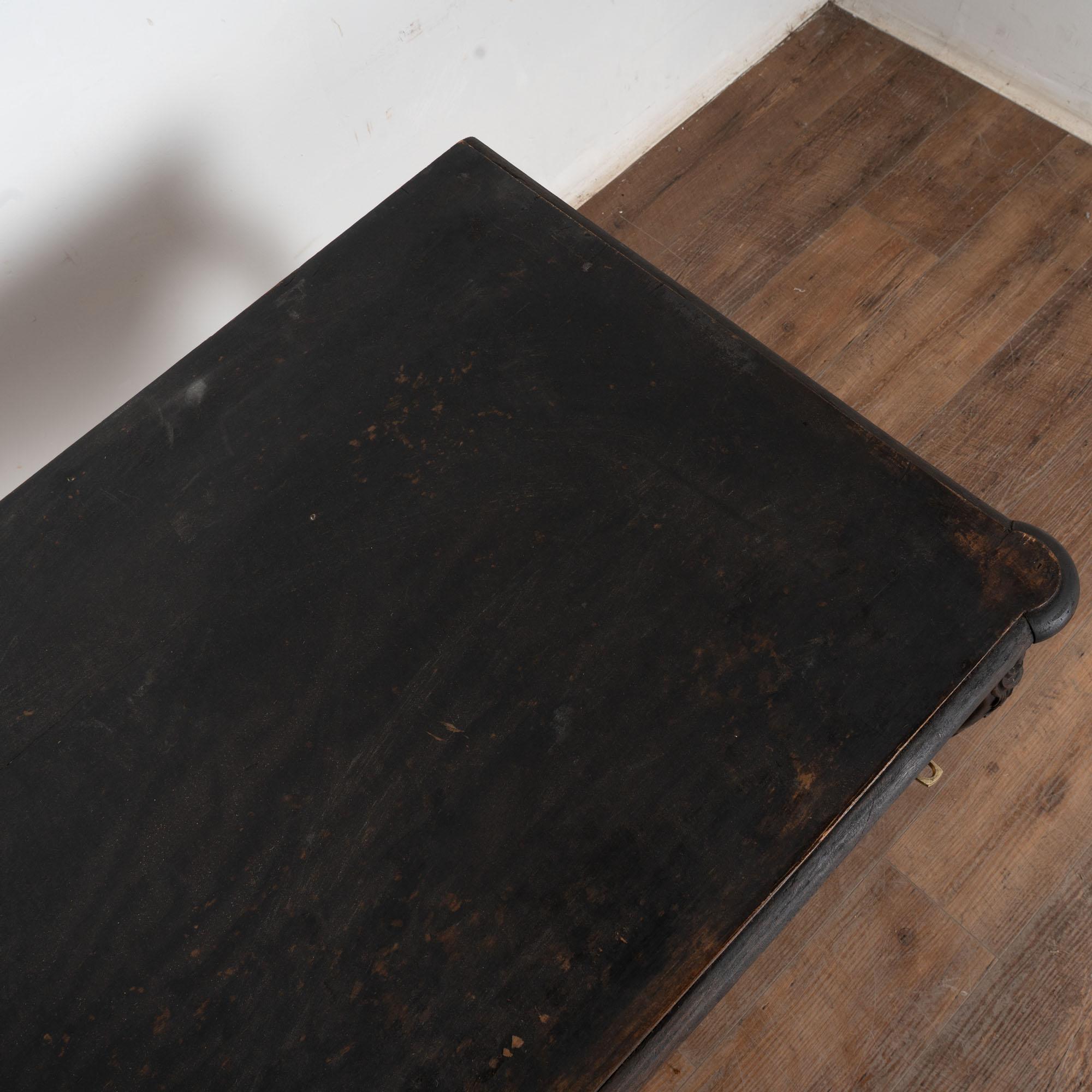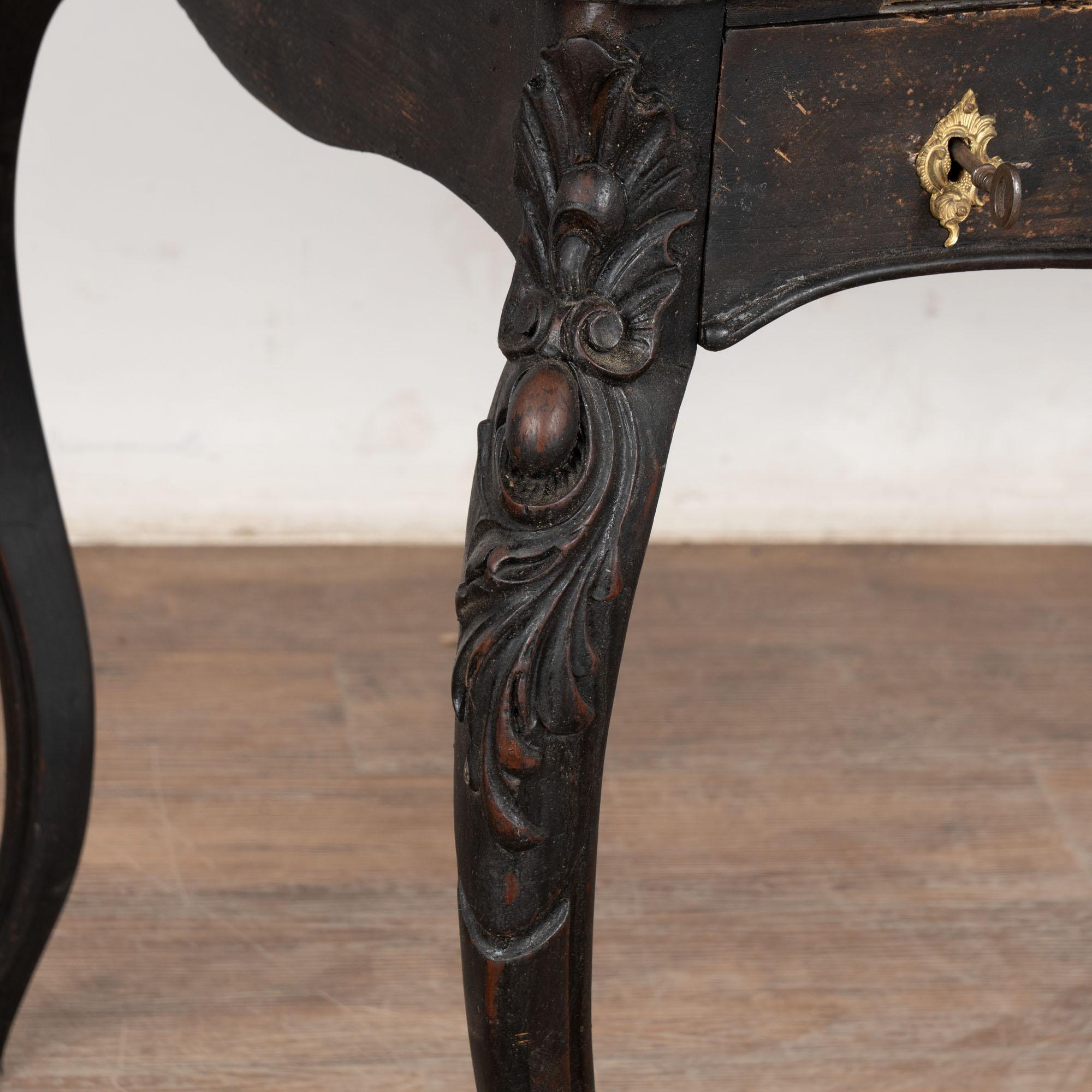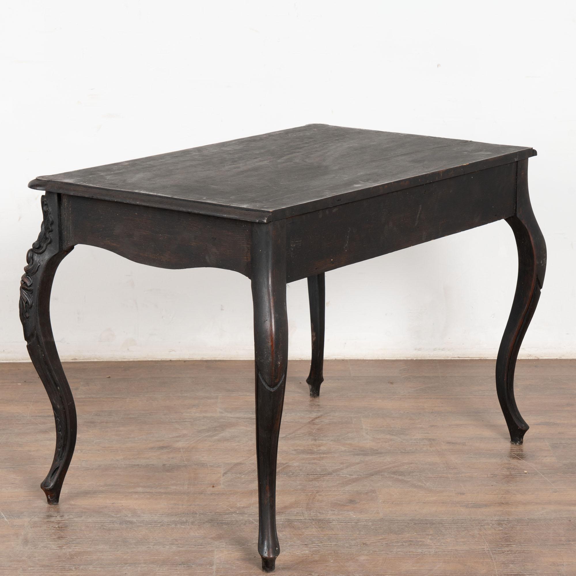 Late 19th-century Swedish pine desk with an old black painted finish that has been distressed over time.The desk features elongated carved cabriole legs and three functional drawers. Locks and key are present, though operation may be stiff.